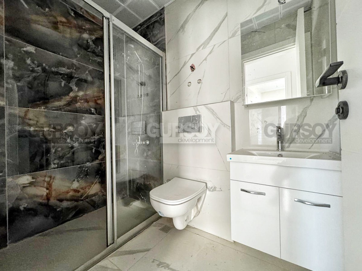 Квартира без мебели, планировка 1+1 — одна спальня и одна гостиная, один санузел с душевой кабиной и туалетом, общая площадь — 55 кв.м, расположена на 2-м этаже, здание построено в 2023 году.