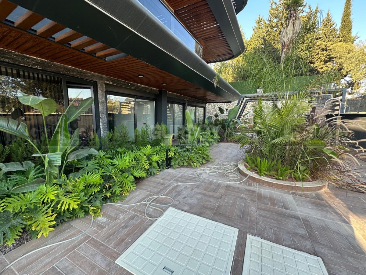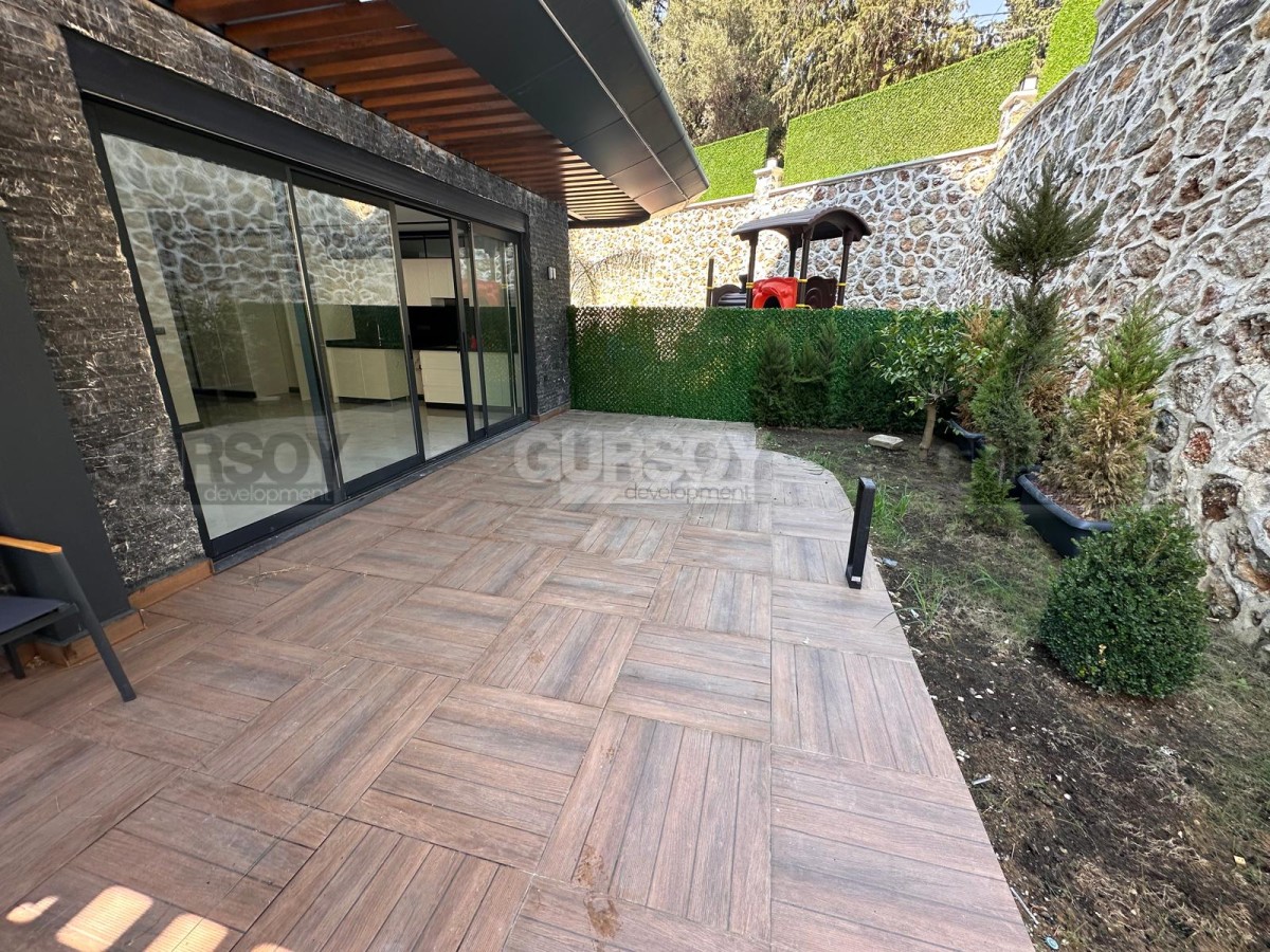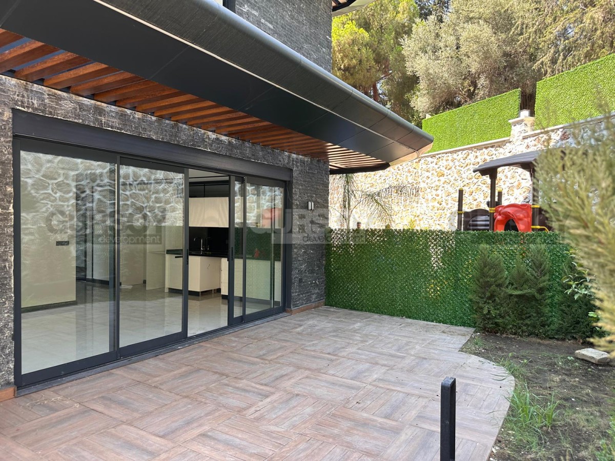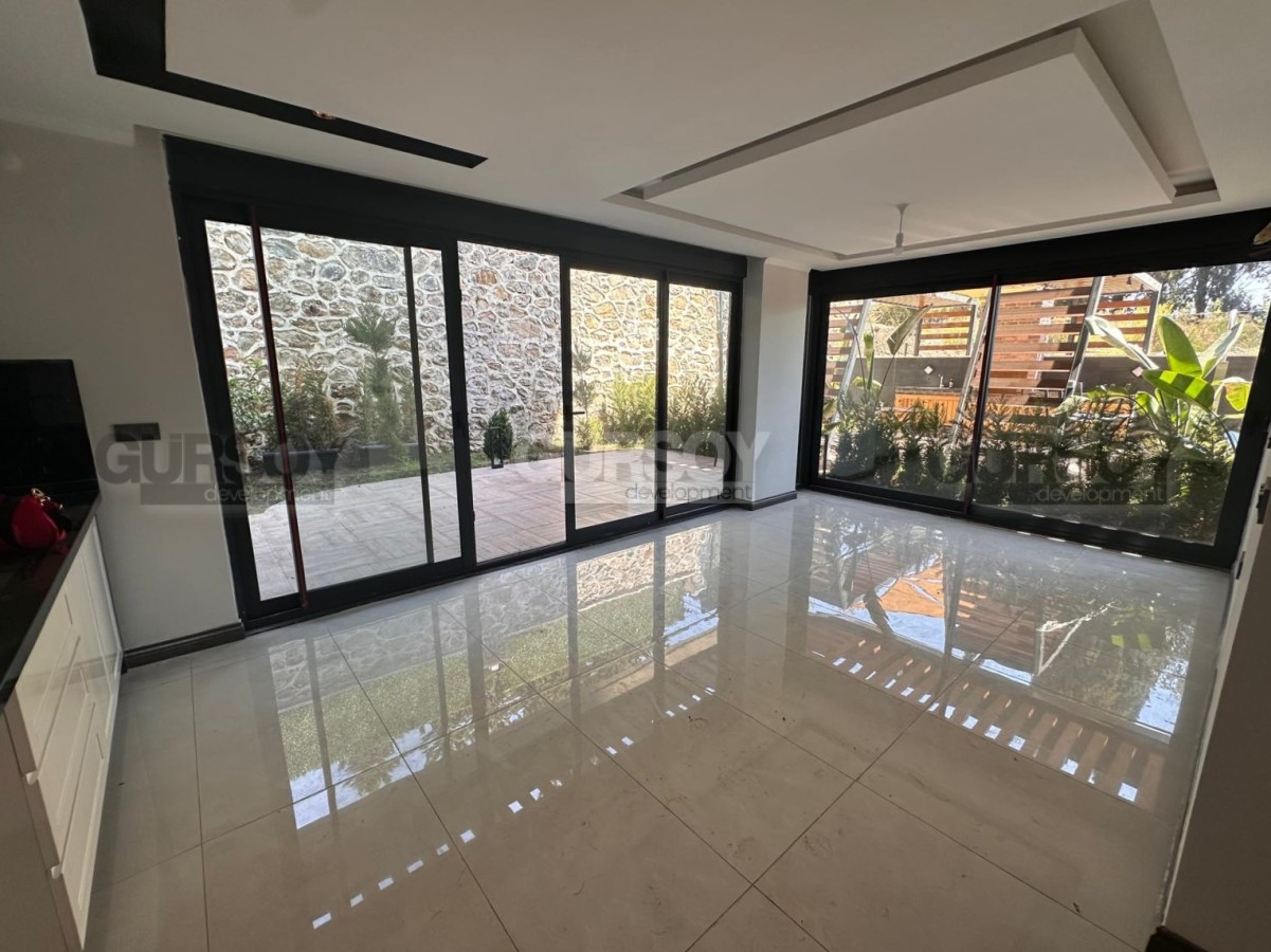 В продаже просторная квартира 2+1 с собственным садом общей площадью 140 м², расположенная в новом жилом комплексе 2024 года постройки. Квартира новая, без мебели, что даёт возможность обустроить пространство полностью по своему вкусу. Планировка включает гостиную с кухней, две спальни, ванную комнату, отдельный WC и выход в собственный сад. Окна ориентированы на юг и восток, с видом на бассейн и территорию комплекса.