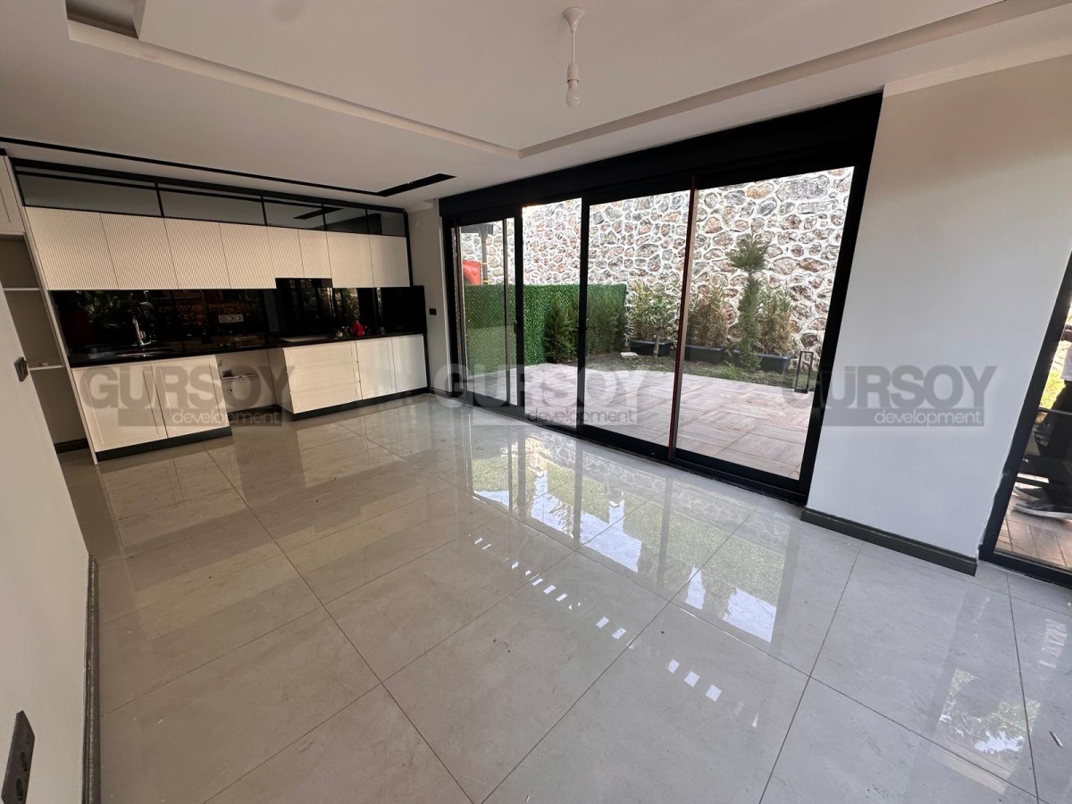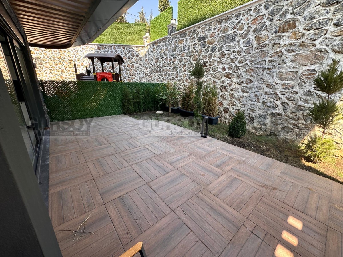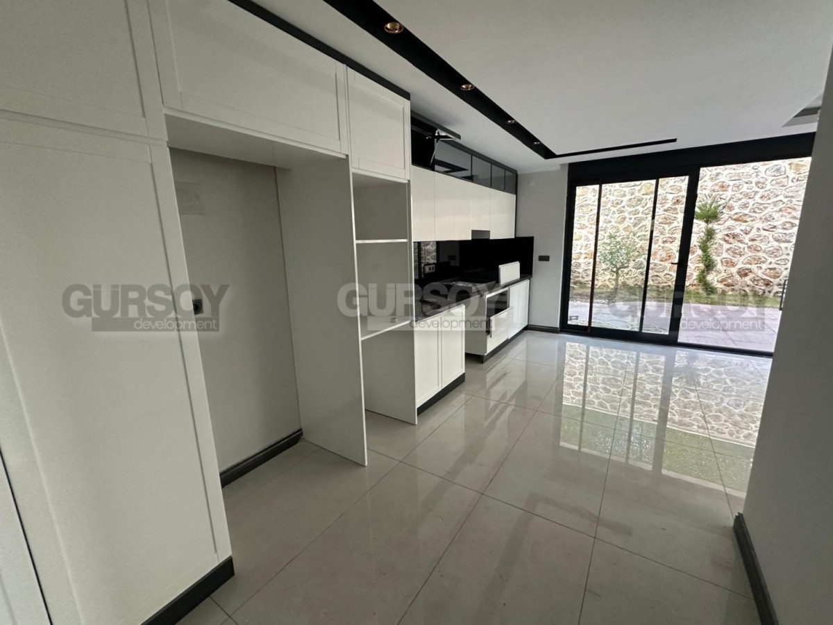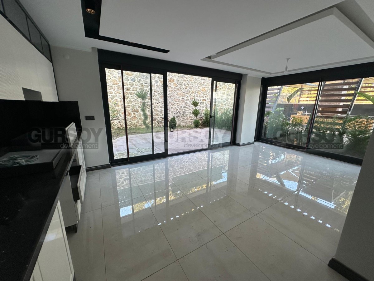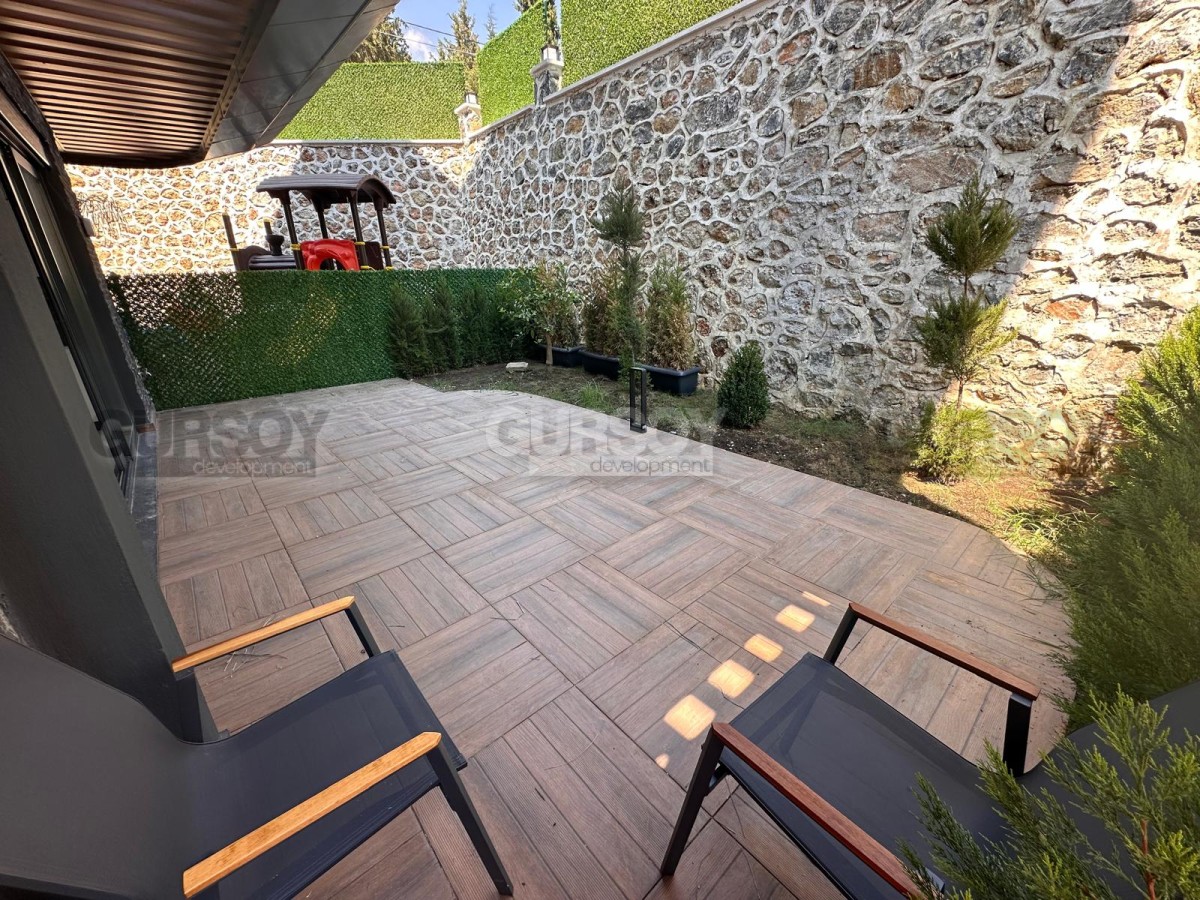 В продаже просторная квартира 2+1 с собственным садом общей площадью 140 м², расположенная в новом жилом комплексе 2024 года постройки. Квартира новая, без мебели, что даёт возможность обустроить пространство полностью по своему вкусу. Планировка включает гостиную с кухней, две спальни, ванную комнату, отдельный WC и выход в собственный сад. Окна ориентированы на юг и восток, с видом на бассейн и территорию комплекса.