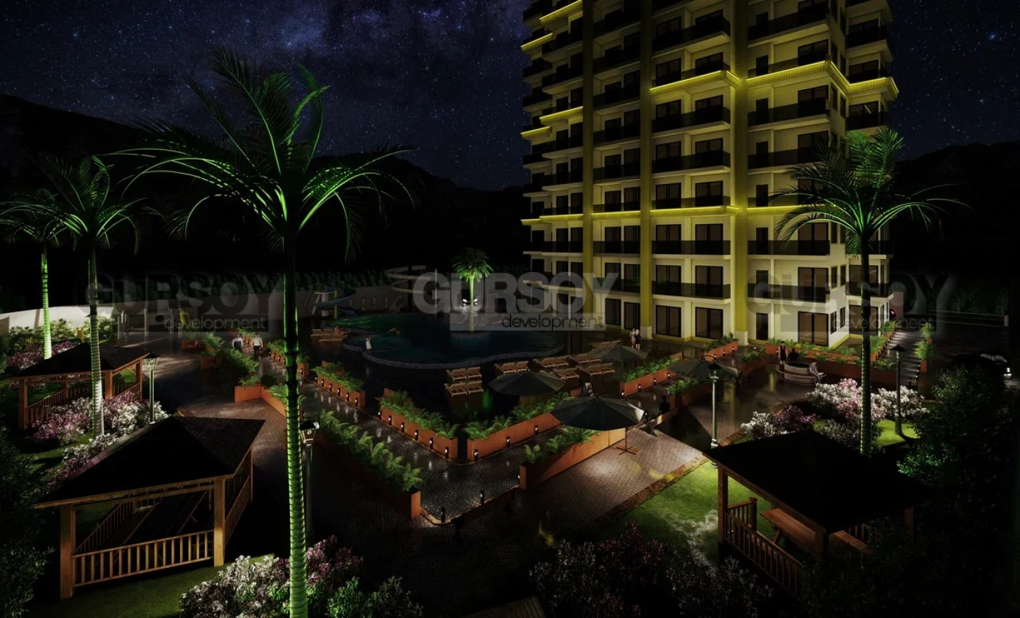 На продажу представлены апартаменты 1+1 в комплексе отельного типа в районе Махмутлар. Комплекс, который будет завершен в июле 2023 года, предлагает удобства, необходимые для комфортного проживания. На территории комплекса есть открытый плавательный бассейн, закрытый подогреваемый бассейн, фитнес, сауна, хамам и игровая детская комната. Кроме того, на территории есть парковка, беседки для отдыха и зоны барбекю. За территорией предусмотрено видеонаблюдение 24/7, что обеспечивает безопасность жильцов.