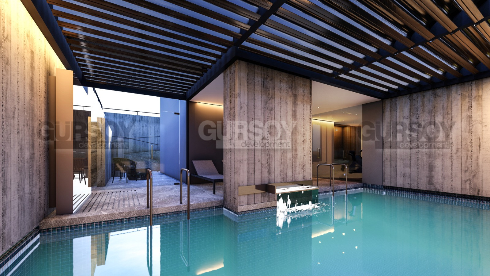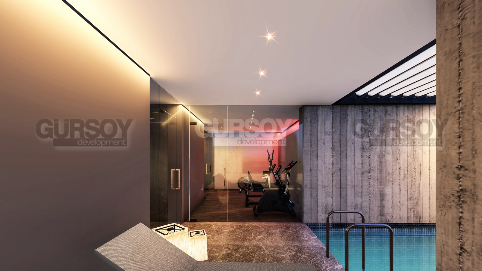Компактный комплекс вместил в себе все необходимое для комфортной жизни на берегу моря: открытый бассейн, который зимой превращается в крытый подогреваемый бассейн, сауна, тренажерный зал.