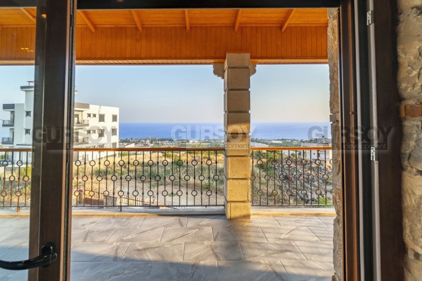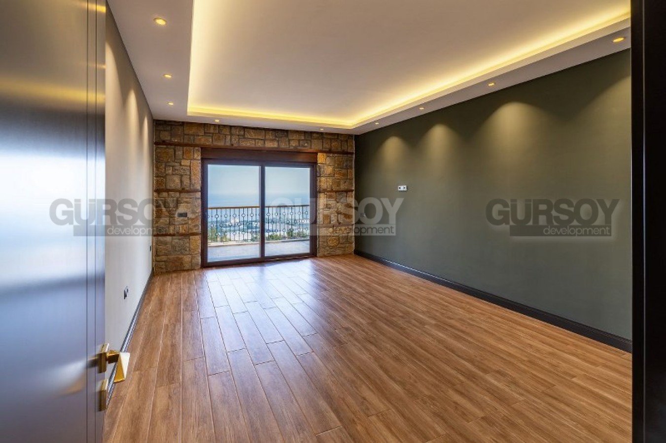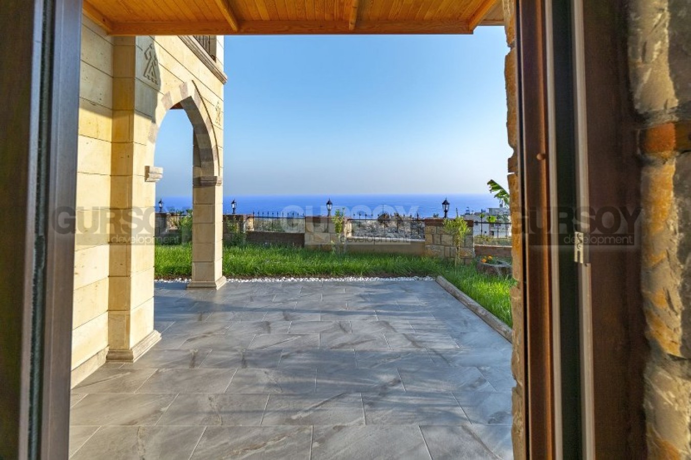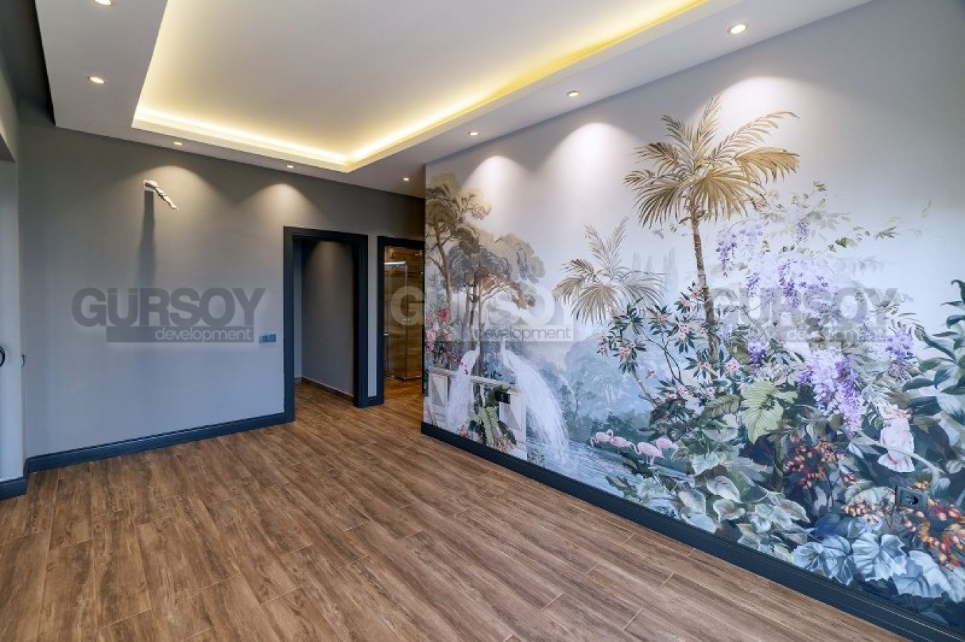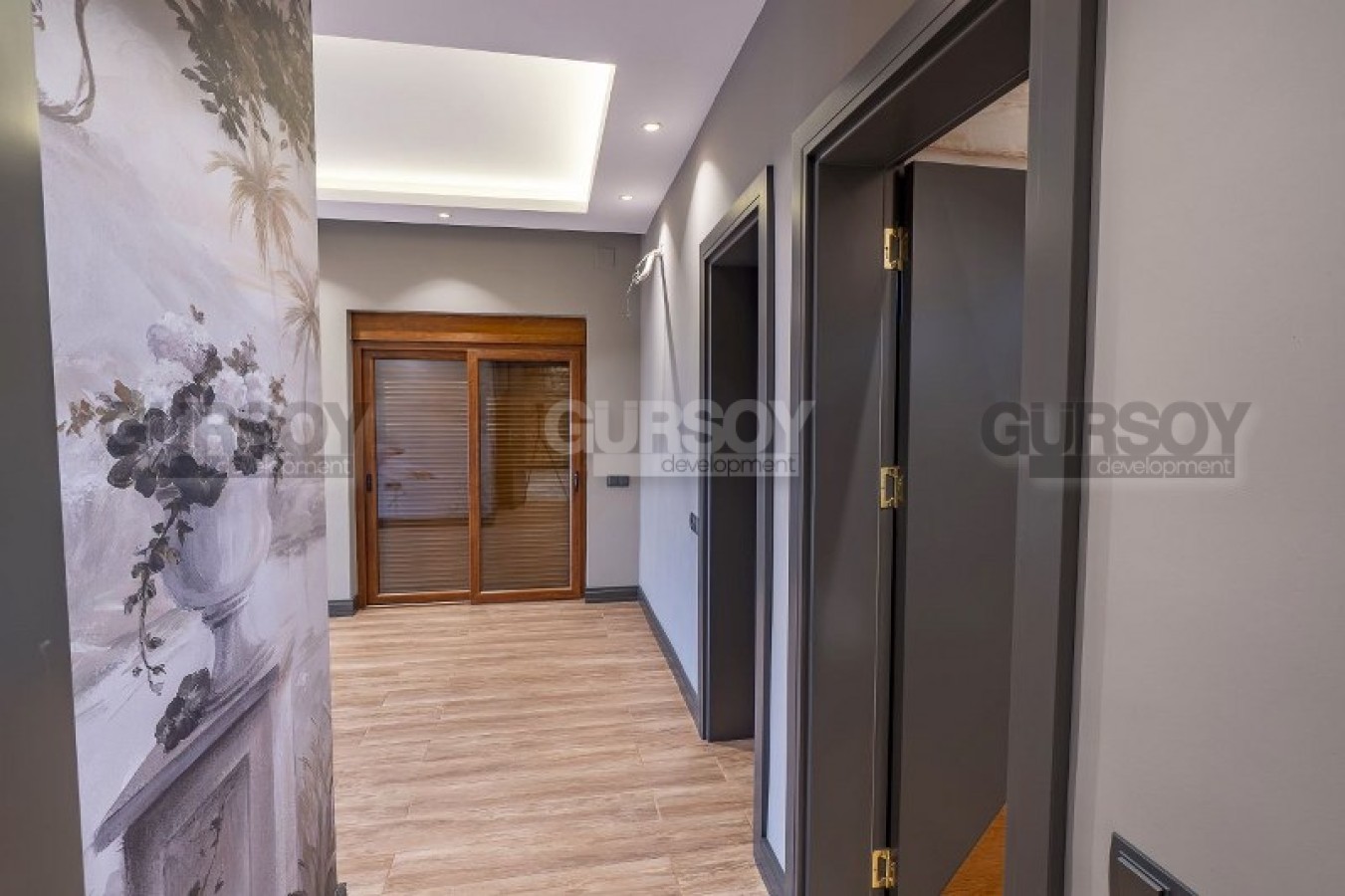 Планировка дуплекса, общей площадью 240 м2, представлена совмещенной с кухней гостиной, четырьмя спальнями, четырьмя санузлами, просторным балконом, с панорамным видом на море, и открытой террасой. На вилле установлена система «умный дом», позволяющая дистанционно управлять комфортом, на входе - видеодомофон и система внутренней связи и оповещения. Во дворе оборудован открытый бассейн, а также высажены зеленые газоны. По всему периметру участка установлено освещение, что делает особняк сказочно красивым в вечернее время.