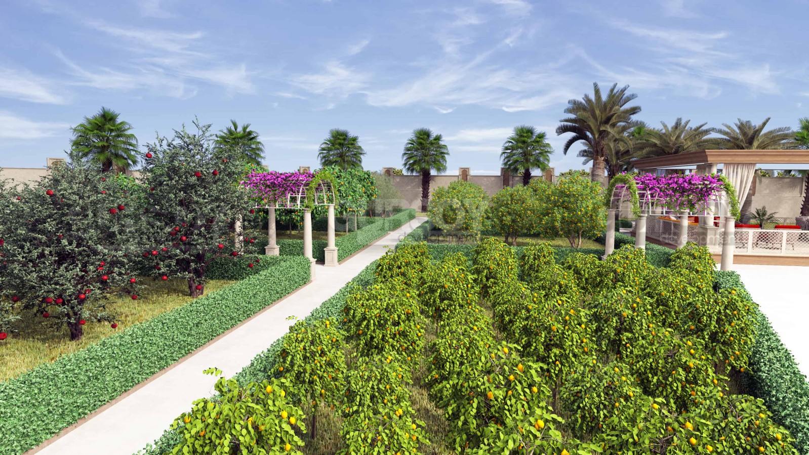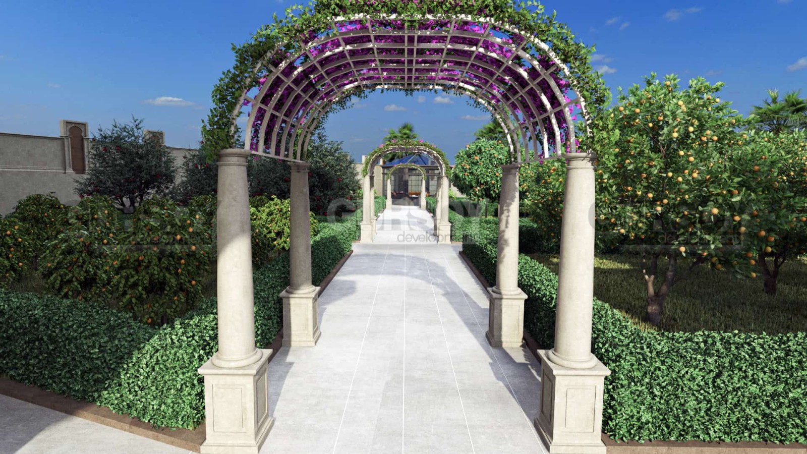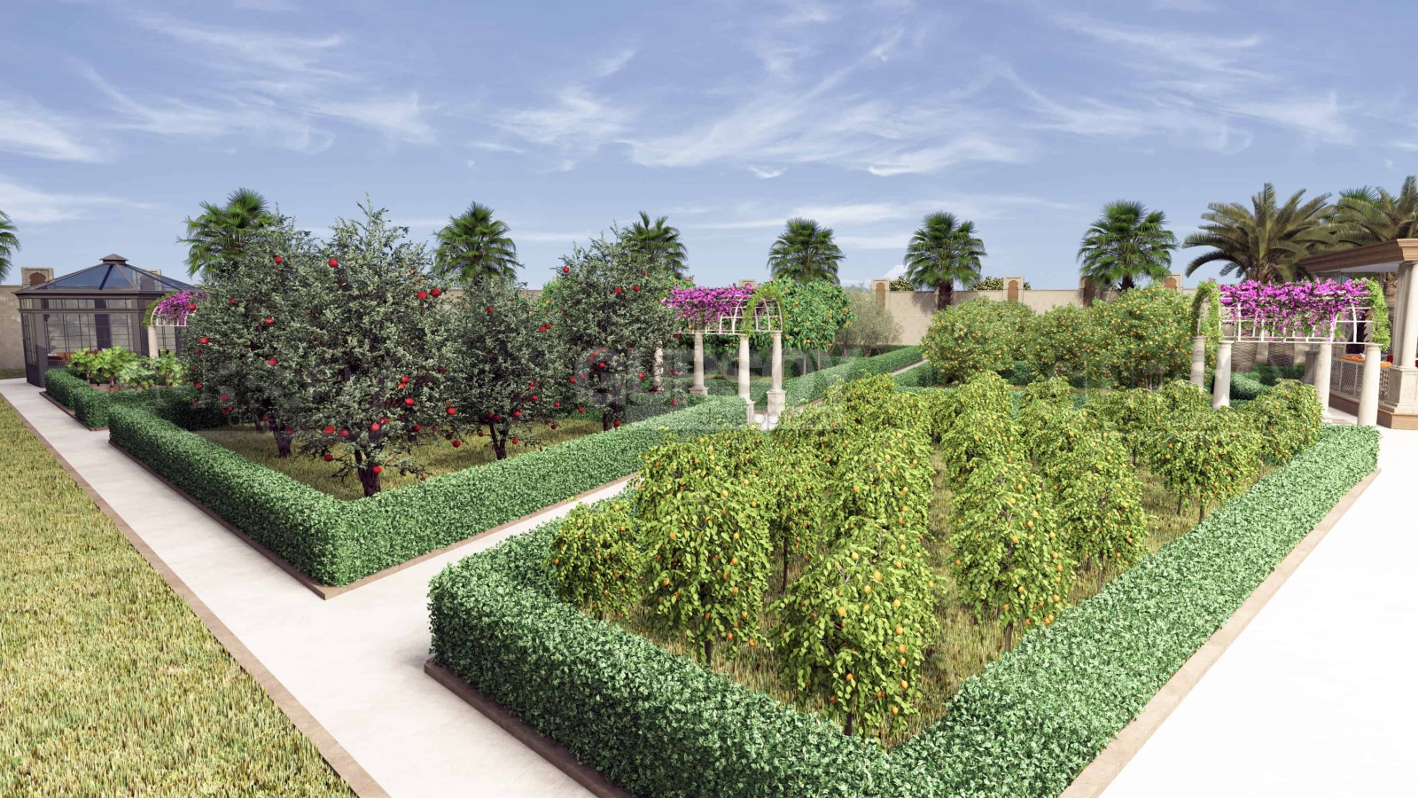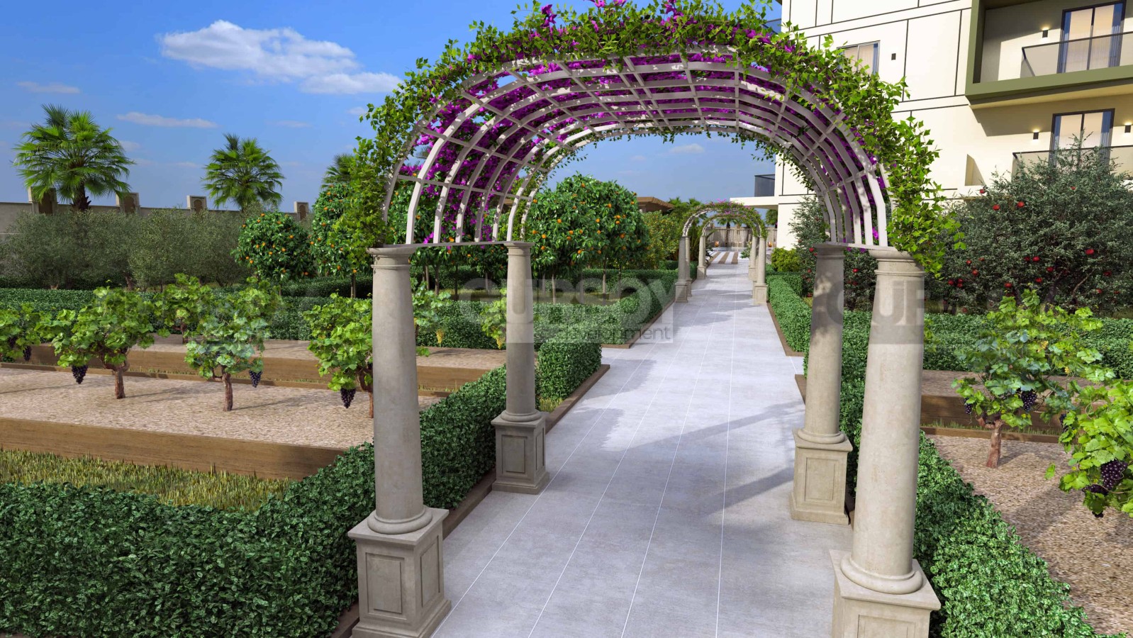 Самая главная особенность комплекса – большая придомовая территория общей площадью 5.000 м2. Что позволяет спроектировать не только бассейн площадью 400 м2 с различными зонами отдыха, но и сад с фруктовыми деревьями. В комплексе будут расти апельсиновые, мандариновые, лимонные, гранатовые, оливковые деревья, кумкват и виноград. Предусмотрена застеклённая беседка и дорожки для прогулок, открытая парковка, велопарковка, огороженная территория, подсветка территории и фасадов, электрогенератор, WI-FI и спутниковое ТВ. Площадь земельного участка - 5678 м2. Конечно дизайнеры не забыли и о самых маленьких жителях комплекса. Для интересного и весёлого времяпрепровождения детей: отдельный бассейн, парковый лабиринт, открытая детская площадка.