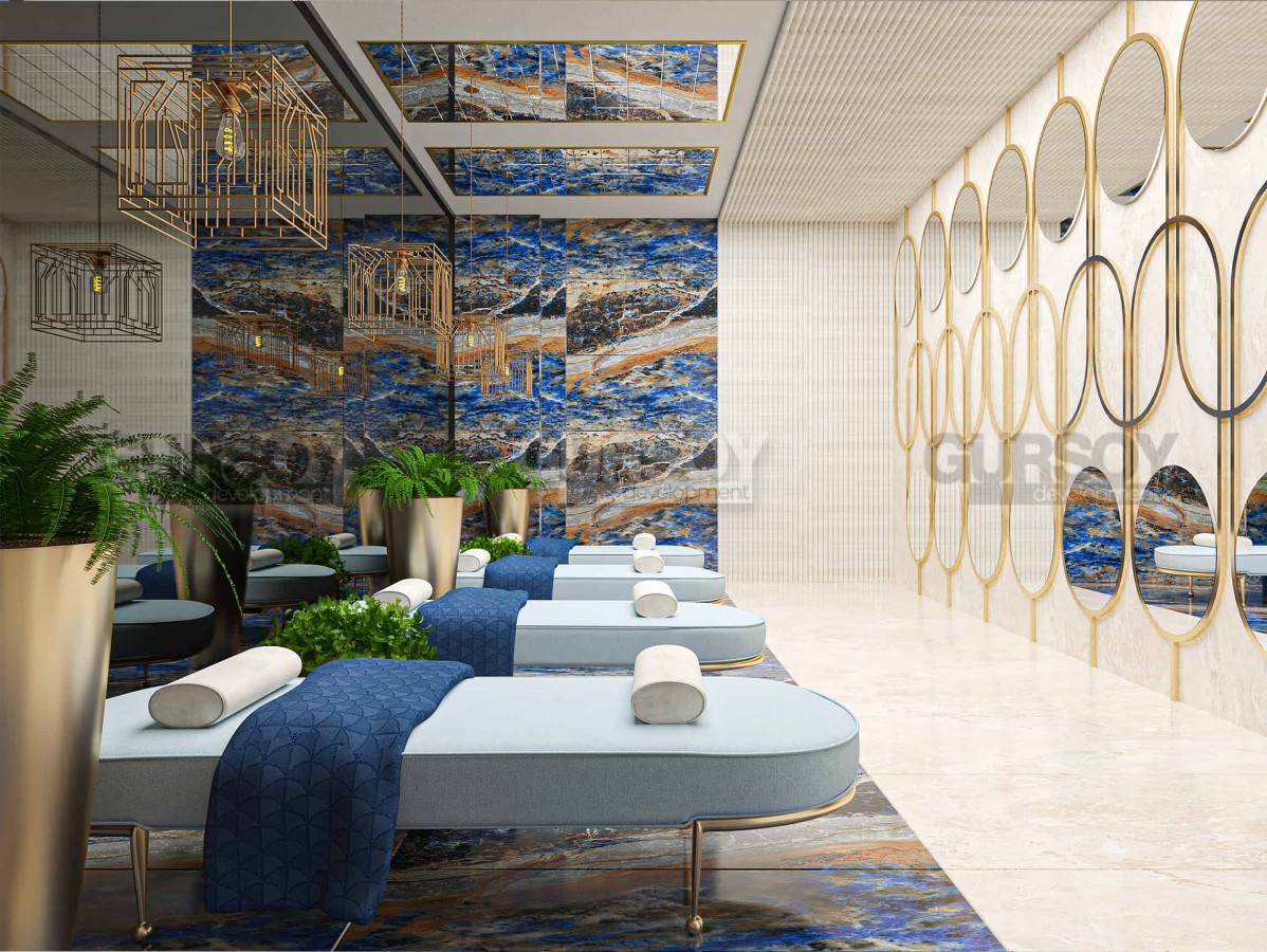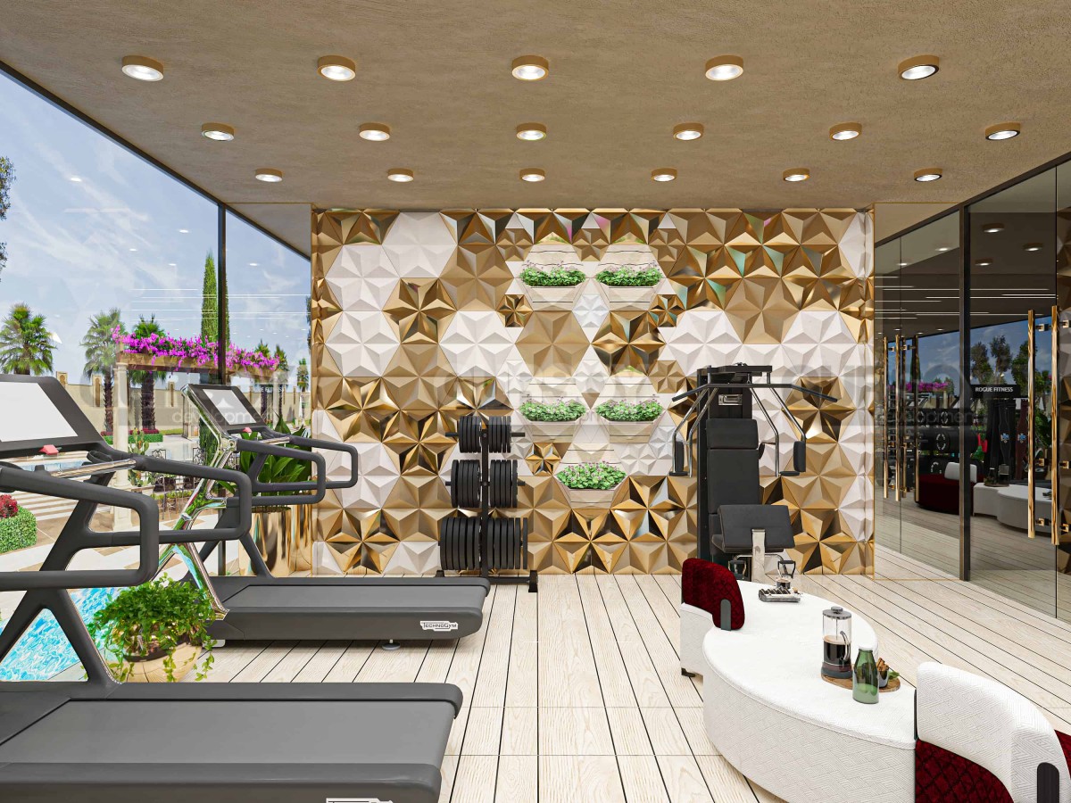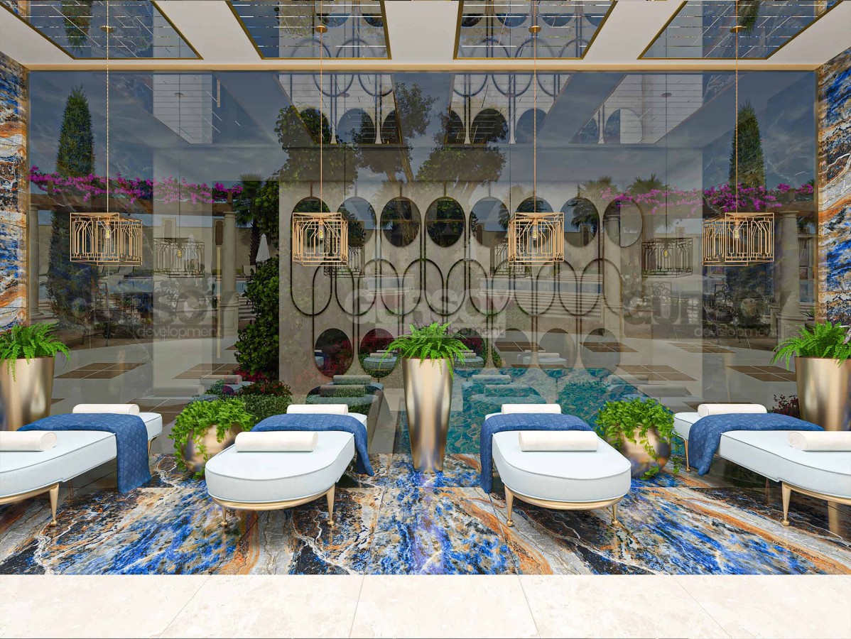 Внутренняя инфраструктура комплекса включает в себя закрытый бассейн с подогревом, сауну, паровую, соляную комнату, зону отдыха, джакузи с подогревом, тренажерный зал, детскую игровую комнату и конечно же лобби.