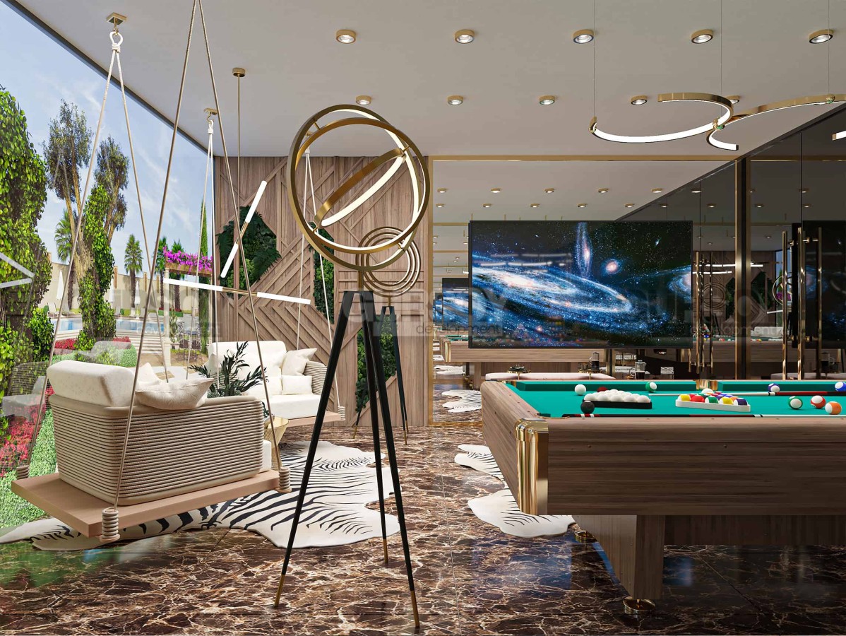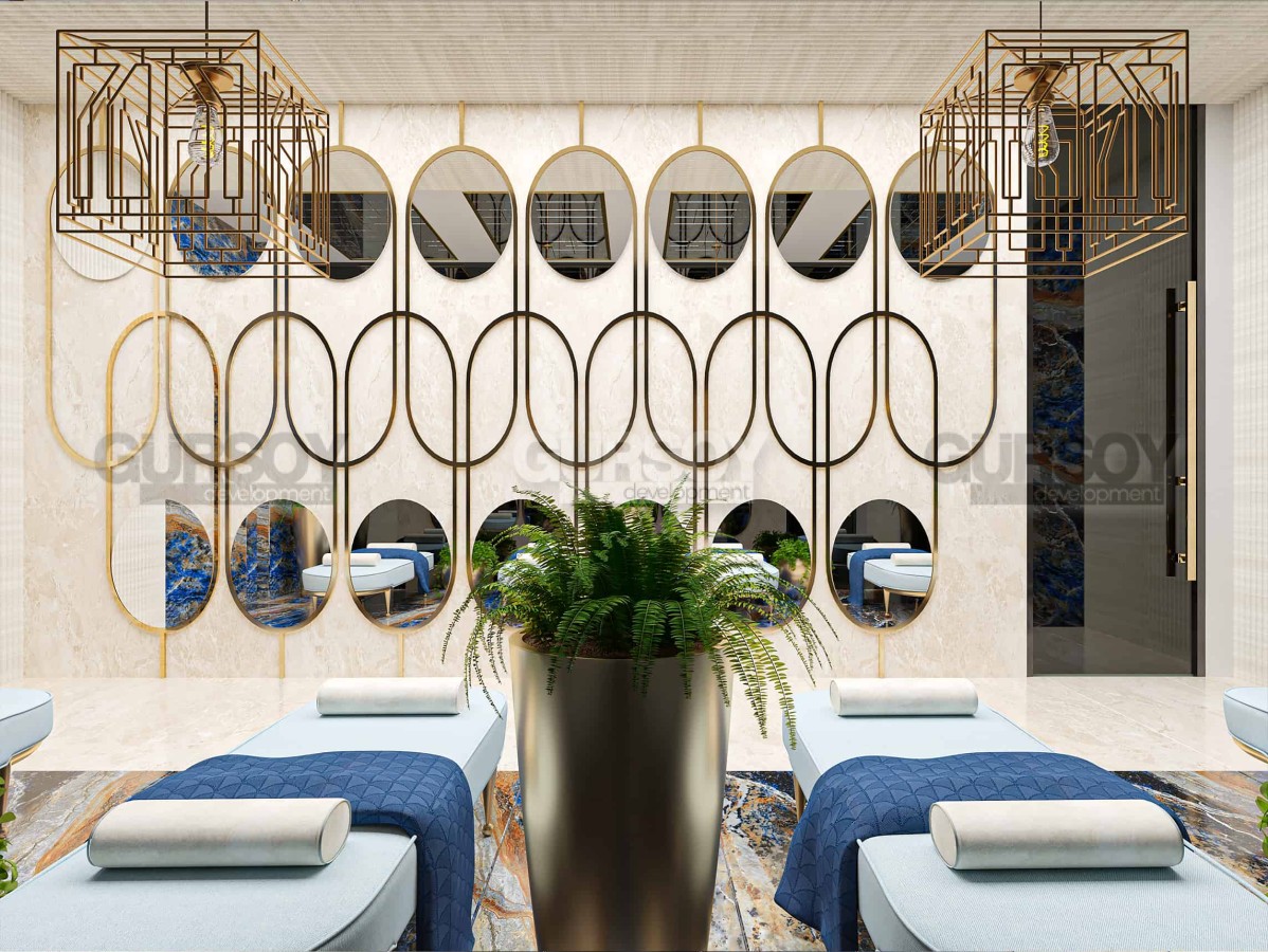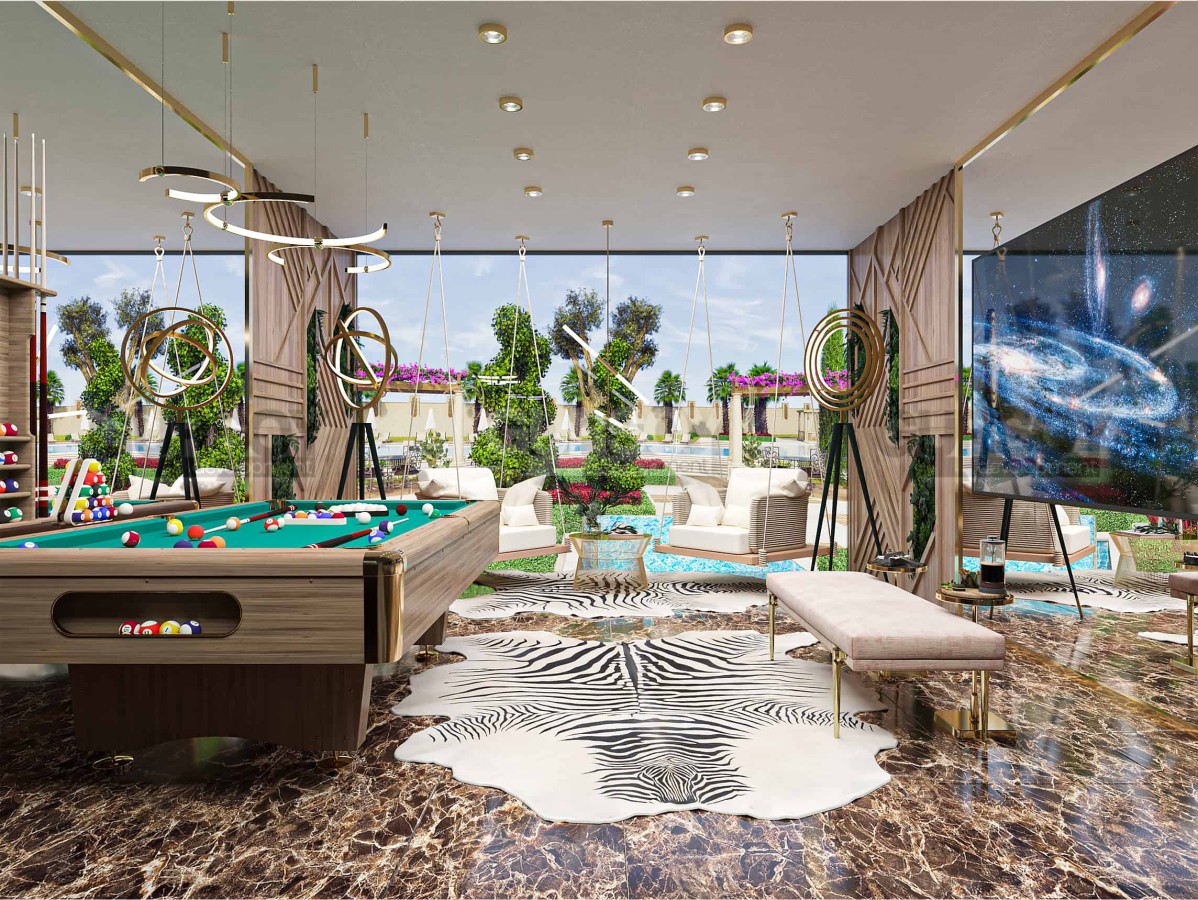 Внутренняя инфраструктура комплекса включает в себя закрытый бассейн с подогревом, сауну, паровую, соляную комнату, зону отдыха, джакузи с подогревом, тренажерный зал, детскую игровую комнату и конечно же лобби.