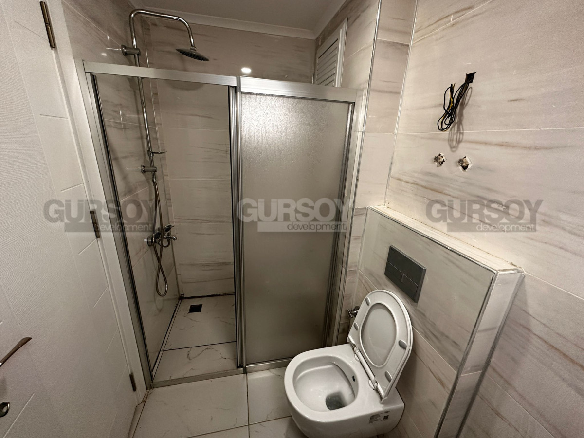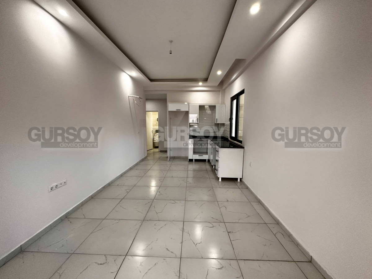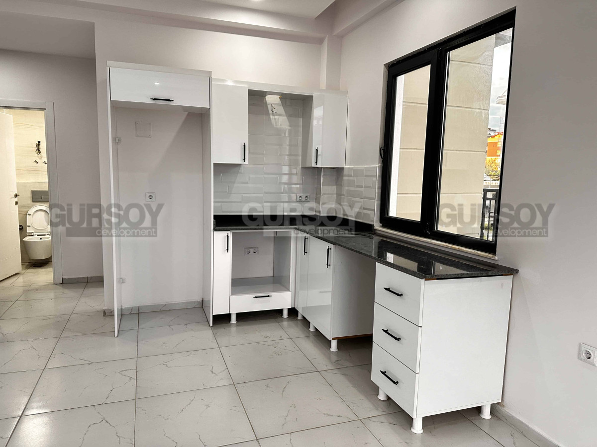 Квартира предлагает удобную планировку 1+1 с открытой кухней и функциональной кухонной мебелью, включающей ниши для бытовой техники. Полы отделаны керамической плиткой, а ванная комната оборудована сантехникой, шкафами и душевой кабиной. Вас порадуют раздвижные балконные двери, окно в кухне над рабочей поверхностью и балкон с видом на море и инфраструктуру комплекса.