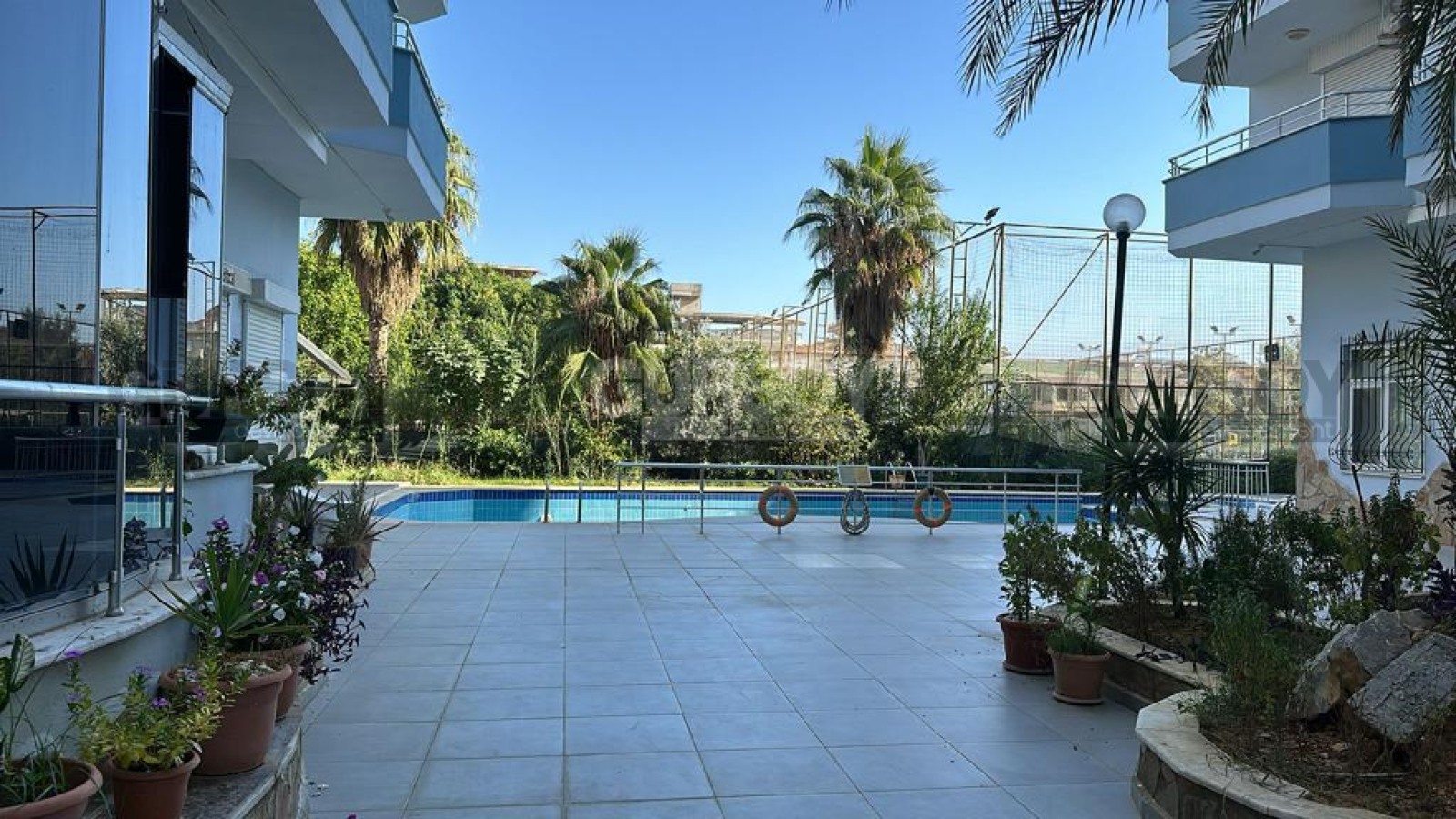Дом, в котором находится квартира, окружен ухоженным садом, а на прилегающей территории к услугам жителей оборудован открытый бассейн.
