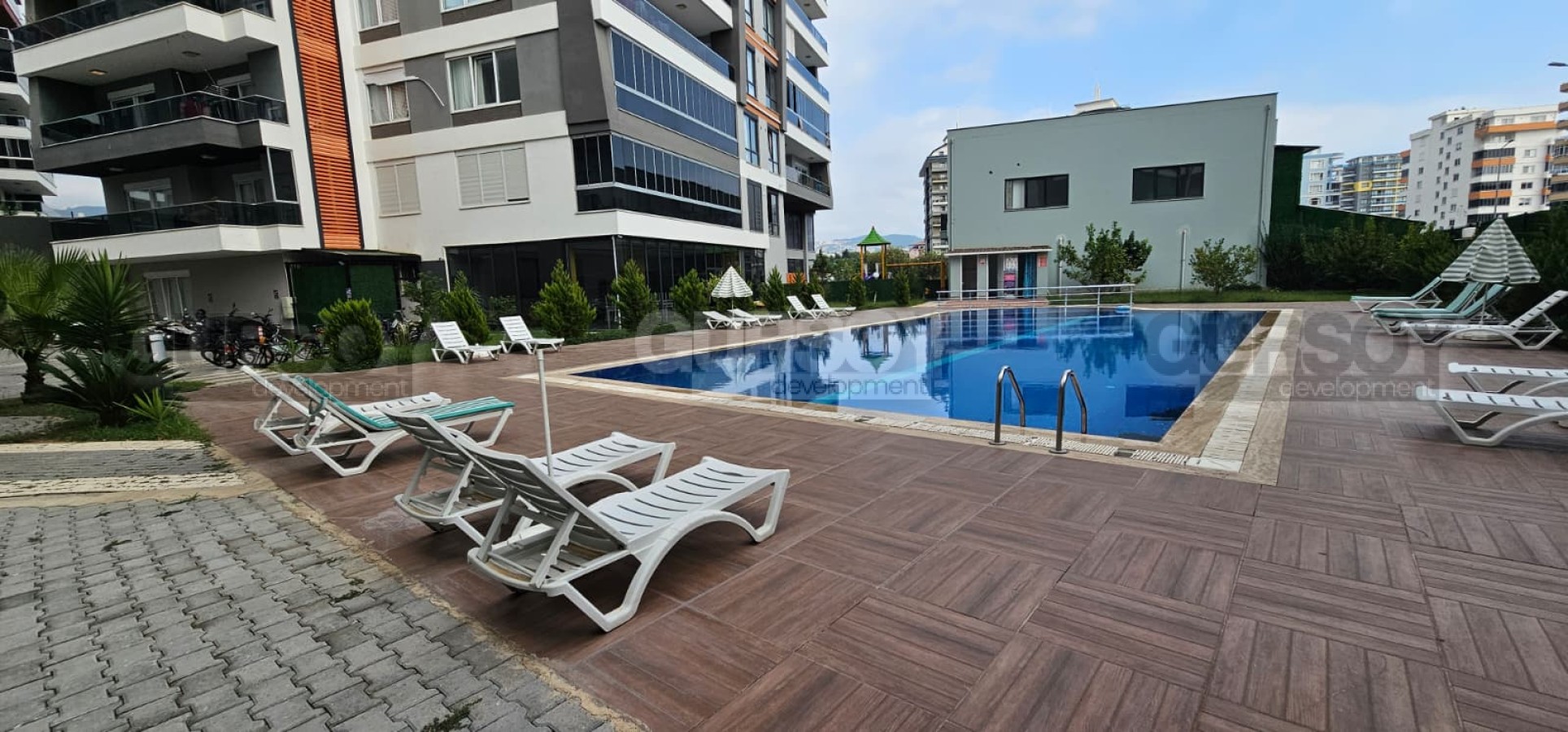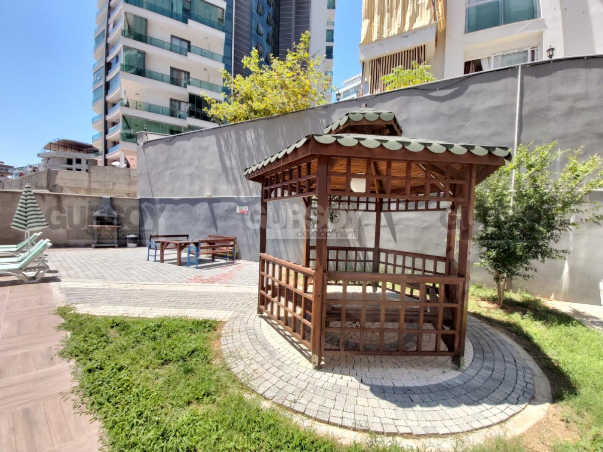Жилой комплекс предлагает инфраструктуру высокого уровня, сравнимую с отелем: открытый бассейн, фитнес-зал, сауна, паровая комната, зоны для барбекю, открытая парковка, лобби, общие помещения для отдыха и хранения, 2 лифта (на 11 человек каждый), круглосуточная охрана и камеры видеонаблюдения. Все удобства создают атмосферу уюта, безопасности и полноценного отдыха. Ежемесячный айдат всего 1000 TL — отличное соотношение цены и качества за столь развитую инфраструктуру.
