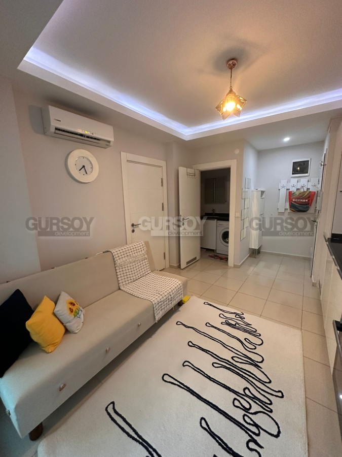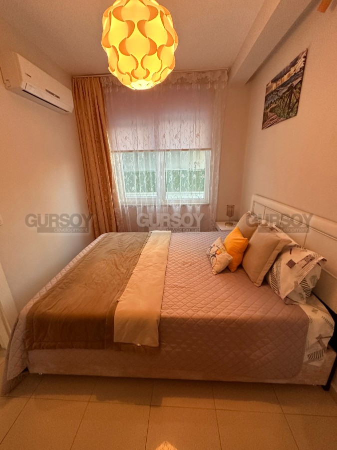 На продажу выставлена комфортабельная, готовая к проживанию квартира, с удобным расположением в нескольких минутах ходьбы от моря и центра района Оба. Небольшая, общей площадью 50 м2, она имеет в планировке совмещенную с кухней гостиную, спальню, оснащенный душевой кабиной санузел, и застекленный балкон, с видом на внутренний двор и бассейн. Квартира - светлая и уютная, с удобной мебелью и всей необходимой бытовой техникой. В компактной гостиной установлены: мягкий диван и кухонный гарнитур, с встроенным холодильником, духовым шкафом и сенсорной плитой. Обеденная зона, с круглым столиком и стульями, организована на застекленном балконе. Спальня укомплектована комфортабельной кроватью, тумбой, трюмо и гардеробным шкафом, а в ванной комнате имеется стиральная машина.