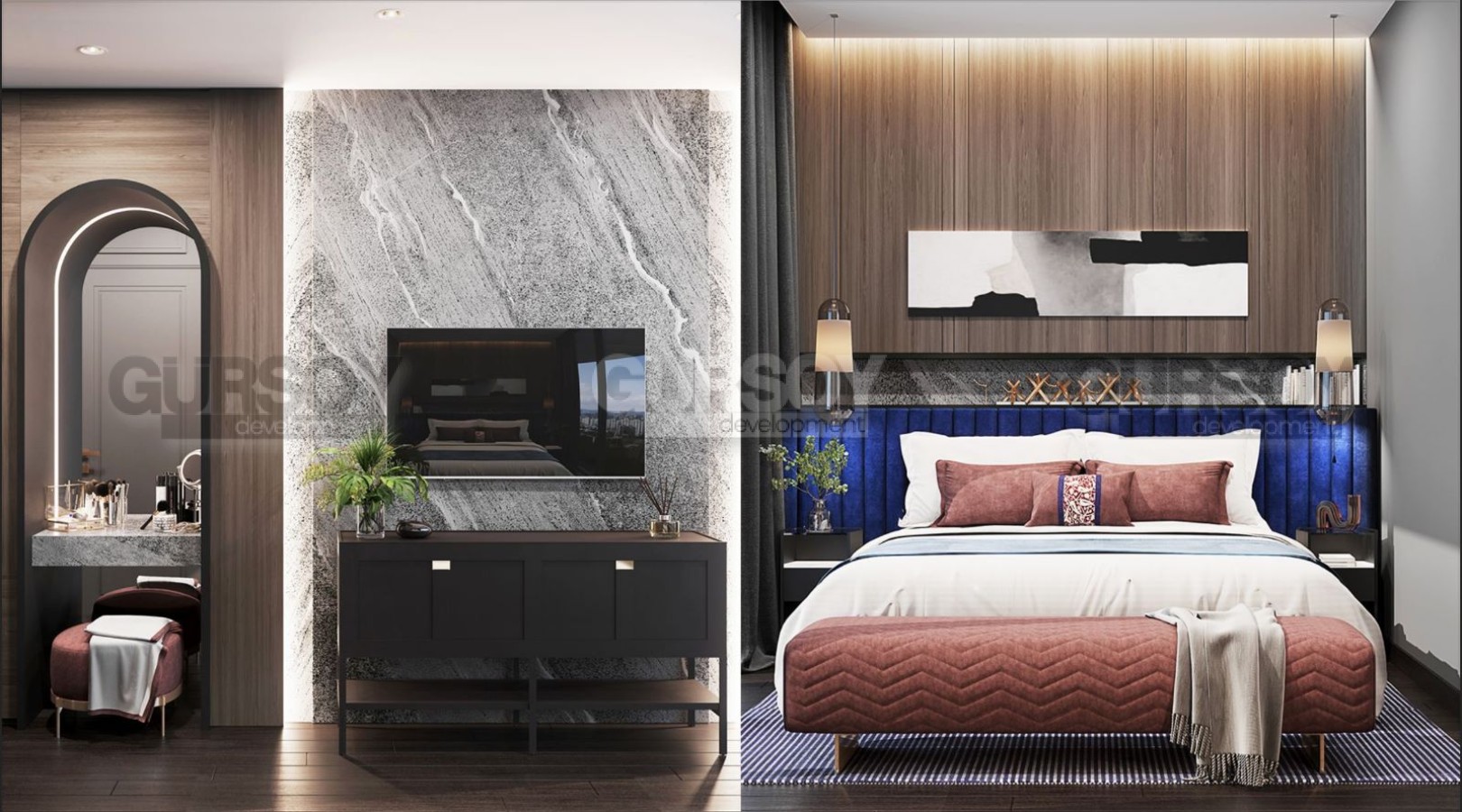В комплексе доступны апартаменты с планировками от 1+1 до 4+1 и площадью от 65 м² до 234 м². Они предлагают высококачественную отделку и функциональное жилое пространство, которое эффективно использует каждый квадратный сантиметр. Все дизайн-проекты включают стильные кухни и ванные комнаты со встроенной техникой, премиальную сантехнику и высококлассные материалы.