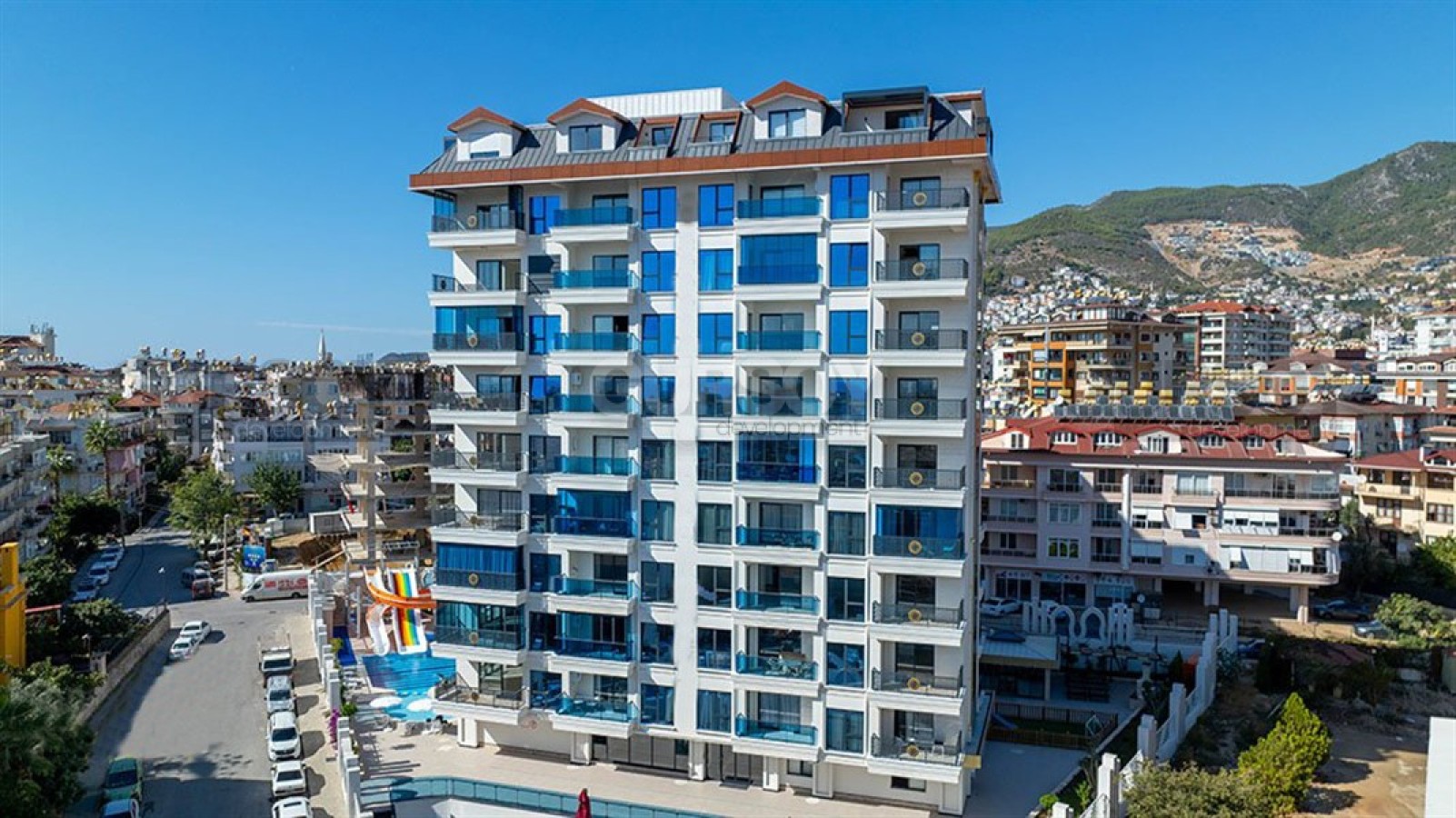 Расположение — один из главных плюсов. Комплекс находится в самом центре Аланьи: до главной улицы всего 200 метров, а до моря и пляжа — 800 метров. Всё необходимое для комфортной жизни — магазины, аптеки, кафе, рестораны, школы, остановки транспорта — находится в шаговой доступности.
