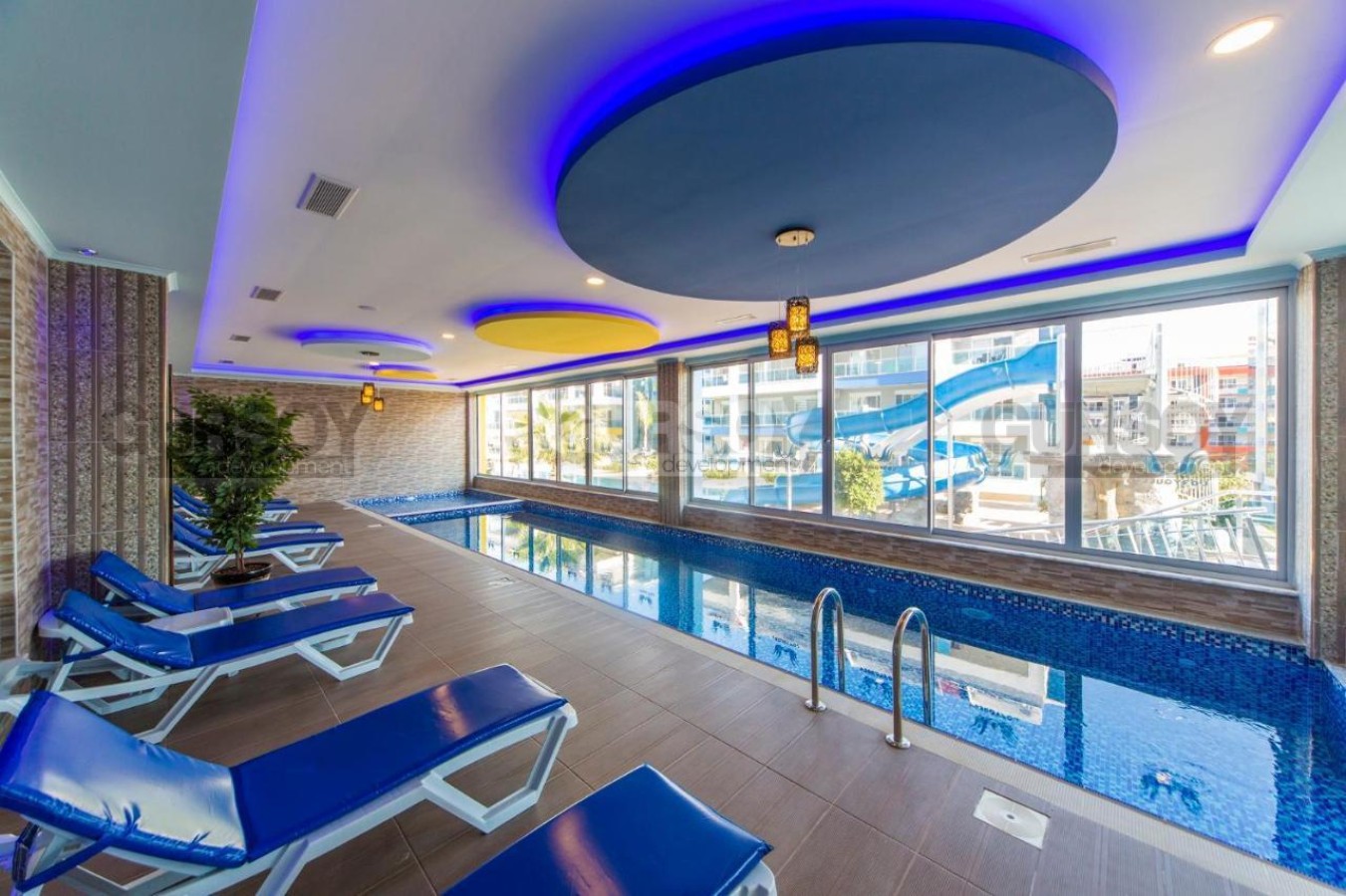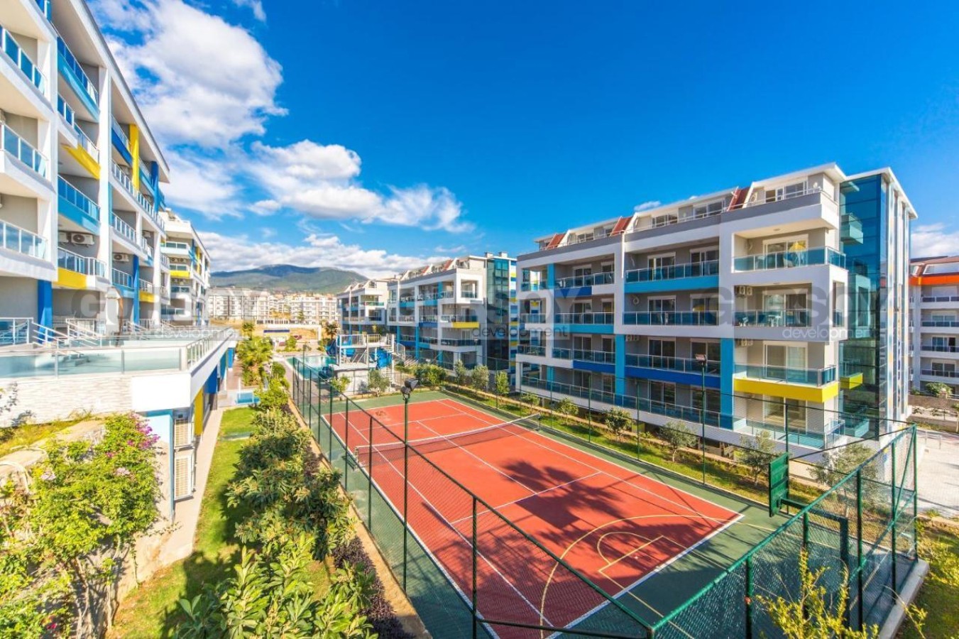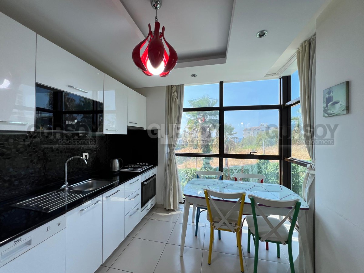 Расположение — ещё одно большое преимущество. Комплекс находится в районе Кестель, одном из самых спокойных и зелёных в Аланье. До моря всего 300 метров — можно дойти пешком за пару минут. Вокруг — магазины, кафе, аптеки и остановки общественного транспорта. Центр города — в 10 минутах езды.