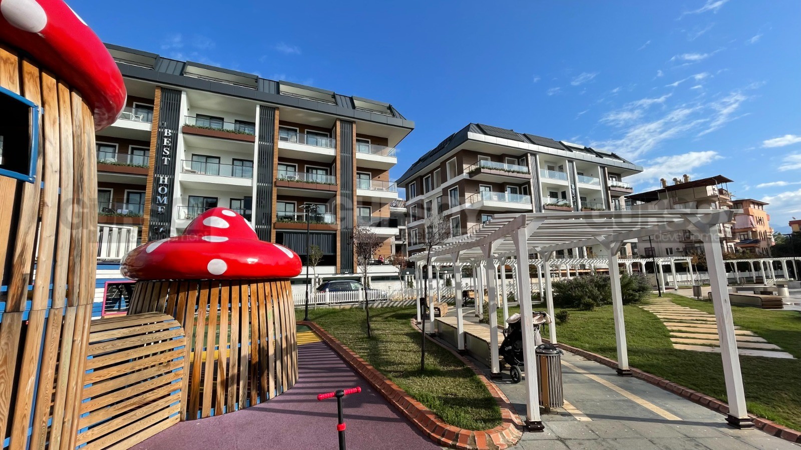 Комплекс расположен в развитом и удобном районе, в пешей доступности от магазинов, кафе, общественного транспорта и пляжа. Это отличное место как для сезонного проживания, так и для сдачи в аренду.