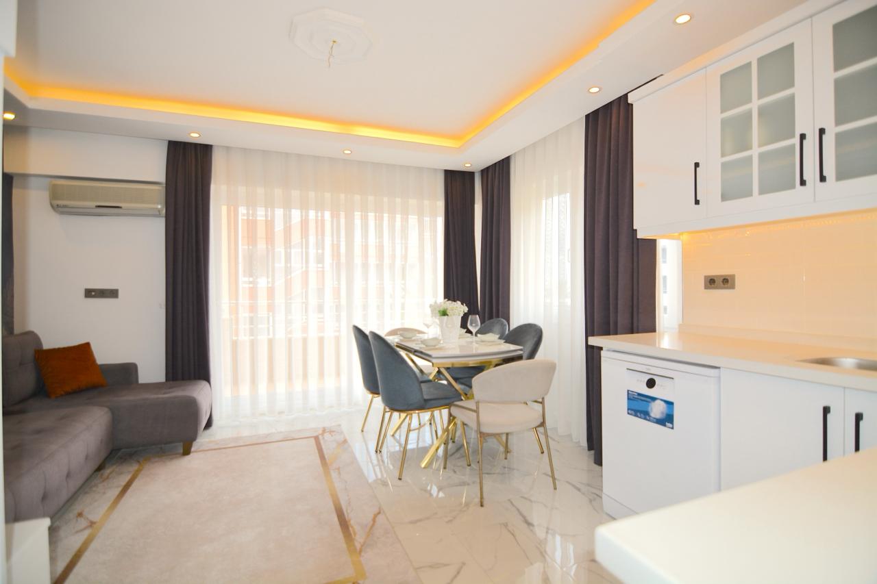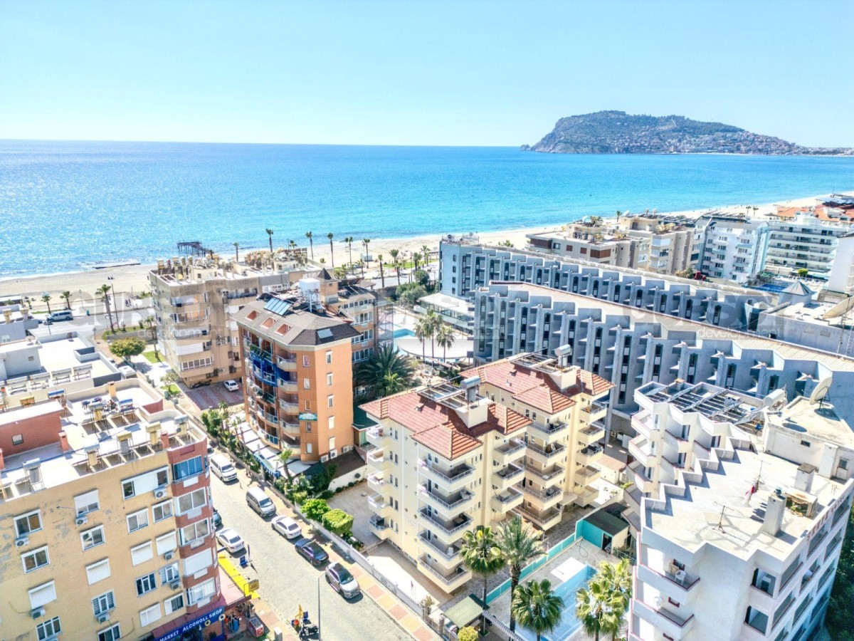 Предлагается к продаже квартира 1+1 общей площадью 65 м², расположенная на 4 этаже в районе Оба. Дом около 20 лет, пятиэтажный жилой комплекс. Квартира продаётся с мебелью, планировка включает гостиную с кухней, спальню, санузел и балкон.