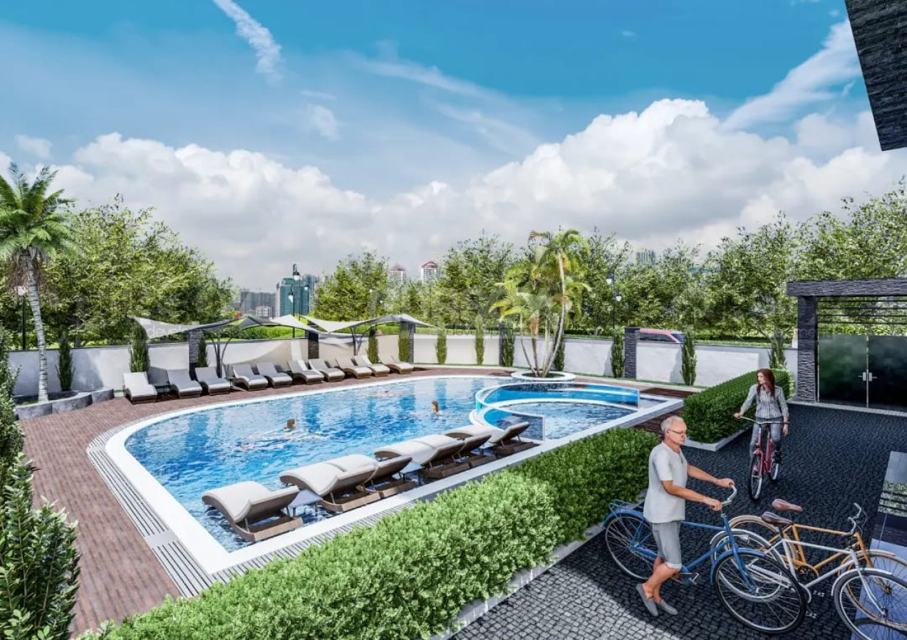 Проект состоит из одного пятиэтажного жилого дома и придомовой территории с зонами для отдыха, СПА, автопарковкой и плавательным бассейном.