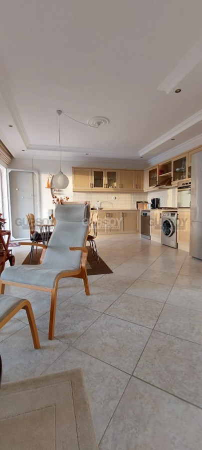 Продаётся просторная квартира планировки 2+1 площадью 125 м², расположенная на 5-м этаже. Квартира полностью меблирована и готова к проживанию. Она ориентирована на юг, имеет две ванные комнаты и просторный балкон с видом на море и Кале, что создаёт ощущение света, простора и комфорта в любое время дня.