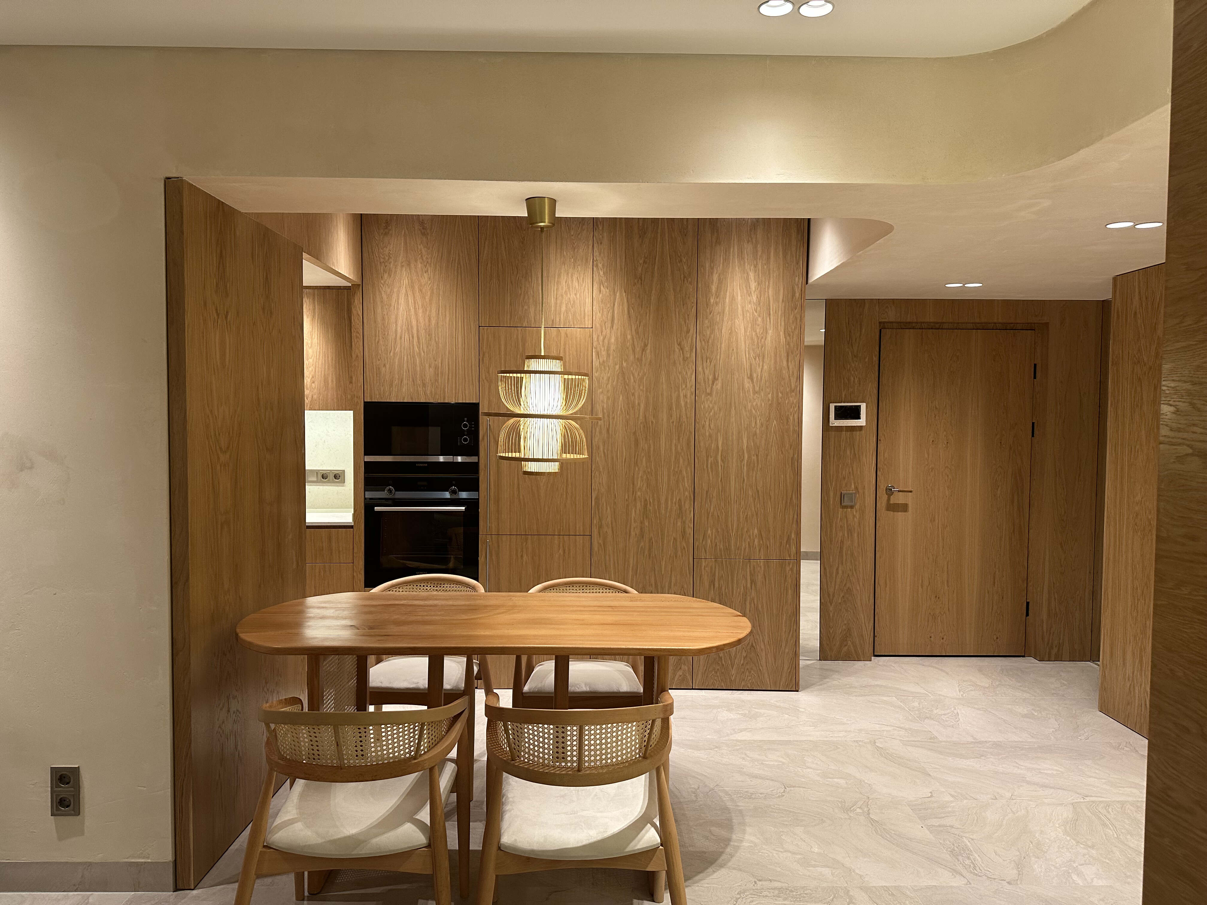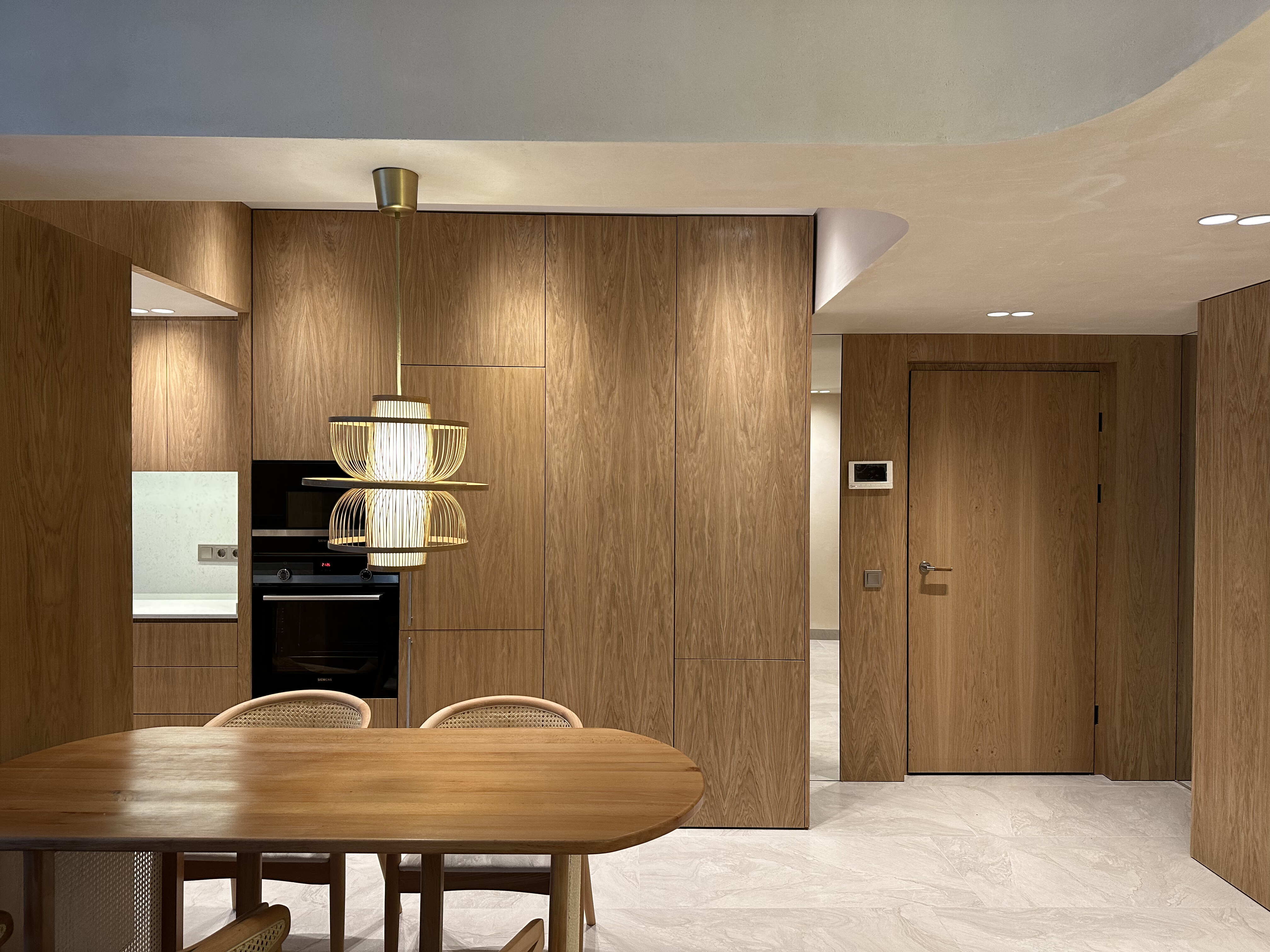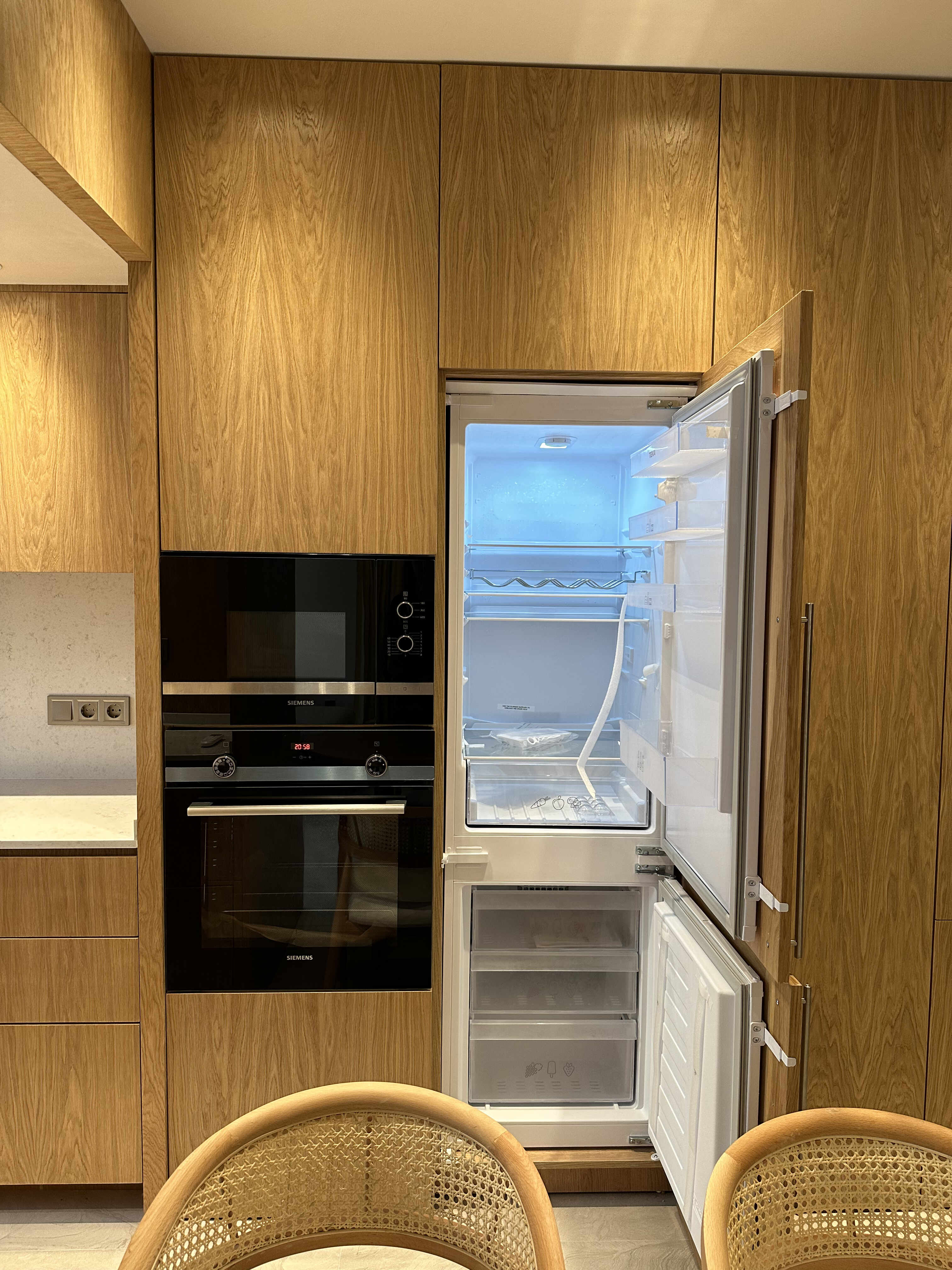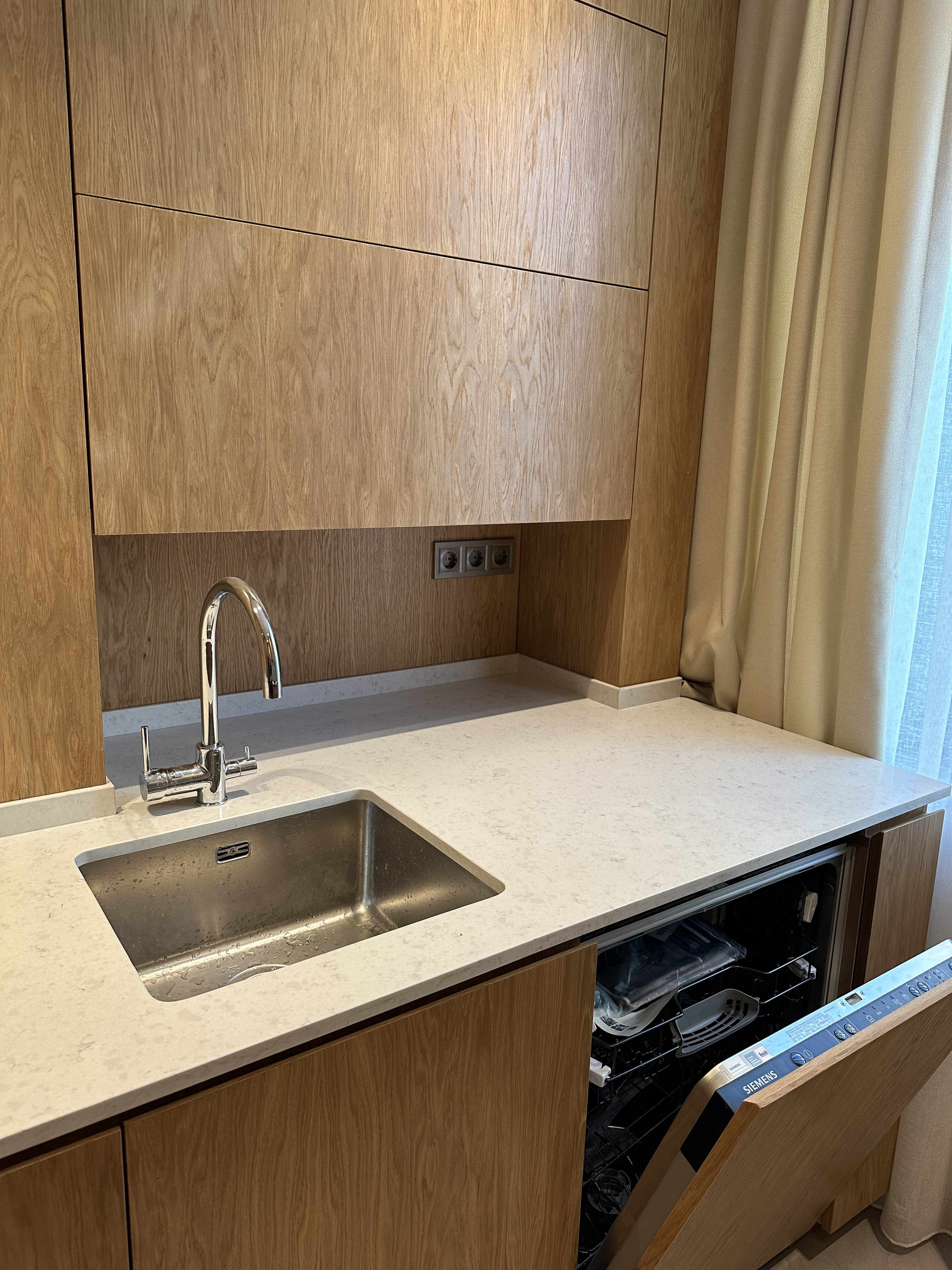 Вся техника марки SİEMENS в кухонной зоне встроенная и скрыта деревянными панелями. В кухонном гарнитуре сделана мраморная столешница и керамический задний фартук.
