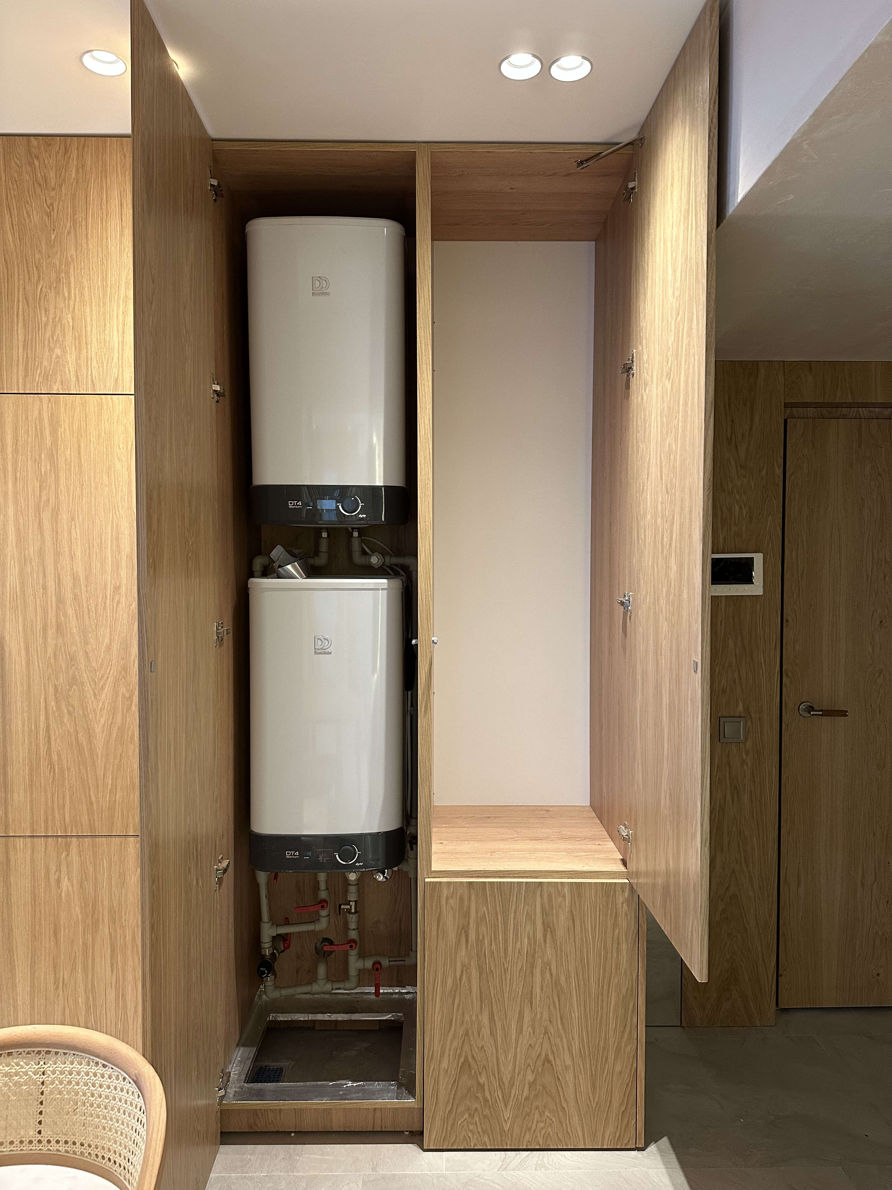 Для подогрева воды установлены два накопительных бойлера Demir Döküm по 80 литров в скрытой нише, два бойлера позволяют нагревать воду очень быстро и для кухни, и для ванных комнат и экономить электричество.