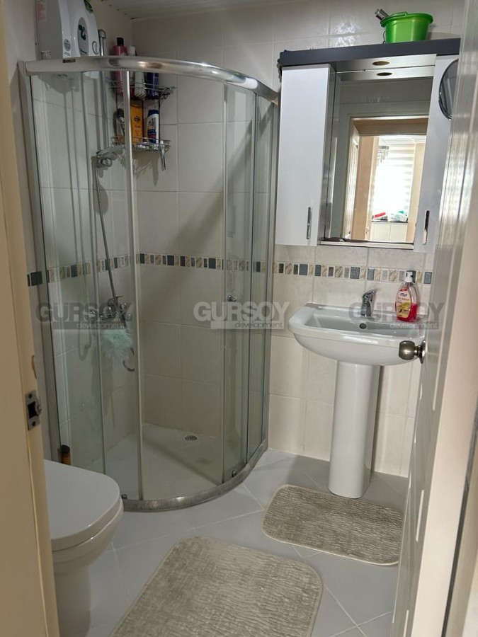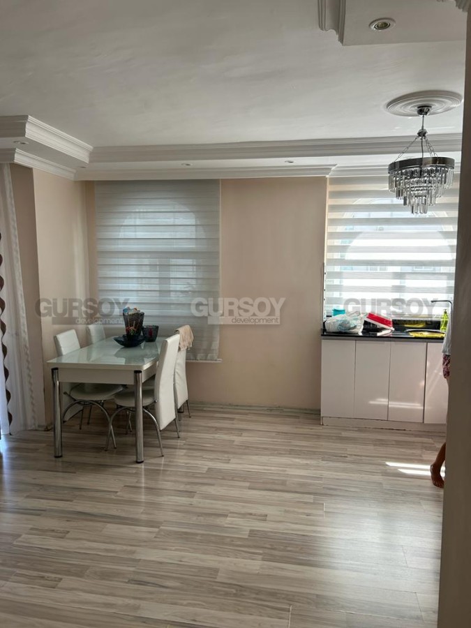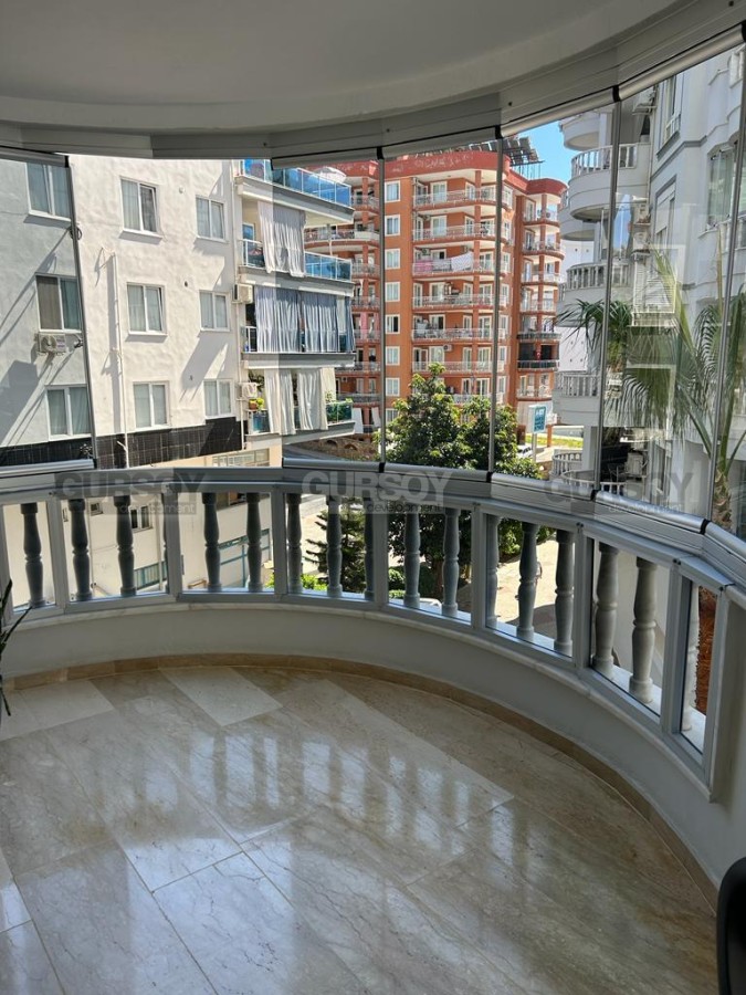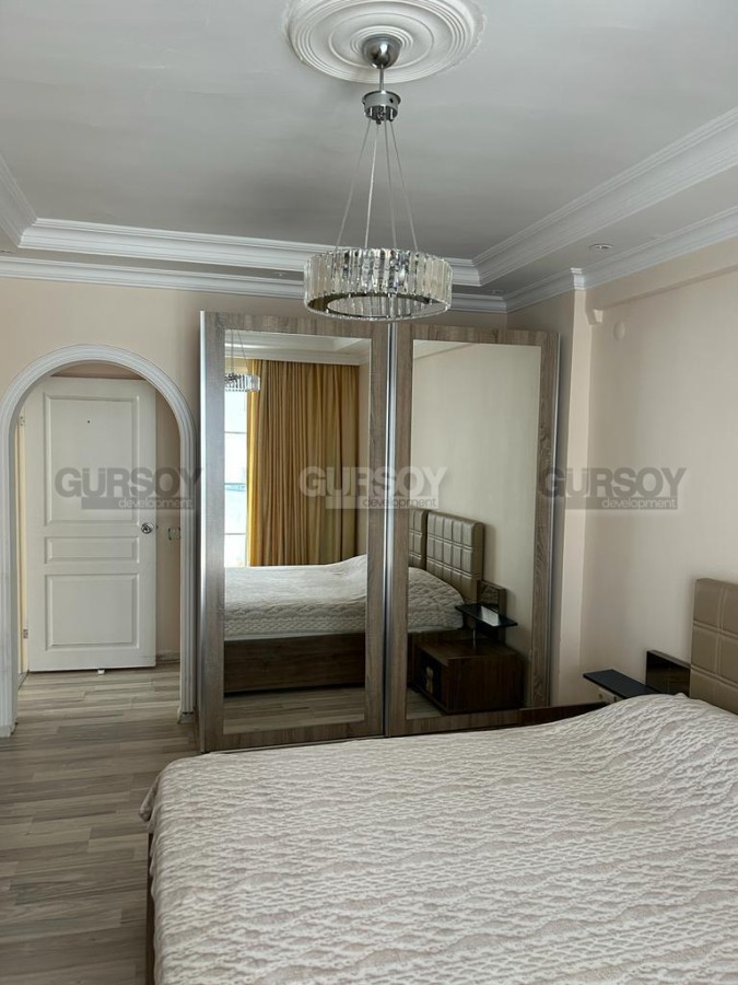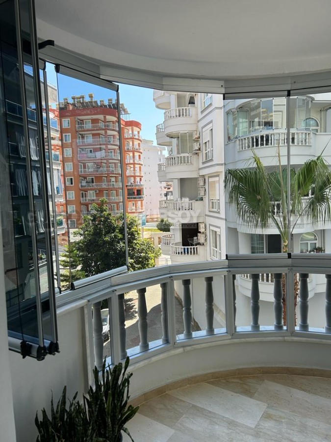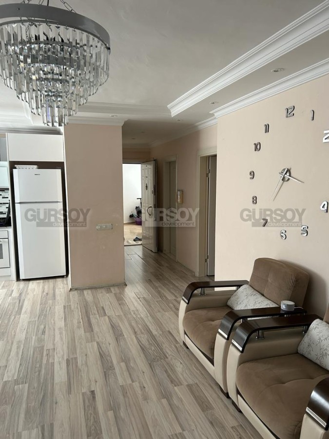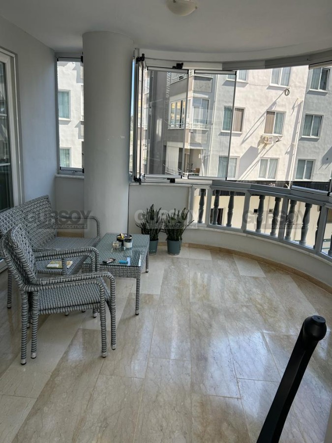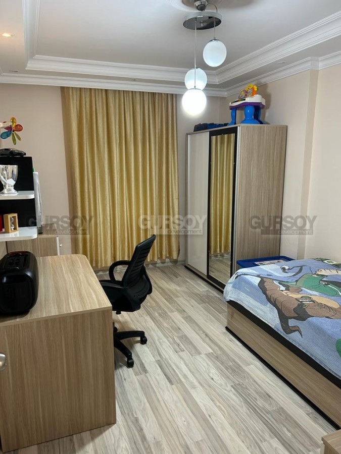 В нескольких минутах ходьбы от центра спокойного, ухоженного района Аланьи - Тосмур, на 2-м этаже в доме 2005 года постройки, выставлена на продажу просторная квартира 2+1, общей площадью 100 м2. В планировке апартаментов - совмещенная с кухней гостиная, 2 спальни, 2 укомплектованных душевыми кабинами санузла и большой застекленный балкон. В квартире сделан качественный ремонт, установлена комфортабельная мебель и вся необходимая бытовая техника, а в интерьере удачно сочетаются светлые оттенки и дерево. В гостиной организована зона отдыха, с мягкими диванами, креслами и тумбой; ближе к кухне, оснащенной холодильником, духовым шкафом и газовой плитой, расположен обеденный стол. В спальнях установлены кровати, тумбы, комод и гардеробные шкафы, а в детской оборудован рабочий уголок, с письменным столом. Из гостиной есть выход на симпатичный застекленный балкон, где организована уютная зона отдыха, с плетеной садовой мебелью.