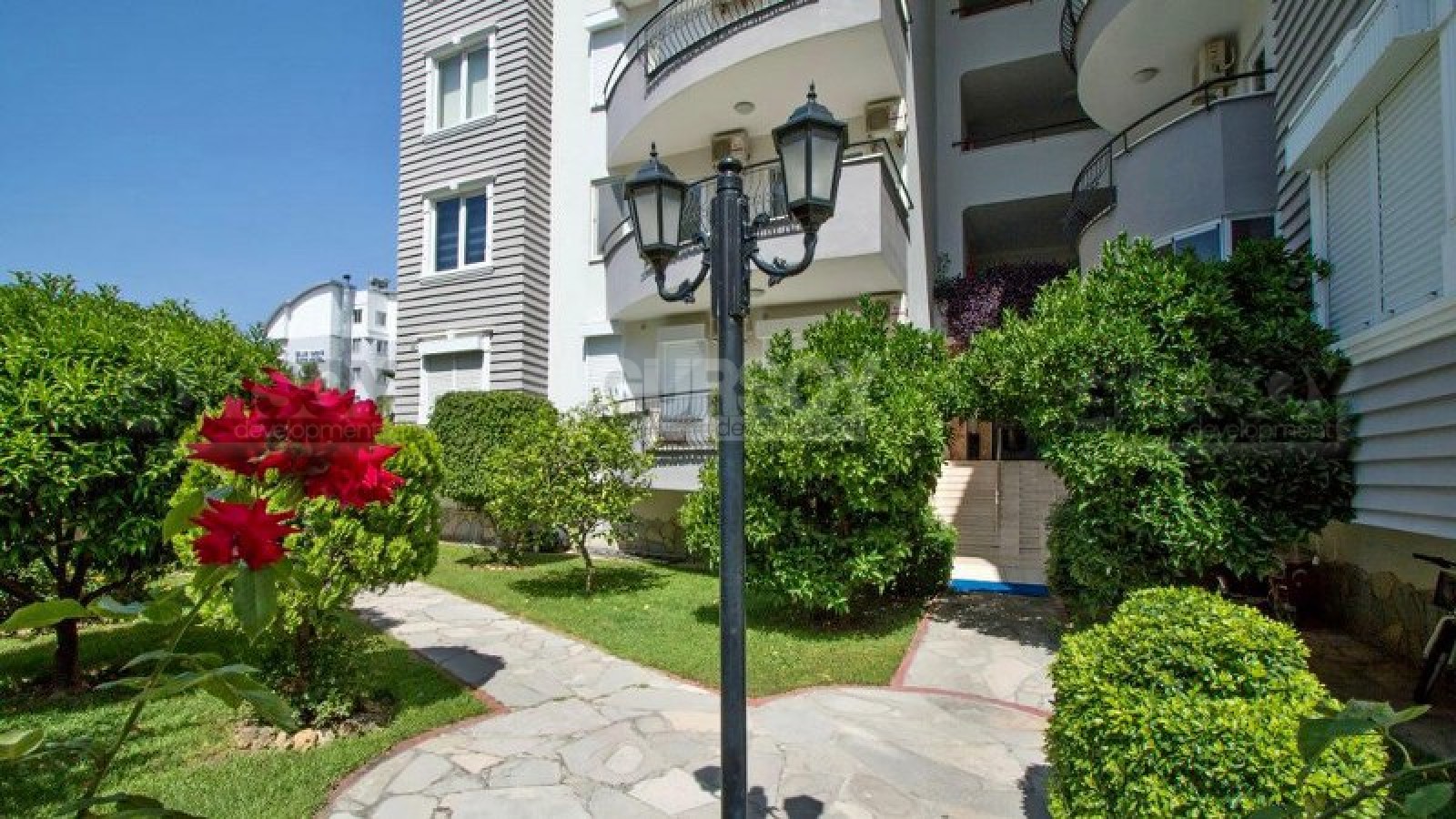 Дом, на 3-м этаже которого находится квартира, окружен ухоженным зеленым салом. На прилегающей территории оборудован открытый бассейн, с шезлонгами и зонами отдыха. Локация комплекса очень удачна - всего в 300 метрах - пляж и набережная; а в 100 метрах - центр района Оба, с супермаркетами, пекарнями, магазинами одежды, аптеками, кафе, ресторанами, отделениями банков и связи.