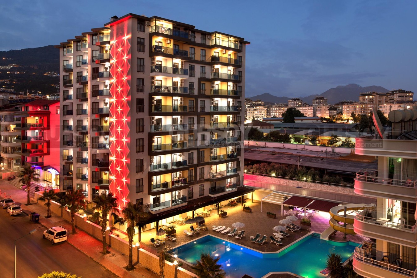 Квартира расположена в центре Алании – одном из самых престижных районов города. Вся необходимая инфраструктура, включая магазины, кафе, рестораны, школы и медицинские учреждения, находится в шаговой доступности. До пляжа всего 900 метров, что делает этот вариант привлекательным как для постоянного проживания, так и для сдачи в аренду.