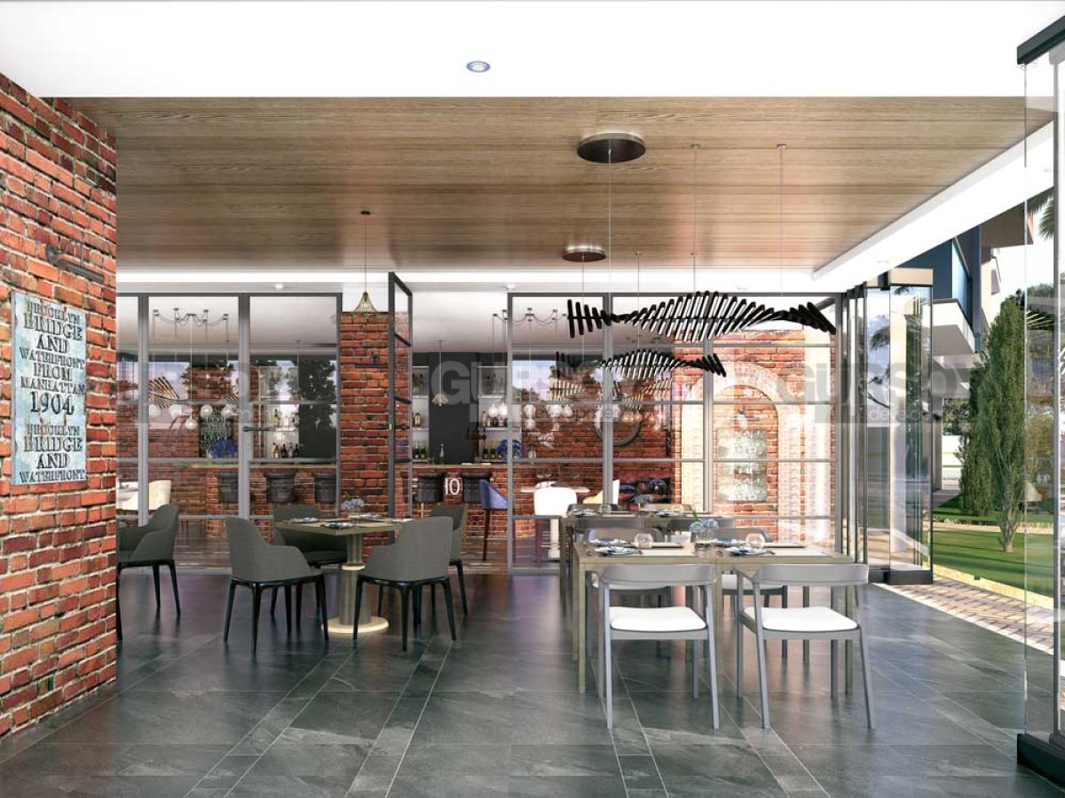 В комплексе предусмотрены: бассейн, детский бассейн, водные горки, терраса для загара с шезлонгами, спортивные площадки (футбол, баскетбол, теннис, волейбол, трибуны), детские игровые площадки (дорожка для скалолазания, бассейн с песком), зоны для отдыха в саду, амфи-театр, аллеи для прогулок, автопарковка, охрана, холл, ресепшн, крытый бассейн, хамам, зал для занятий спортом, комната для игр и отдыха, кафе, бар.
