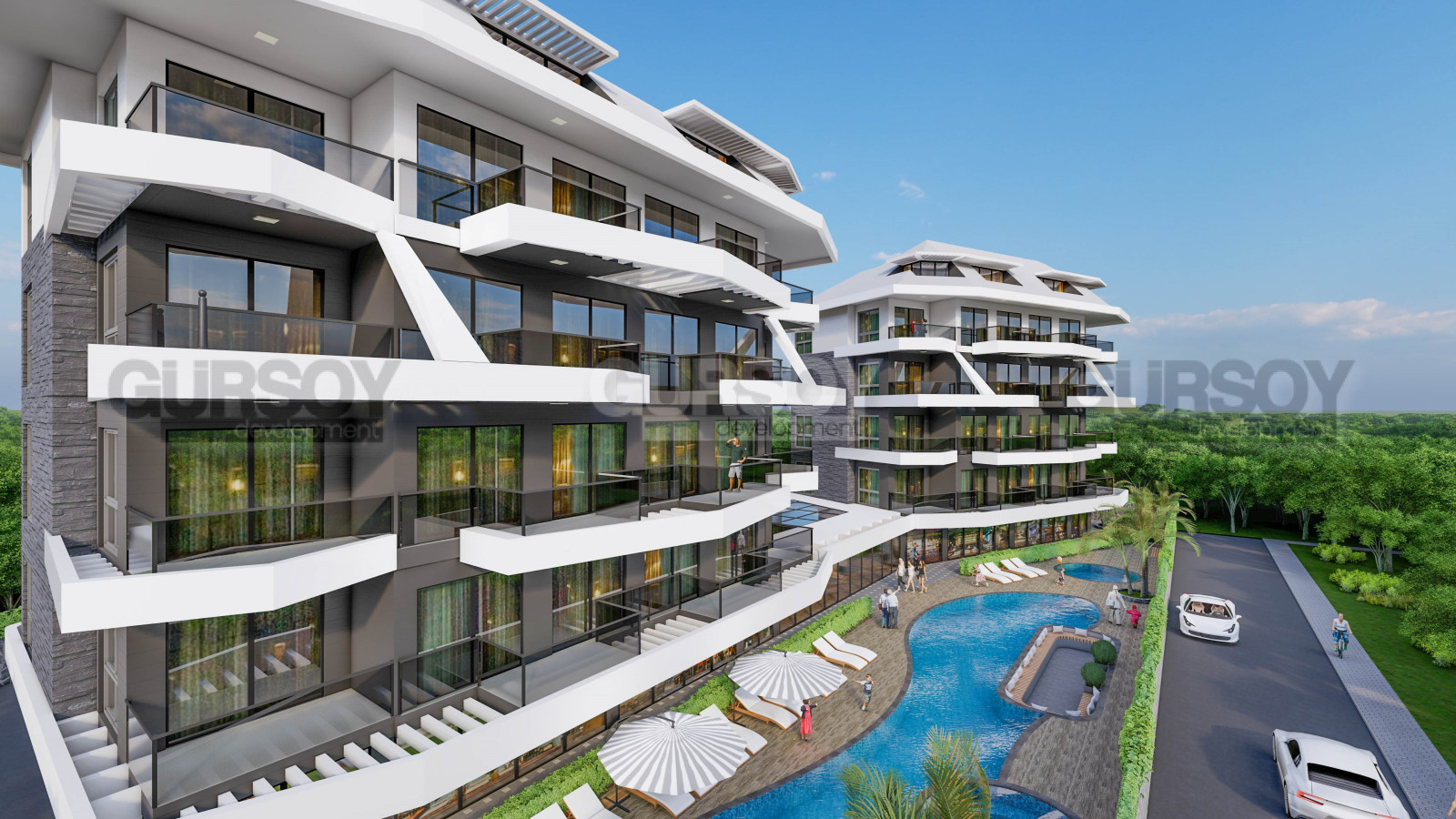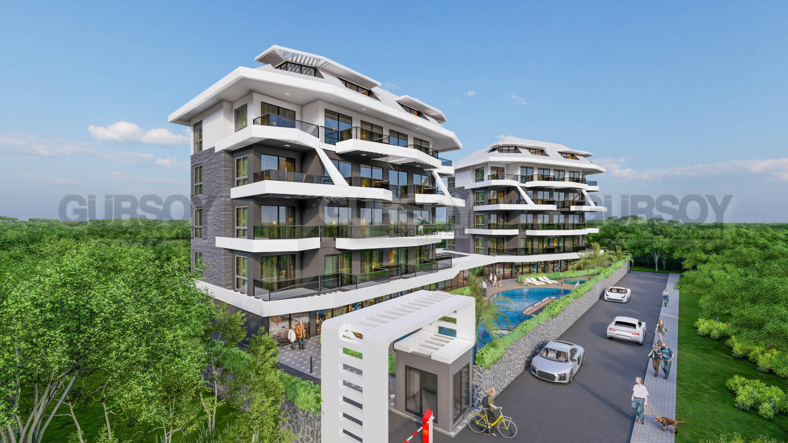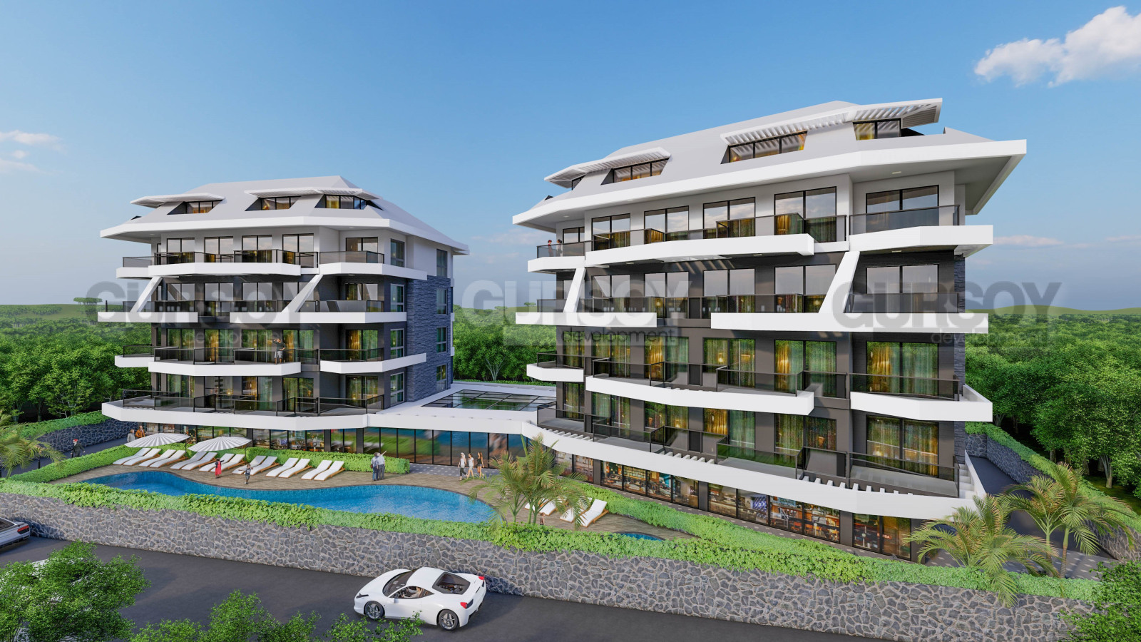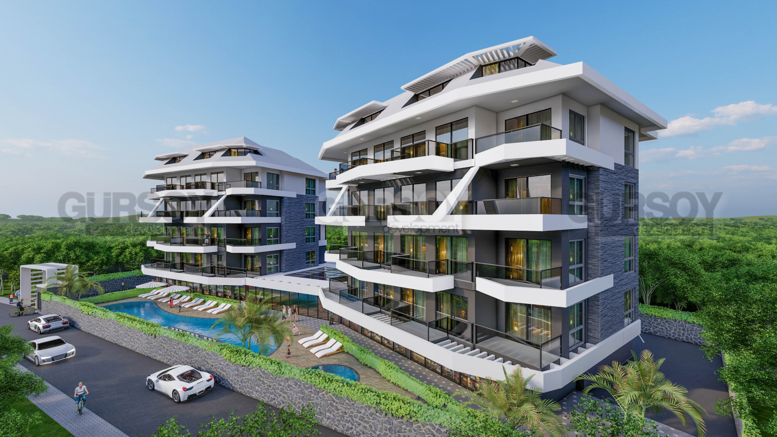 В комплексе представлены апартаменты 1+1 площадью 50 и 51 м², двухэтажные пентхаусы 2+1 площадью 77, 97 и 108 м², а также роскошные пентхаусы 3+1 площадью 141 м². Все квартиры предлагаются с готовой финишной отделкой, современными кухонными гарнитурами и полностью оборудованными ванными комнатами.