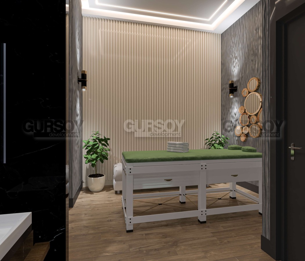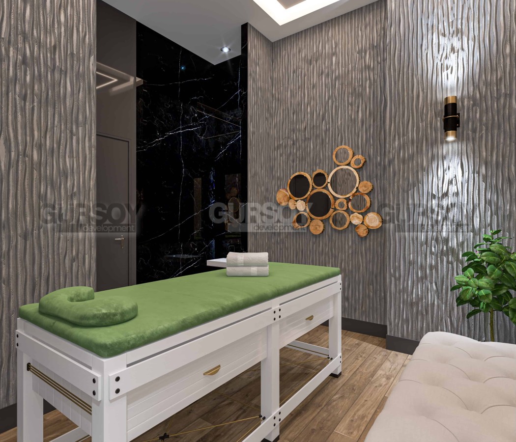 Внутри СПА- центра: закрытый подогреваемый бассейн, хамам, паровая комната, финская сауна, комнаты для массажа, зона отдыха, фитнес-центр, зал для йоги и пилатеса.