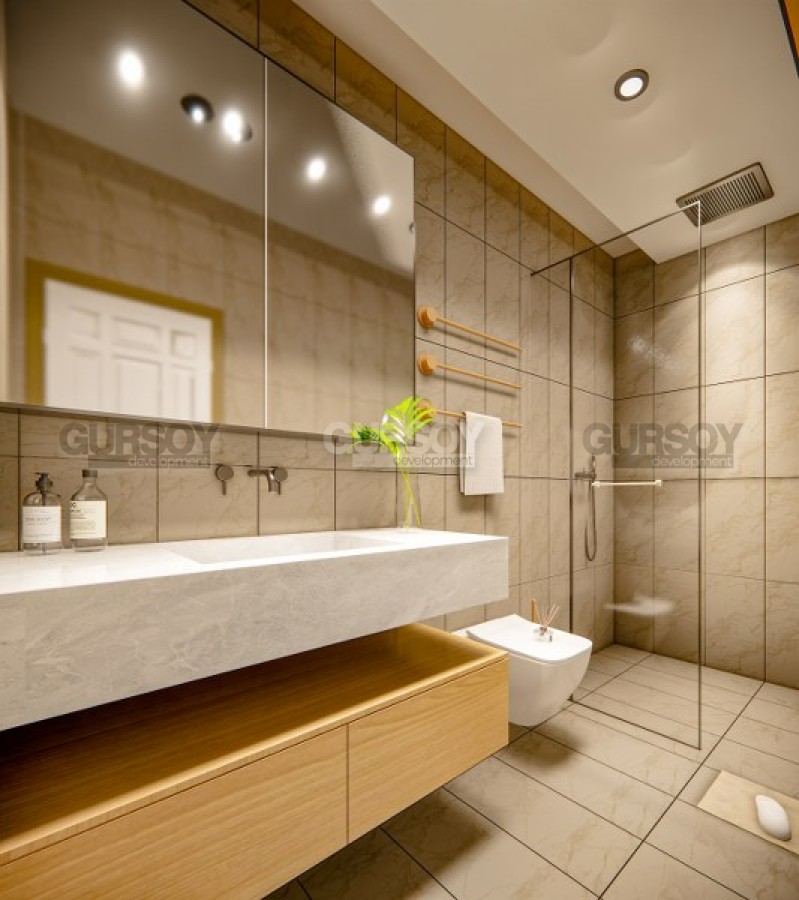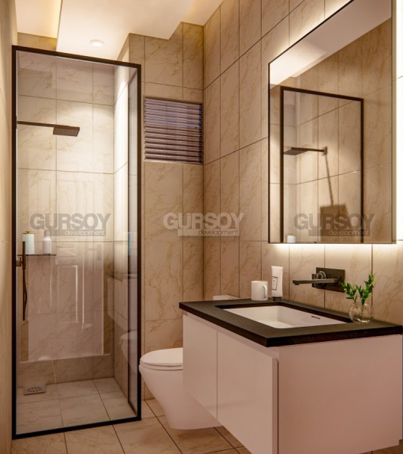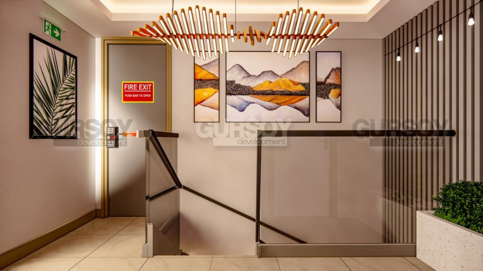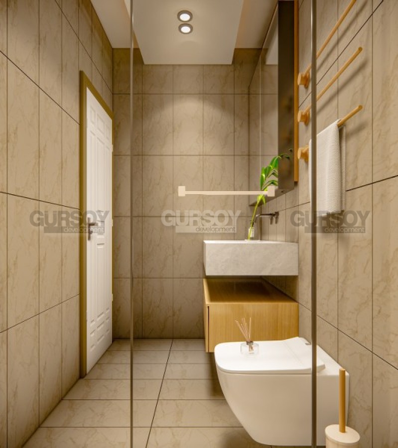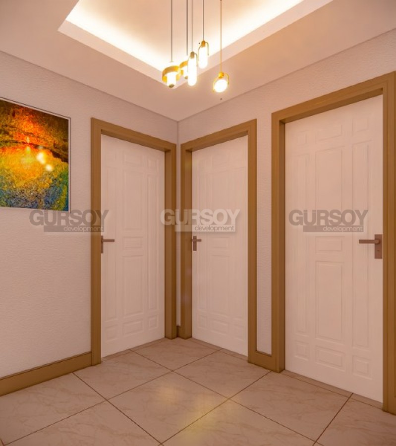 Кухонные столешницы выполнены из мрамора, а шкафы изготовлены из материала высокого качества. Используемые смесители изготовлены из нержавеющей хромированной стали. Во всех комнатах квартиры используется керамическая плитка. Внутренние помещения здания и квартиры оформлены подвесными потолками. Окна ПВХ с двойным остеклением, обеспечивающим тепло- и звукоизоляцию, а также обладают двухсторонней функцией открывания. Вход в квартиры оснащен стальными дверями с системой 25-точечной блокировки. Качественные внутренние лакированные двери.
