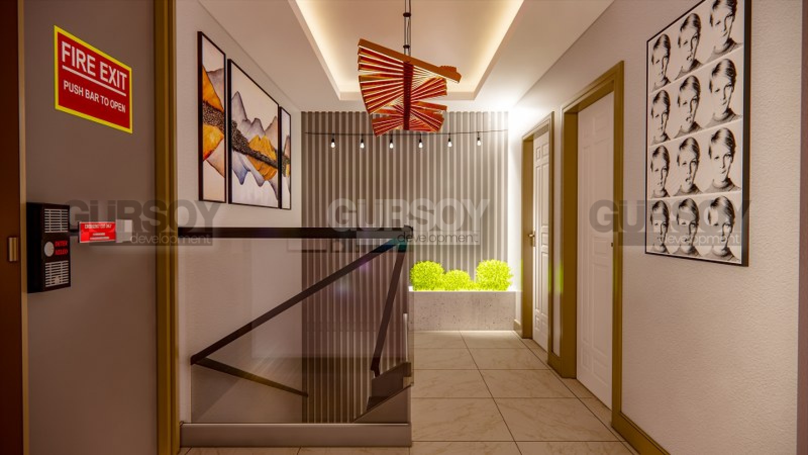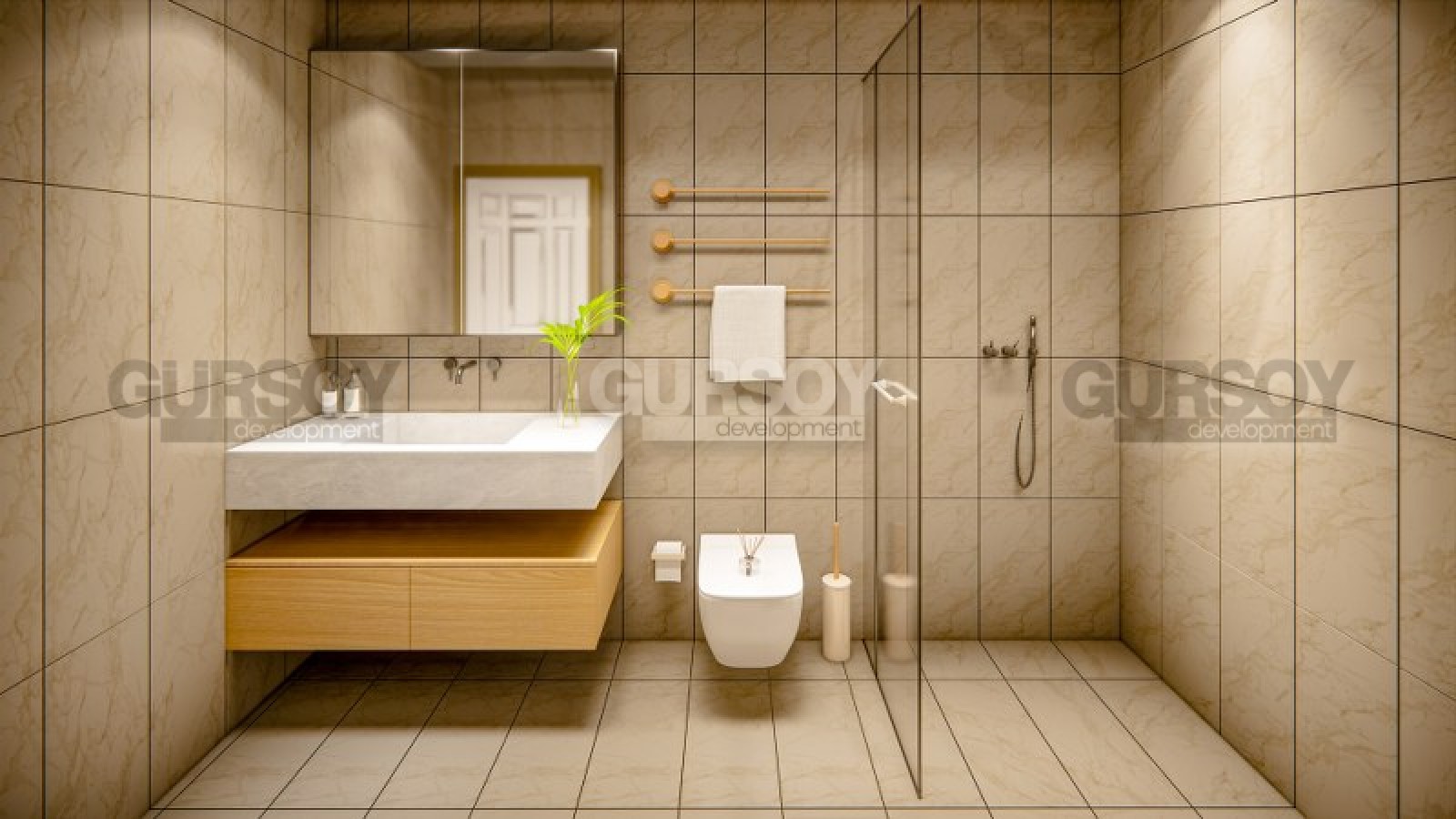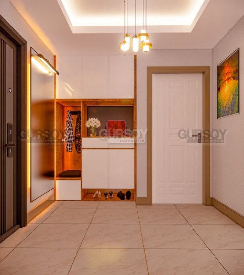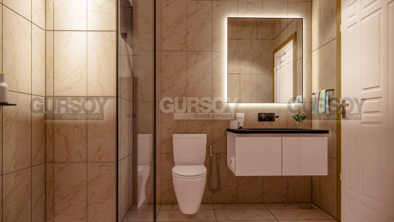 Кухонные столешницы выполнены из мрамора, а шкафы изготовлены из материала высокого качества. Используемые смесители изготовлены из нержавеющей хромированной стали. Во всех комнатах квартиры используется керамическая плитка. Внутренние помещения здания и квартиры оформлены подвесными потолками. Окна ПВХ с двойным остеклением, обеспечивающим тепло- и звукоизоляцию, а также обладают двухсторонней функцией открывания. Вход в квартиры оснащен стальными дверями с системой 25-точечной блокировки. Качественные внутренние лакированные двери.