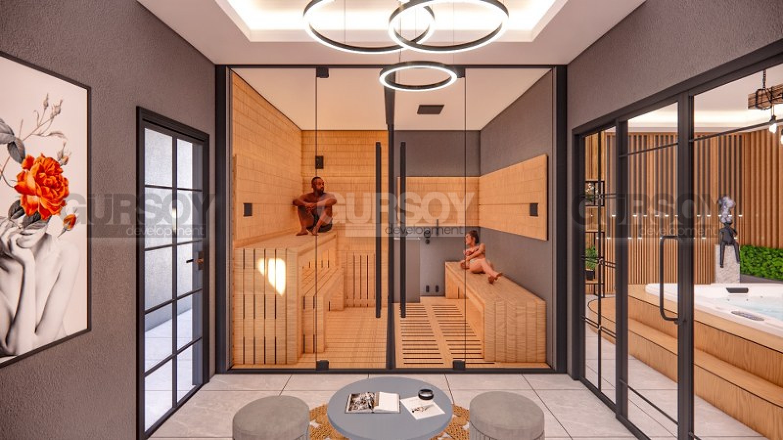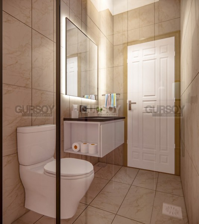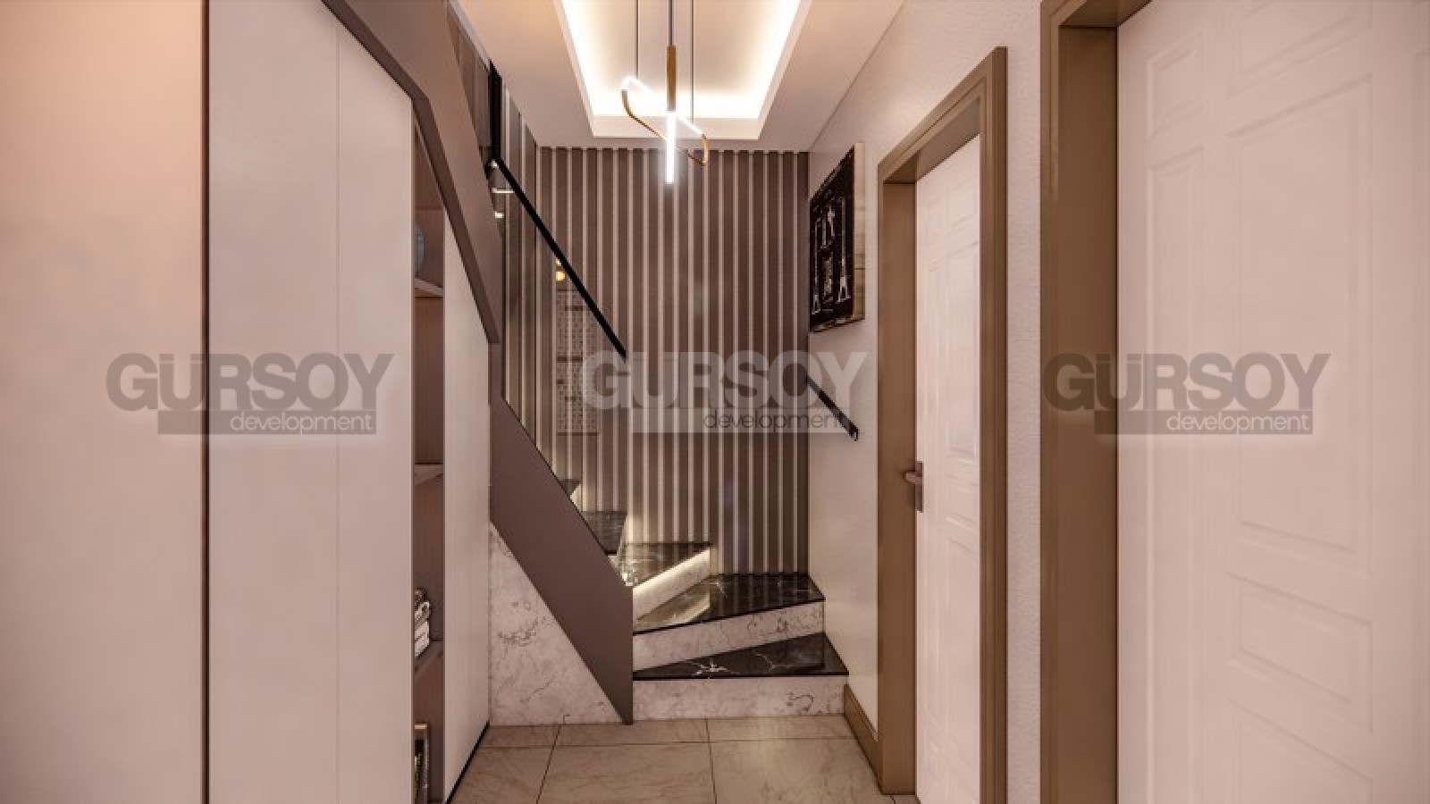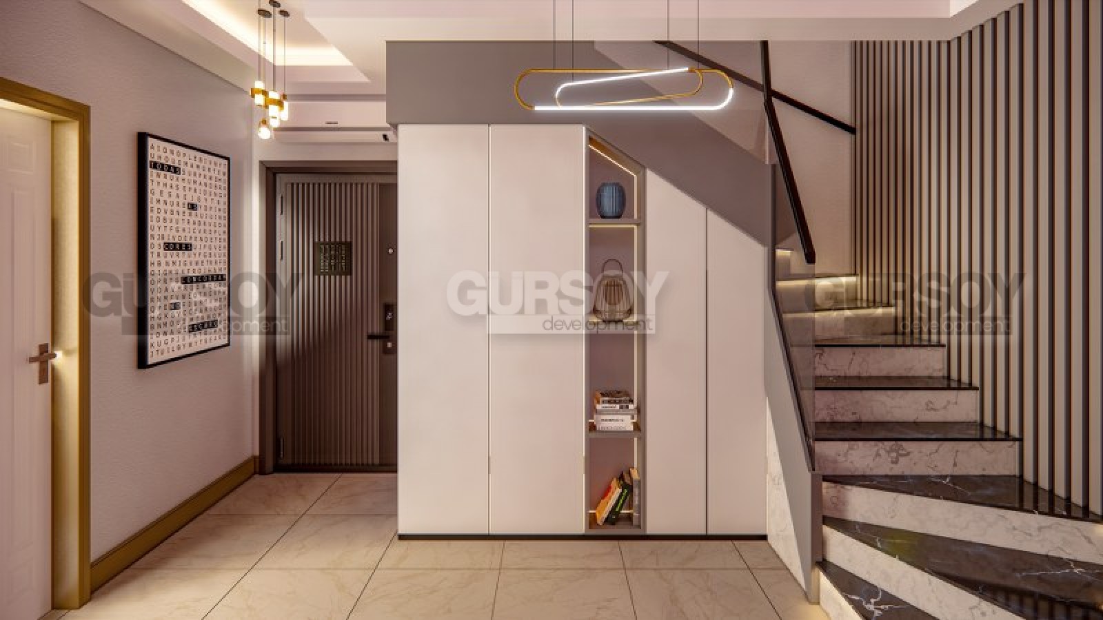 Кухонные столешницы выполнены из мрамора, а шкафы изготовлены из материала высокого качества. Используемые смесители изготовлены из нержавеющей хромированной стали. Во всех комнатах квартиры используется керамическая плитка. Внутренние помещения здания и квартиры оформлены подвесными потолками. Окна ПВХ с двойным остеклением, обеспечивающим тепло- и звукоизоляцию, а также обладают двухсторонней функцией открывания. Вход в квартиры оснащен стальными дверями с системой 25-точечной блокировки. Качественные внутренние лакированные двери.