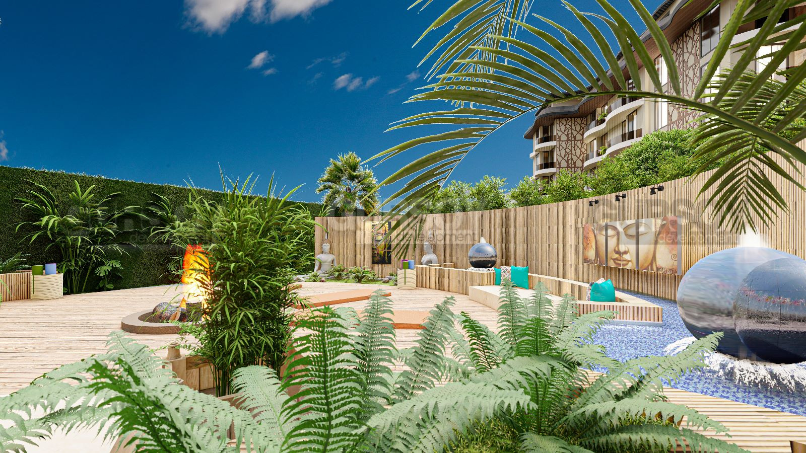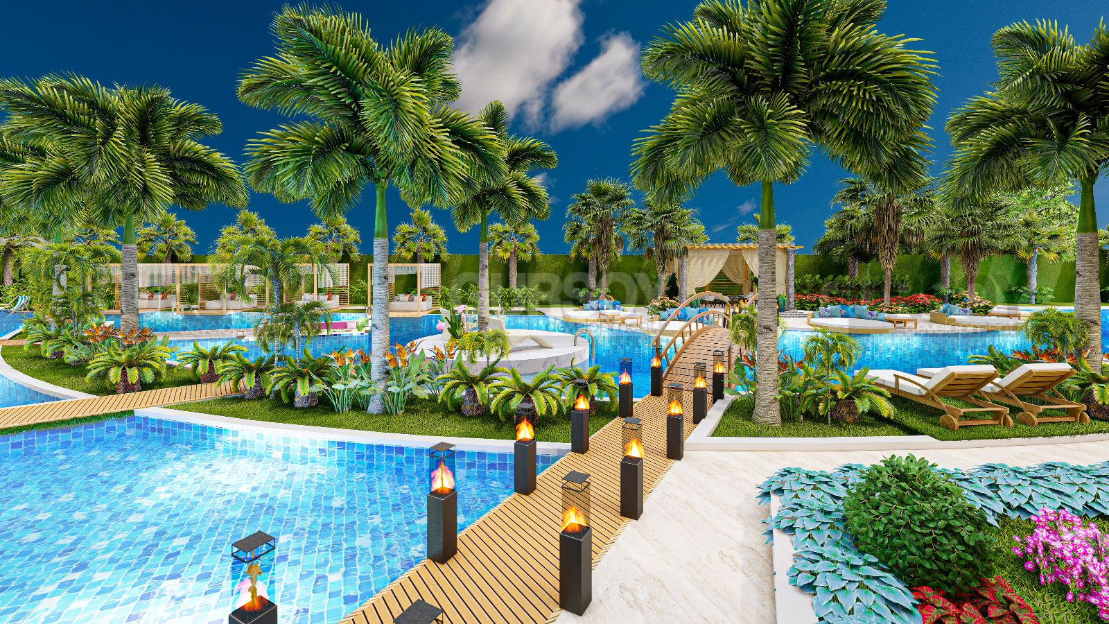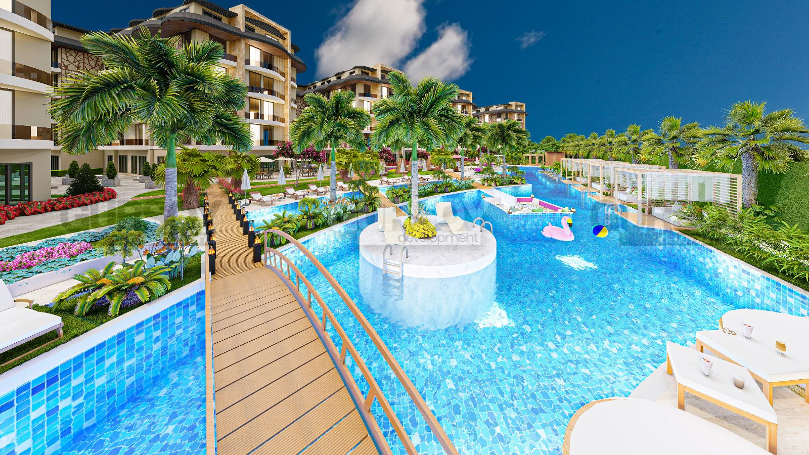 Открытый бассейн площадью 700 м² с джакузи и детским бассейном предоставит возможность для отдыха на свежем воздухе. Кинотеатр под открытым небом, зоны отдыха, место для занятия йогой, working space, библиотека, бильярд и настольный теннис - это всё, что нужно для комфортного отдыха и развлечений в любое время дня и ночи.