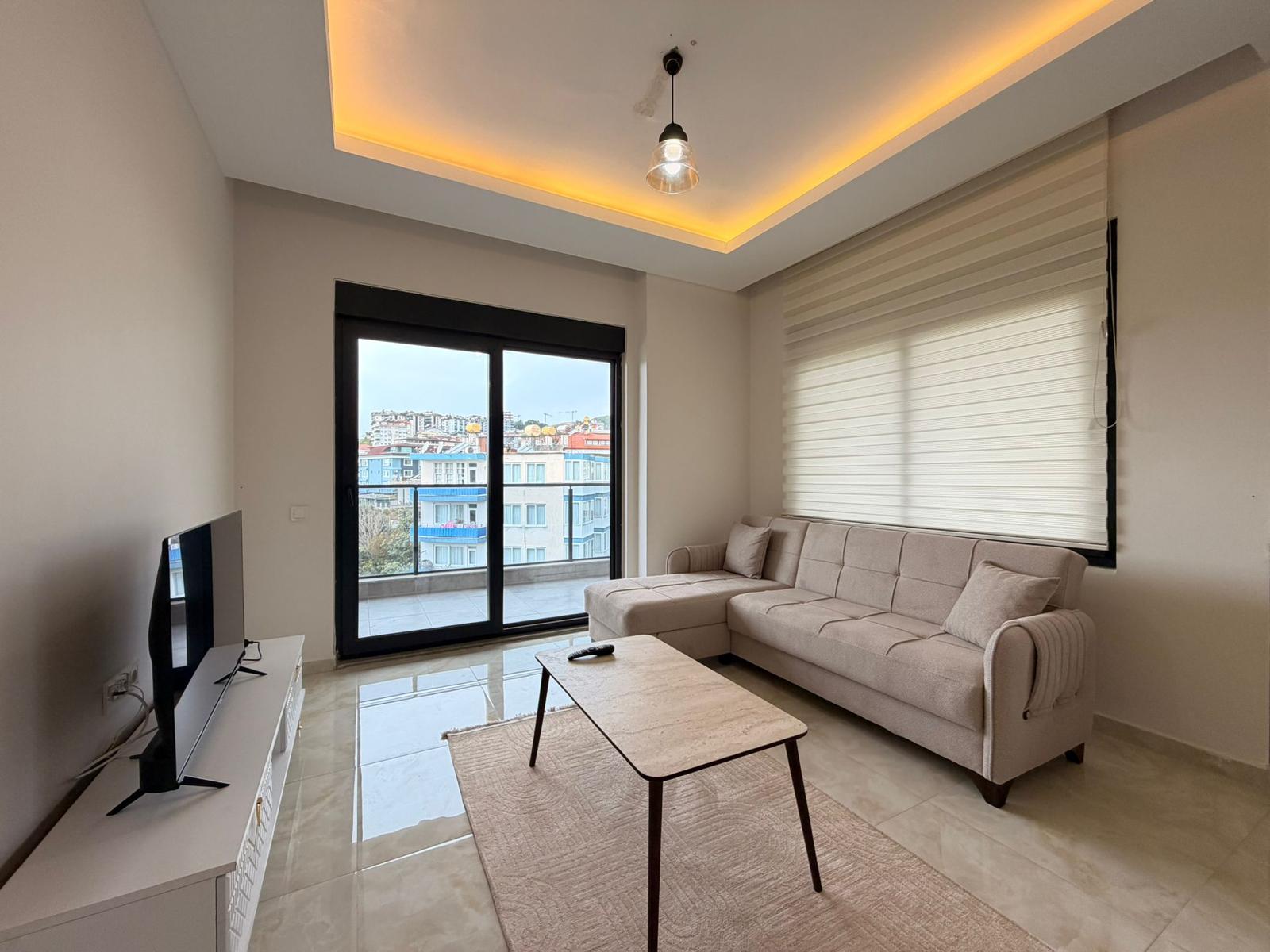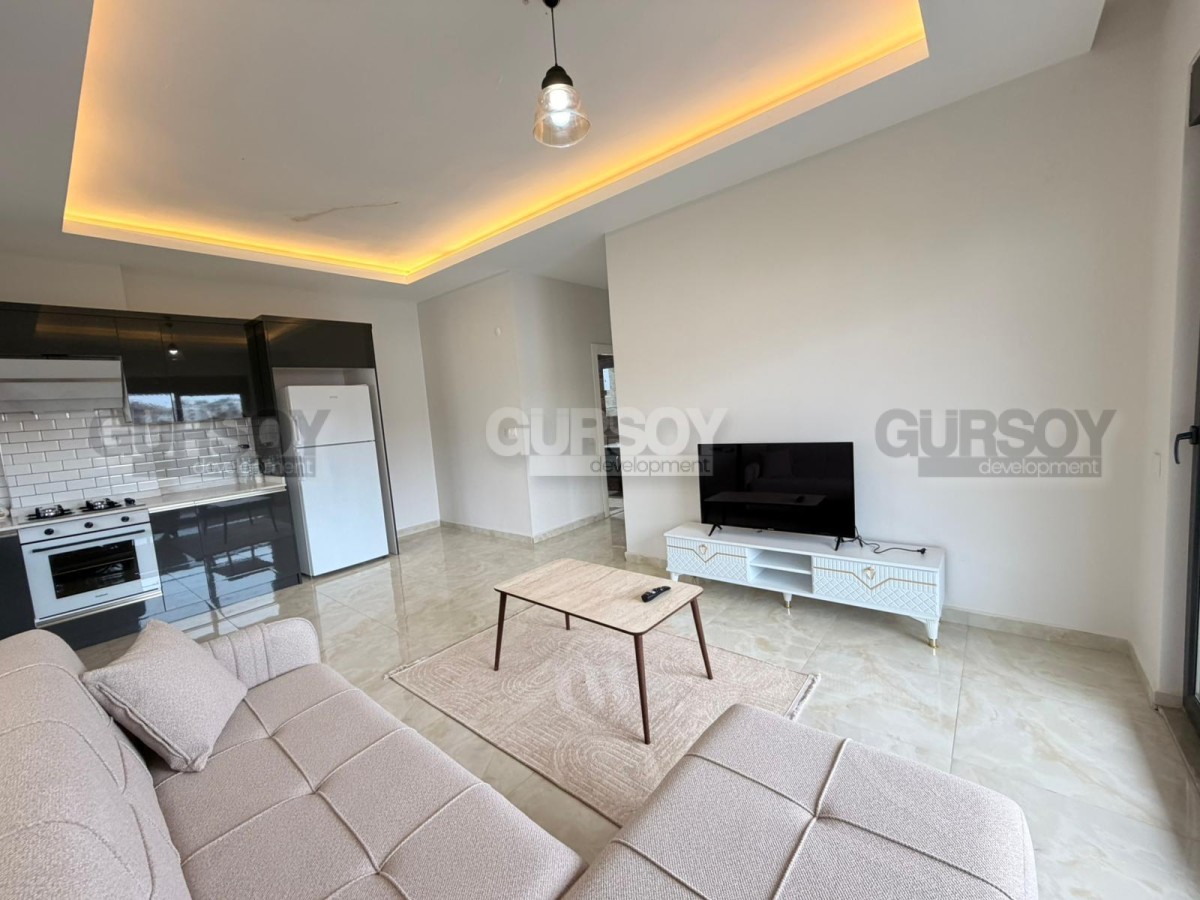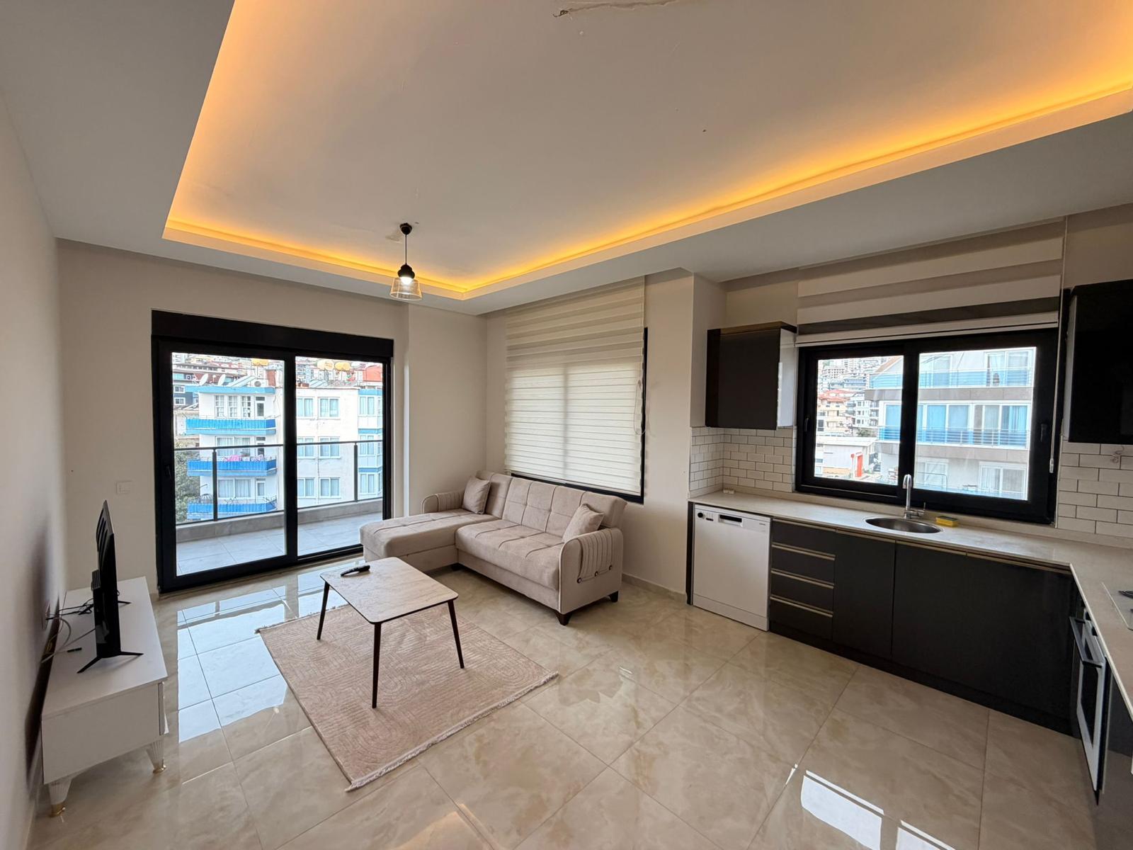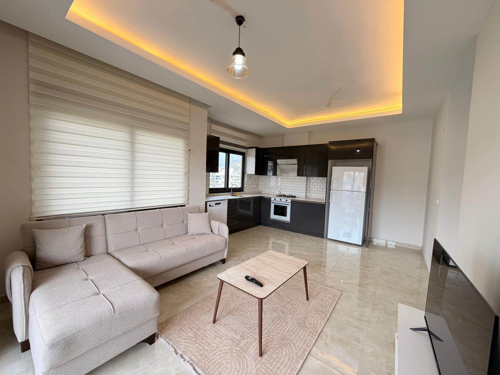 Предлагается к продаже квартира 1+1 общей площадью 60 м², расположенная на 4 этаже в районе Оба. Дом новый, возраст около 1 года, современный пятиэтажный жилой комплекс. Квартира продаётся с мебелью, имеет балкон, планировка включает гостиную с кухней американского типа, спальню и санузел.