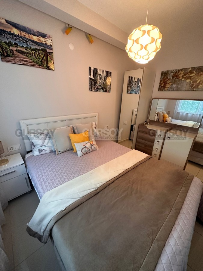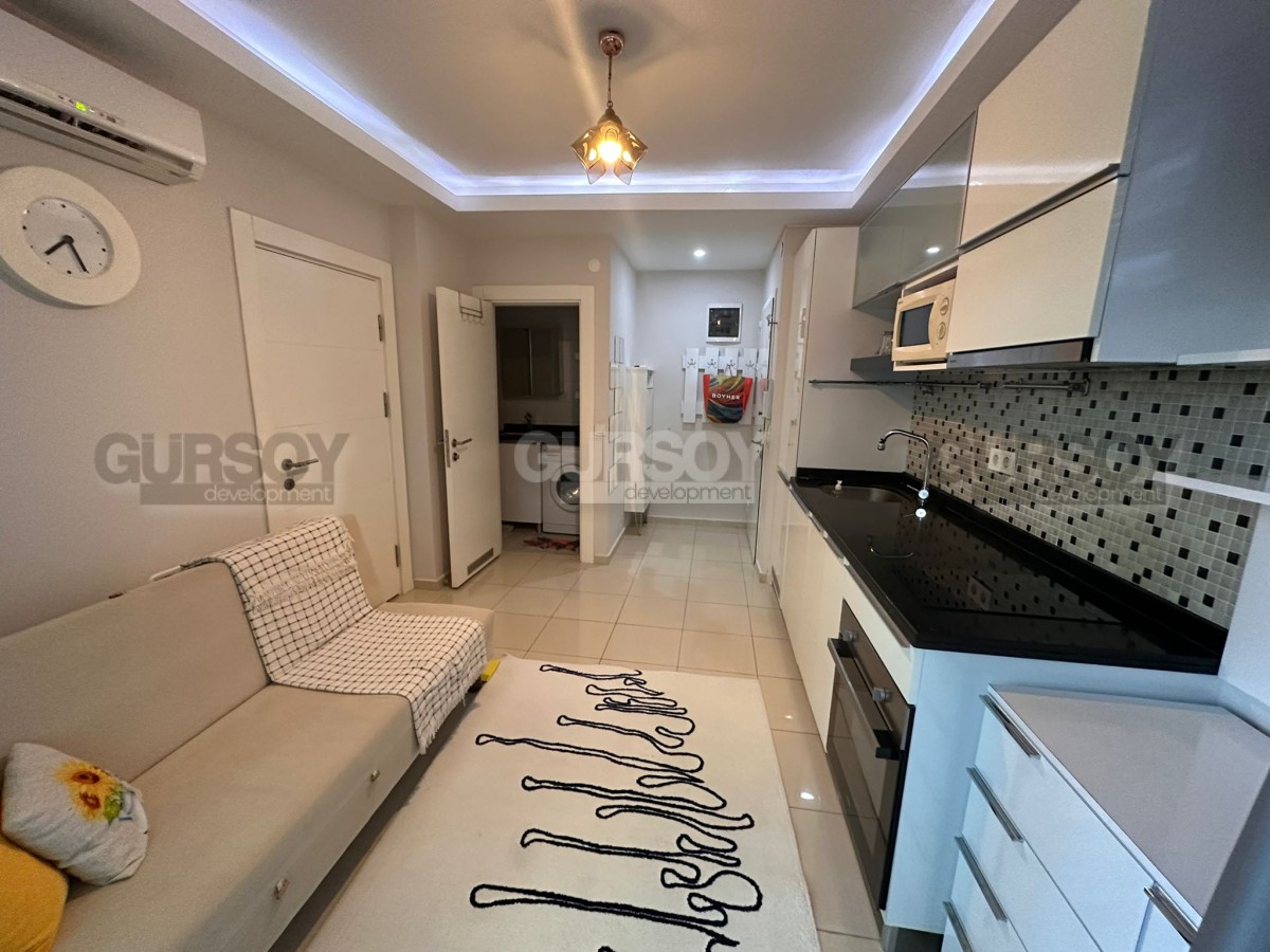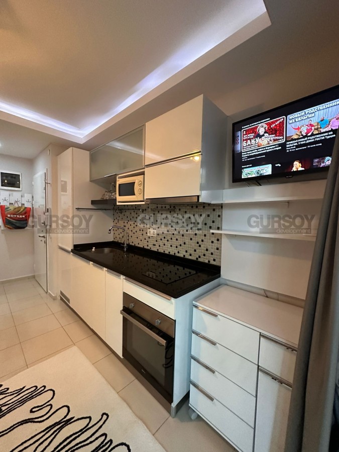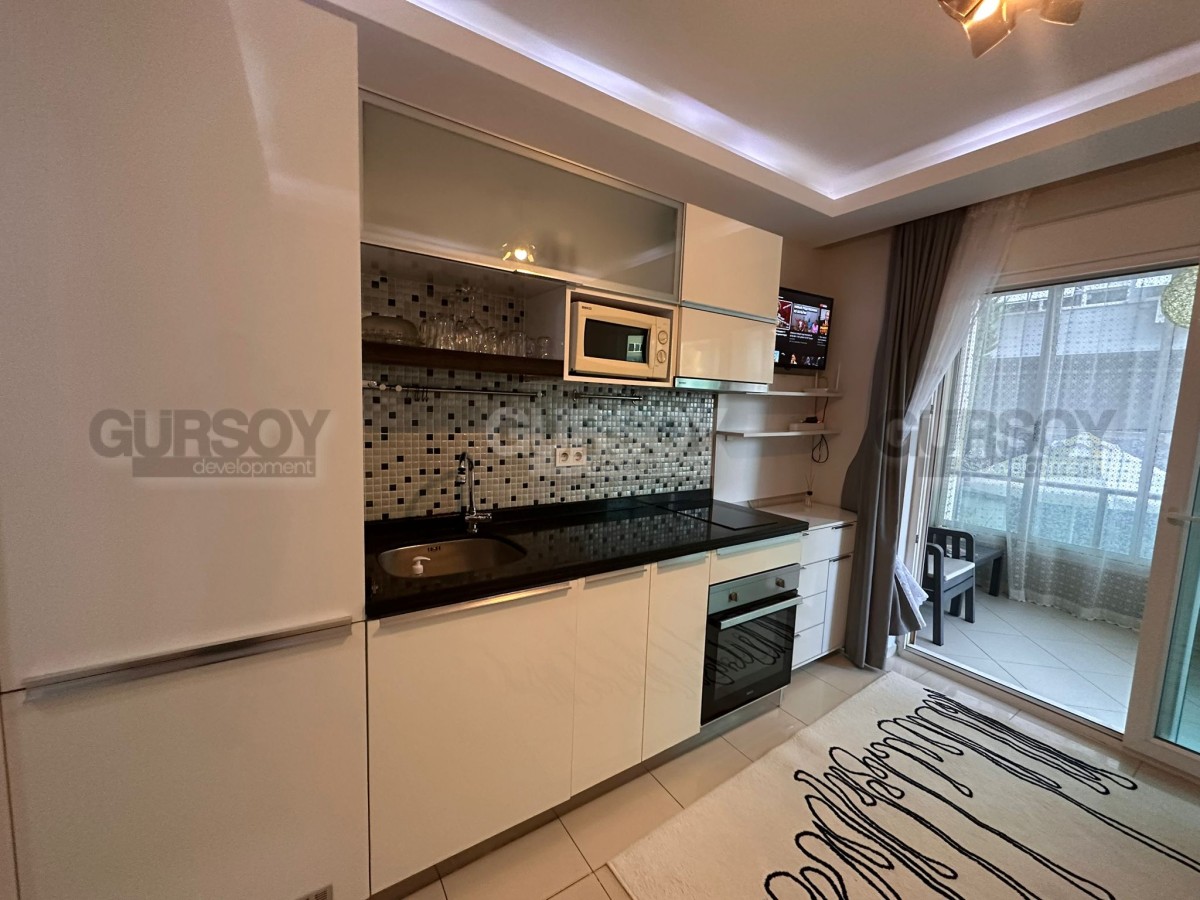 Компания Gürsoy Development представляет вашему вниманию меблированную квартиру 1+1 всего в 400 метрах от моря в районе Оба. Площадь квартиры - 45 м2, а планировка 1+1 подразумевает наличие гостиной, совмещённой с кухней, спальни, ванной комнаты и застеклённого балкона. Квартира продаётся с мебелью, бытовой техникой, кондиционерами и LED освещением, как представлено на фотографиях. Ванная комната оборудована душевой кабиной и сантехникой, есть стиральная машина и проточный водонагреватель. Квартира расположена на первом этаже 4-этажного жилого комплекса 2014 года постройки. С балкона открывается чудесный вид на бассейн.