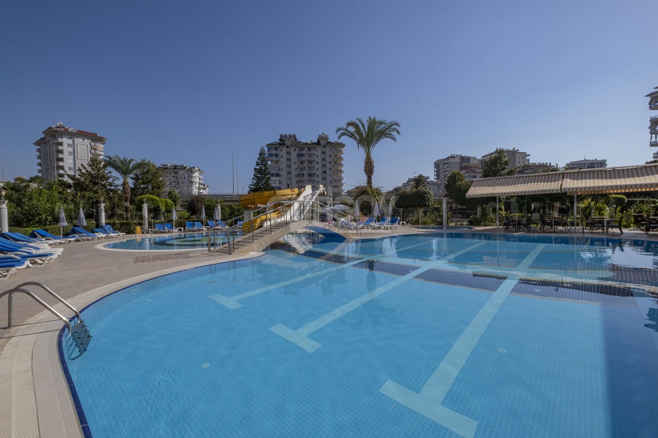 На территории комплекса есть: открытый и крытый бассейны, сауна и паровая баня, турецкий хаммам, детский бассейн, массажный кабинет и спа-салон, фитнес-центр, игровая комната, детская игровая площадка, теннисный корт, парковочное место, трансфер до пляжа, беседка и барбекю, водная горка.