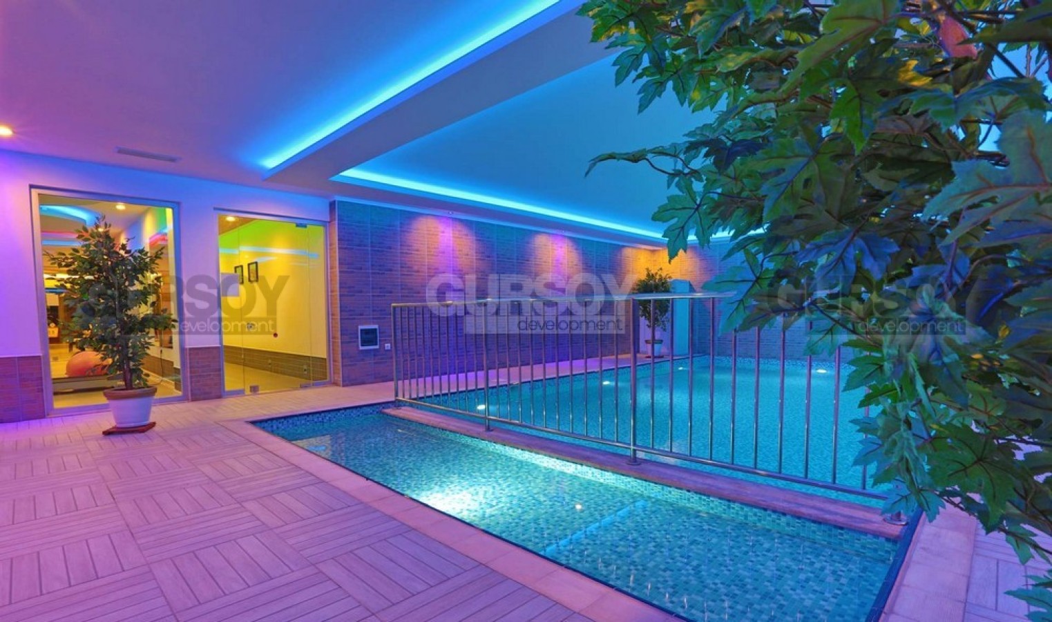 Площадь квартиры - 90 кв.м, а планировка 2+1 подразумевает наличие гостиной, совмещённой с кухней, 2 спален, ванной комнаты и балкона. Квартира продаётся с полным комплектом мебели, бытовой техникой, кондиционерами, точечным освещением и LED-подсветкой. Квартира расположена на 1-м этаже 8-этажного элитного жилого комплекса. Квартира выходит сразу на три стороны света - юг, восток и запад. С балкона и террасы открывается прекрасный вид на хвойный лес и ухоженную территорию комплекса.