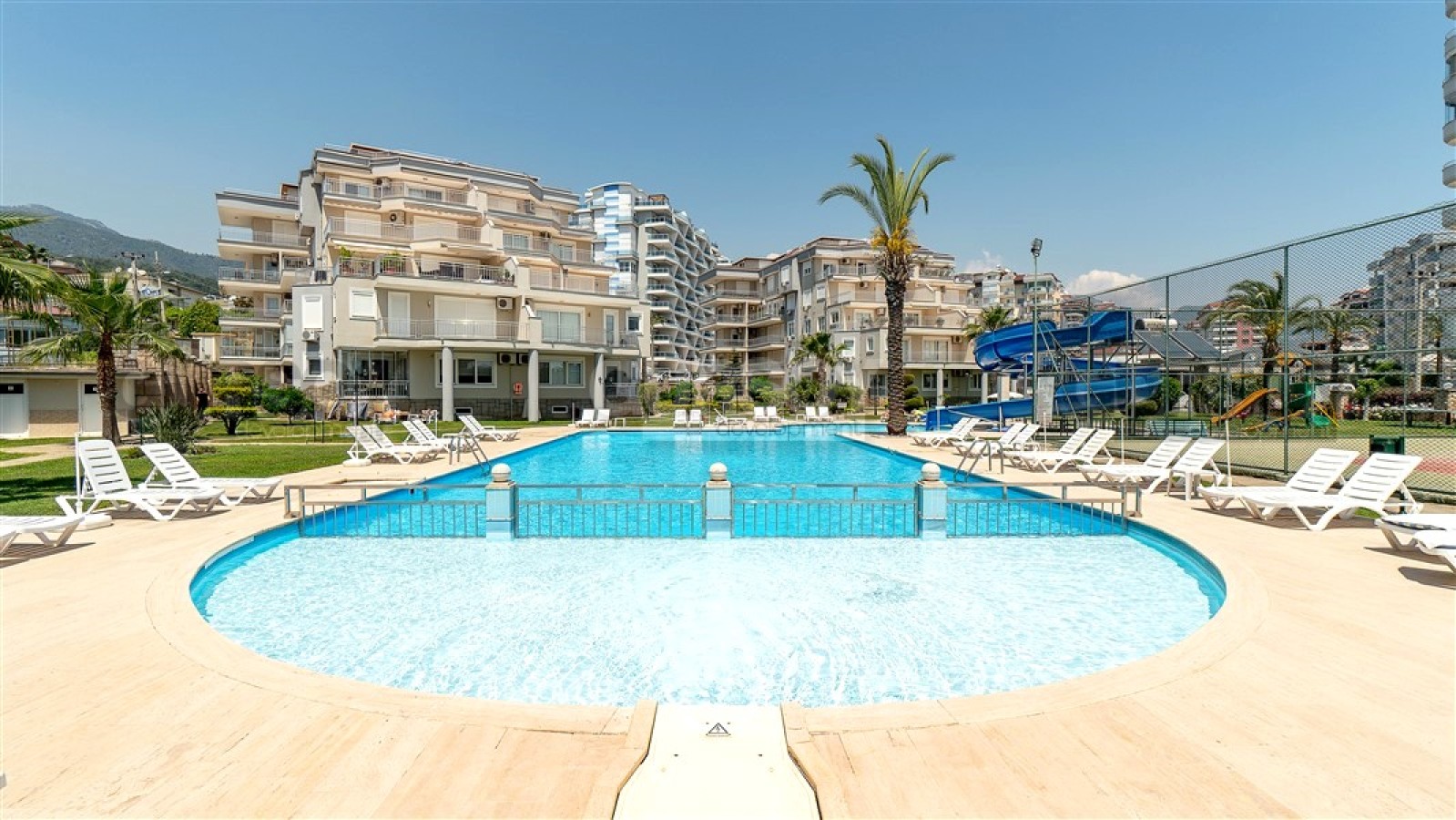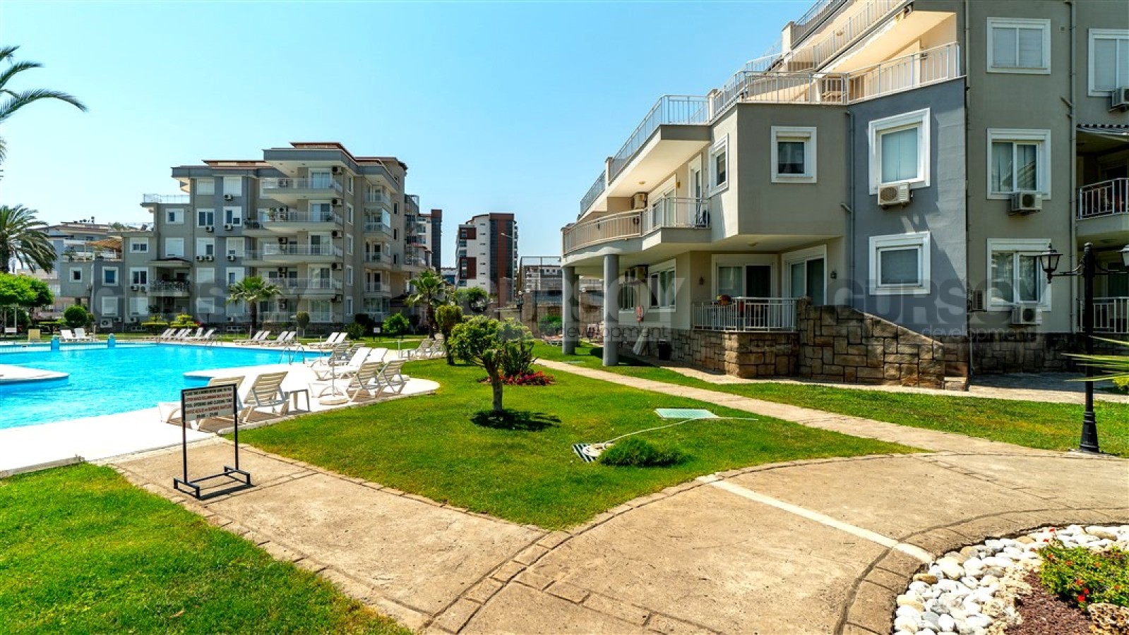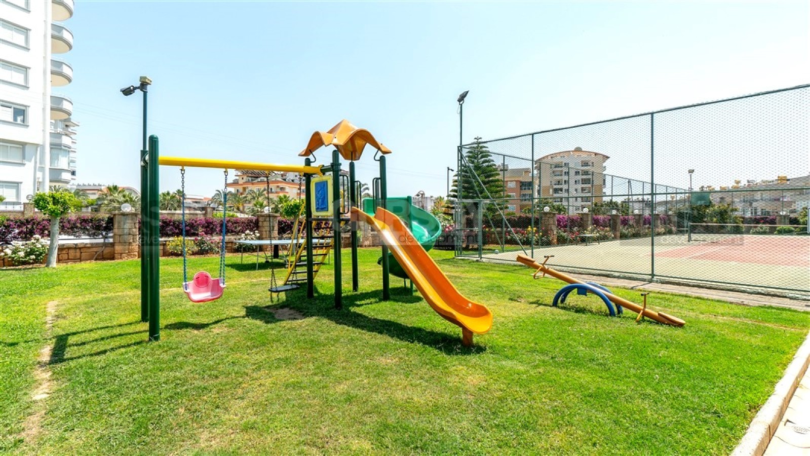 Резиденция расположена на обширной огороженной территории, утопающей в зелени и цветах, создавая атмосферу спокойствия и уюта. Комплекс состоит из четырех блоков и обладает разнообразной инфраструктурой: большой бассейн с горками, детский бассейн, теннисный корт, баскетбольная площадка, зона для барбекю и детская игровая площадка. Для обеспечения безопасности установлена система видеонаблюдения. До моря всего 850 метров, что позволяет регулярно наслаждаться морским бризом и прогулками вдоль побережья.