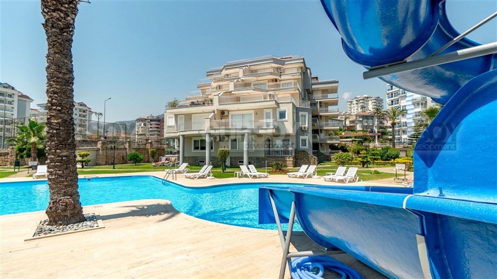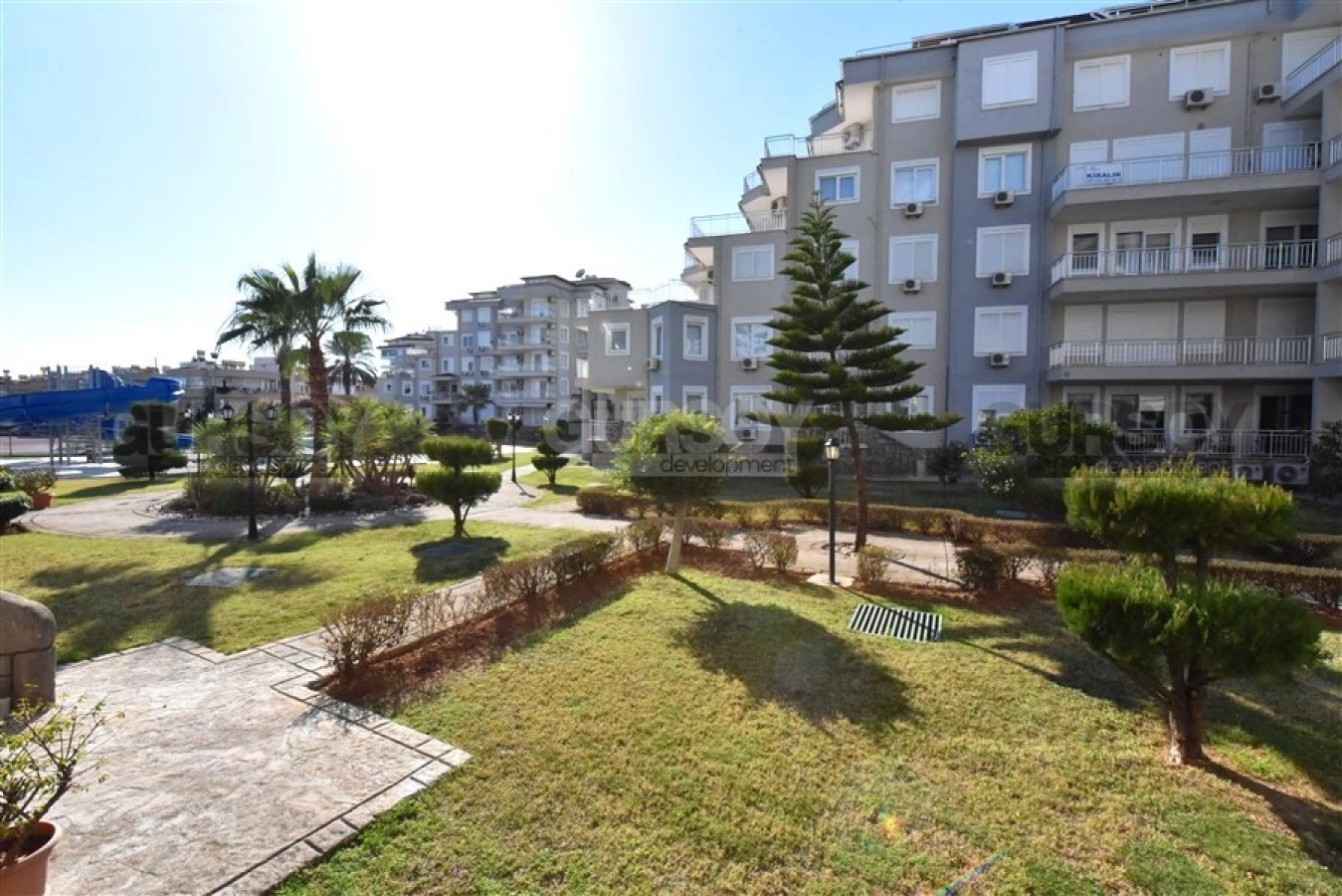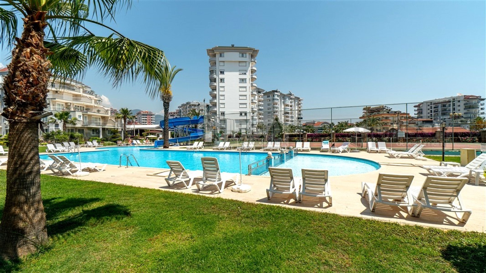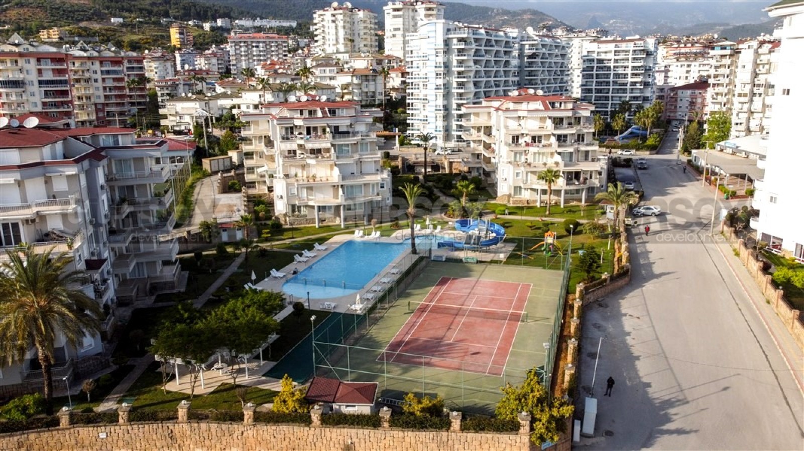Резиденция расположена на обширной огороженной территории, утопающей в зелени и цветах, создавая атмосферу спокойствия и уюта. Комплекс состоит из четырех блоков и обладает разнообразной инфраструктурой: большой бассейн с горками, детский бассейн, теннисный корт, баскетбольная площадка, зона для барбекю и детская игровая площадка. Для обеспечения безопасности установлена система видеонаблюдения. До моря всего 850 метров, что позволяет регулярно наслаждаться морским бризом и прогулками вдоль побережья.