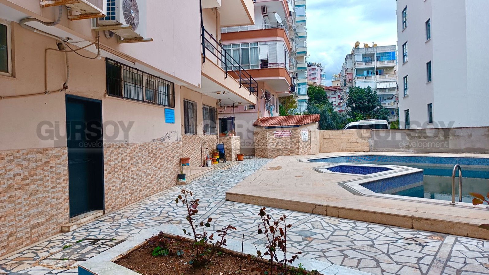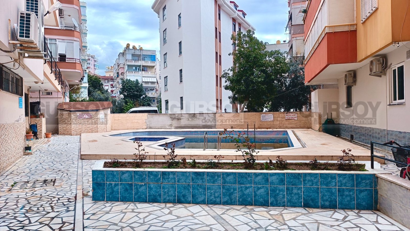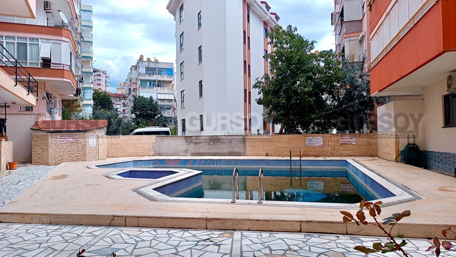 Квартира расположена на 4-м этаже 5-этажного жилого комплекса 2000 года постройки. На территории комплекса есть открытый плавательный бассейн, лифт и депо. Расстояние до прекрасного пляжа, который отличается чистой и прозрачной водой - 600 метров. Район с прекрасно развитой инфраструктурой - в шаговой доступности магазины, супермаркеты, пекарни, кафе, аптеки, банки, центральный рынок и т. д.