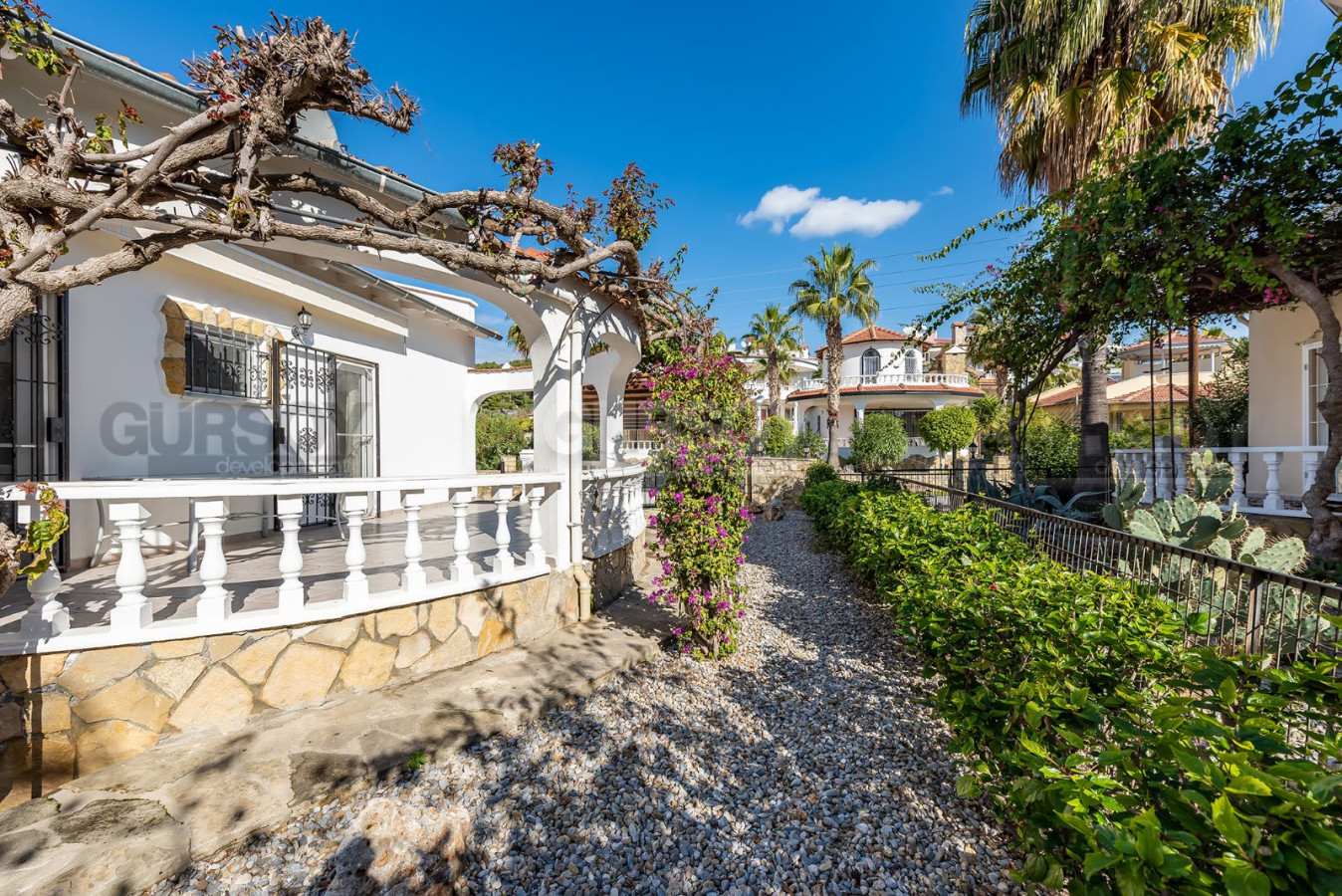 Вилла украшена красивыми цветами и кустарниками на ее территории, создавая уютную и комфортную атмосферу для жизни. На территории комплекса вилл есть открытый бассейн и парковка.