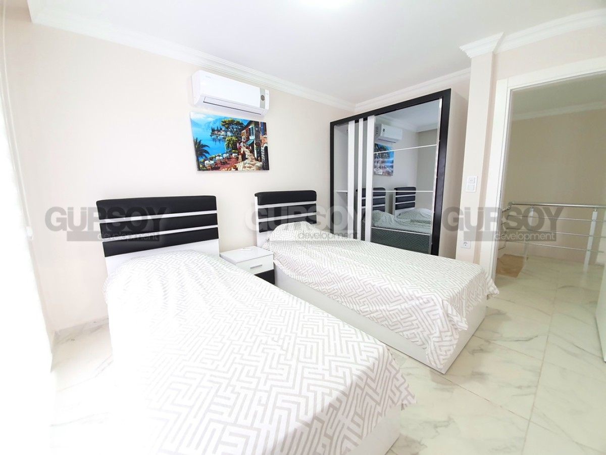 Представляем вашему вниманию двухуровневую квартиру 2+1, расположенную на последних этажах современного комплекса в Махмутларе. Эта квартира станет настоящим оазисом для тех, кто ценит комфорт и потрясающие виды. Терраса дуплекса открывает боковой вид на море и прямой вид на величественные горы, создавая идеальное место для утреннего кофе или вечерних посиделок. Внутри квартиры вас ждет американская кухня, объединенная с гостиной, две уютные спальни, две стильные ванные комнаты, два балкона и просторная терраса. Продается с мебелью и бытовой техникой, что делает ее готовой для проживания сразу после покупки.