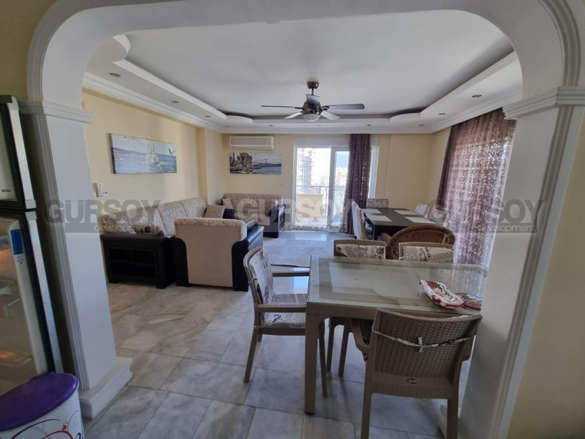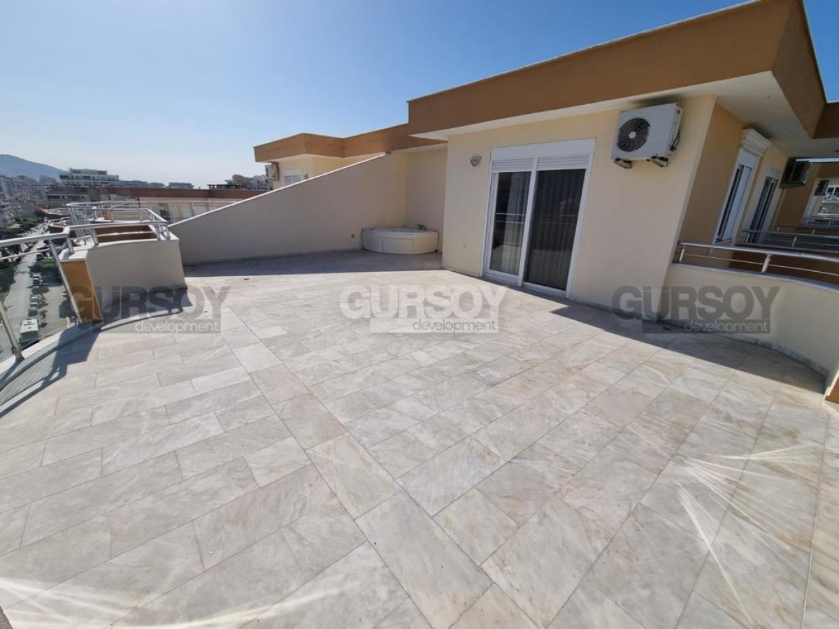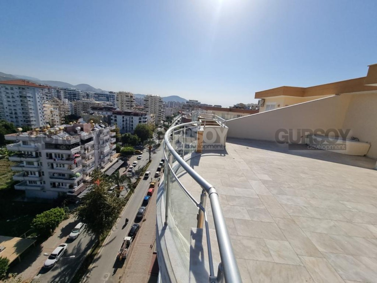 Площадь квартиры - 260 м2. Двухуровневая квартира расположена на 11-м и 12-м этажах 12-этажного жилого комплекса 2007 года постройки. Планировка 4+1 подразумевает наличие гостиной, совмещённой с кухней, 4 спален, 3 ванных комнат, сауны, 2 балконов и террасы. Квартира продаётся с полным комплектом стильной мебели, бытовой техникой, кондиционерами и точечным освещением. Ванные комнаты укомплектованы сантехникой, есть ванна и джакузи. С балконов и просторной террасы открываются великолепные виды на Средиземное море, пёстрые пальмы и Таврские горы.