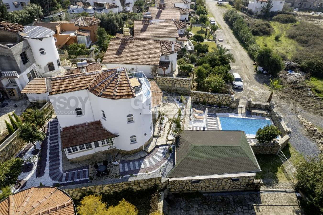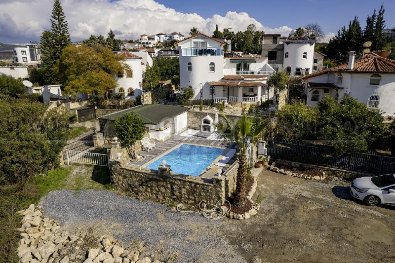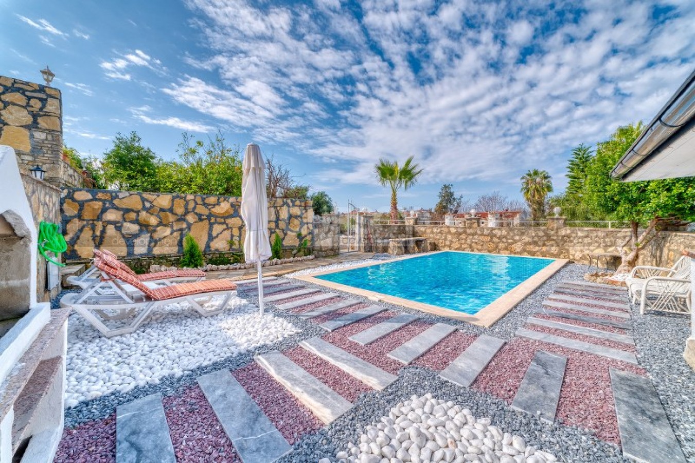 На прилегающей территории виллы вас порадует открытый бассейн для расслабляющих водных процедур, удобная парковка, кладовая для хранения вещей, а также ухоженный зеленый сад, который станет идеальным местом для отдыха на свежем воздухе.