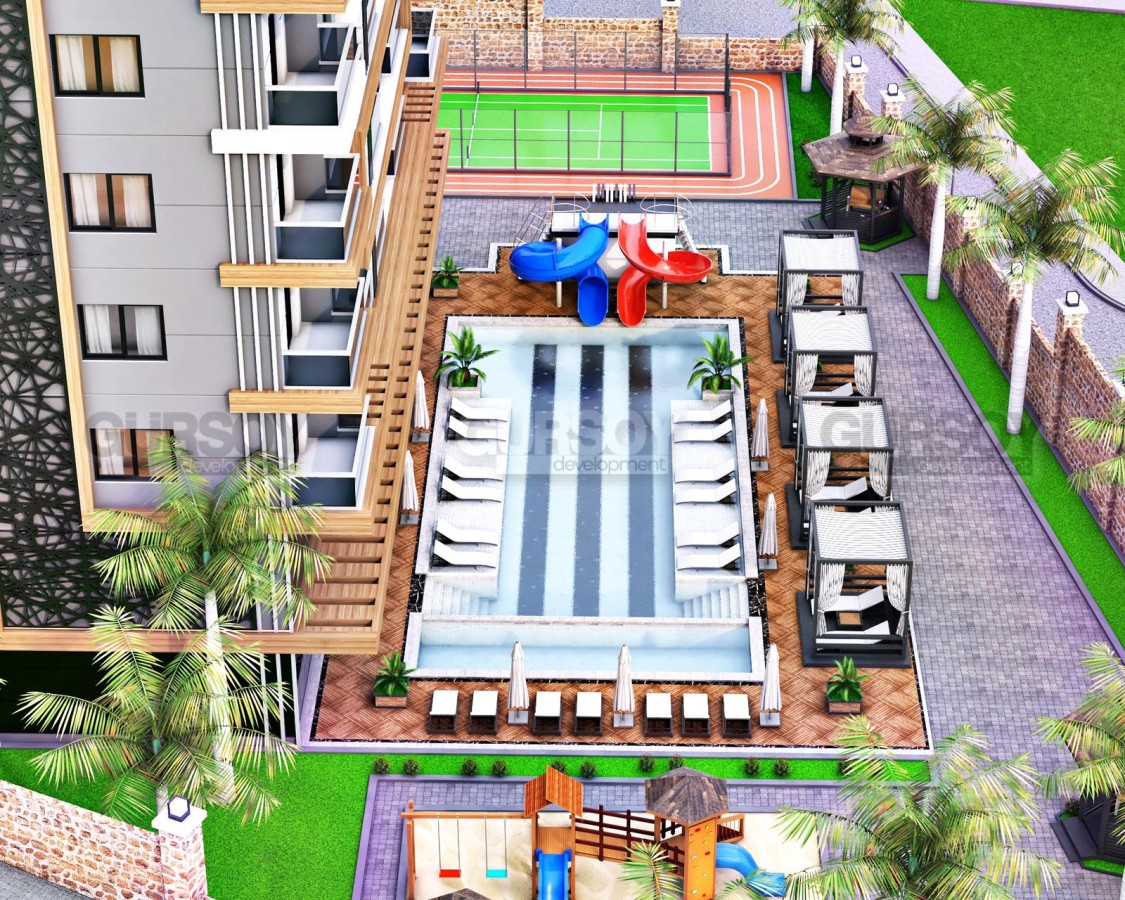 Комплекс удачно расположен в нескольких минутах ходьбы от моря, в центре района Тосмур, где сосредоточены магазины, аптеки, кафе, рестораны, остановки общественного транспорта, отделения банков, и все, что нужно для комфортной повседневной жизни.