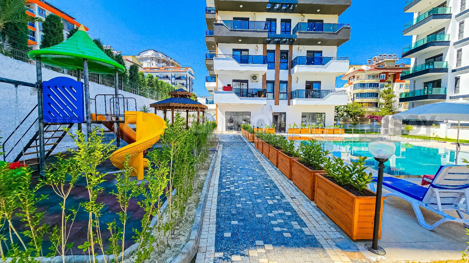Жилой комплекс находится на расстоянии 800 метров от моря в районе Авсаллар. Это живописный курортный район Алании с шикарными песчаными пляжами. Здесь очень развита инфраструктура: кафе и рестораны, супермаркеты и магазины, почта, банкоматы, детские и спортивные площадки, школы и салоны красоты.
