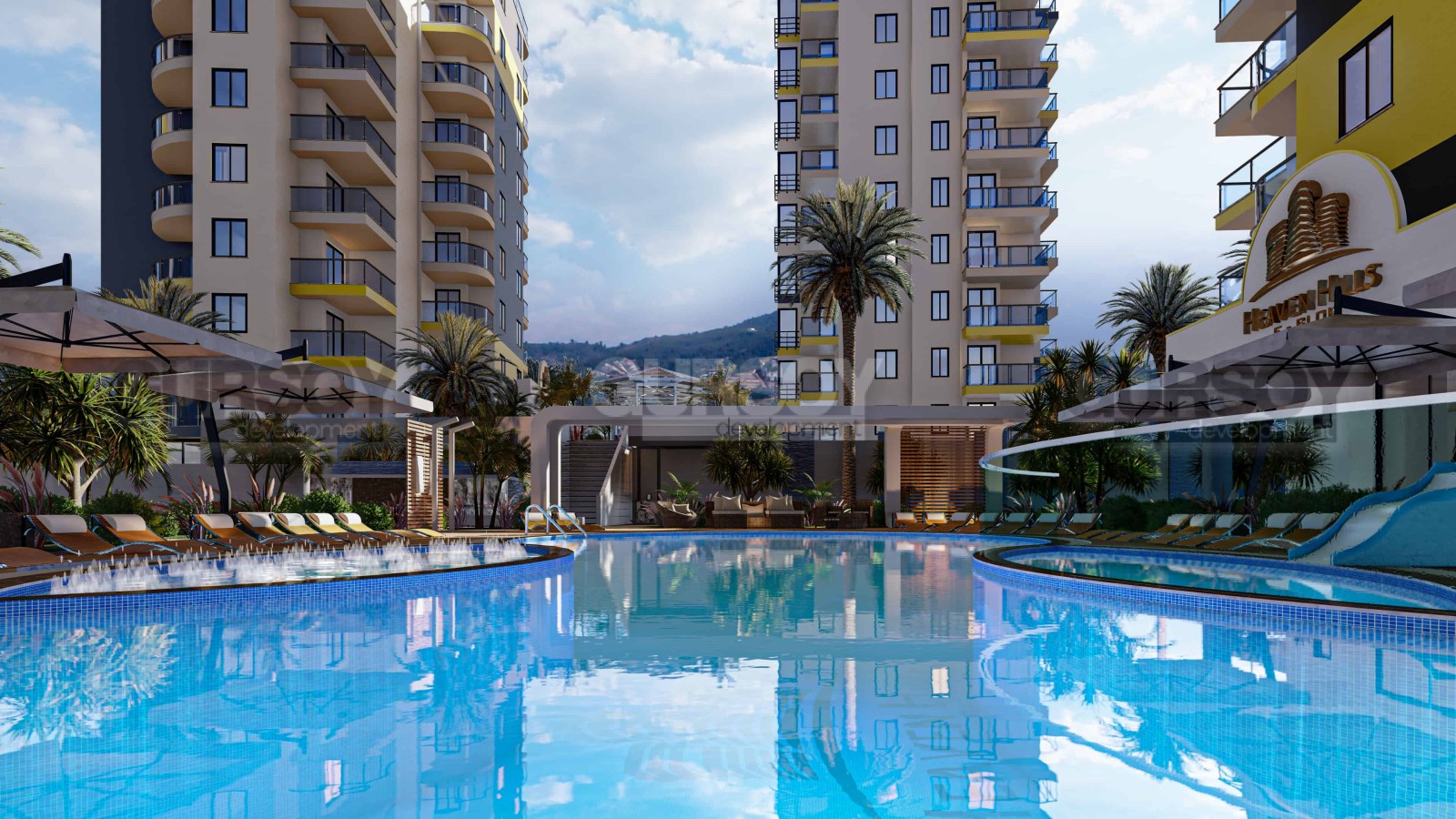 Здесь есть все! Что если все, о чём вы мечтаете, было бы в вашем жилом комплексе? Открытый и крытый бассейны, витаминный бар, тренажерный зал, сауна, турецкая баня, парные, джакузи, массажные кабинеты, автостоянка, баскетбольная площадка, игровая площадка, аквапарк, детские площадки и многое другое. Все, что вам нужно делать в этом жилом комплексе, - это жить так, как вам хочется.