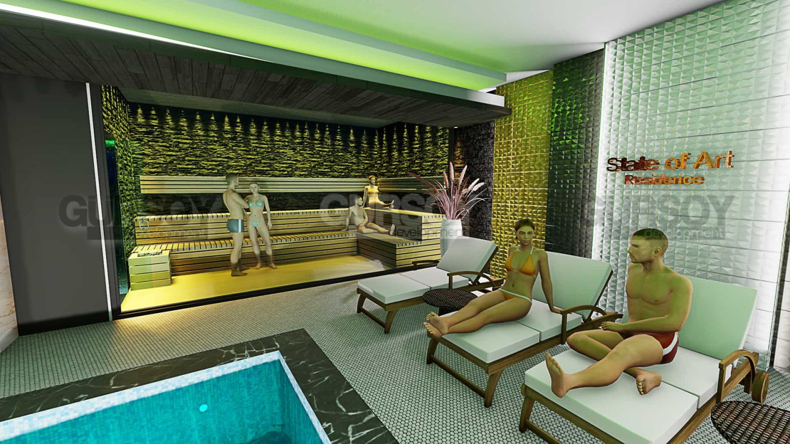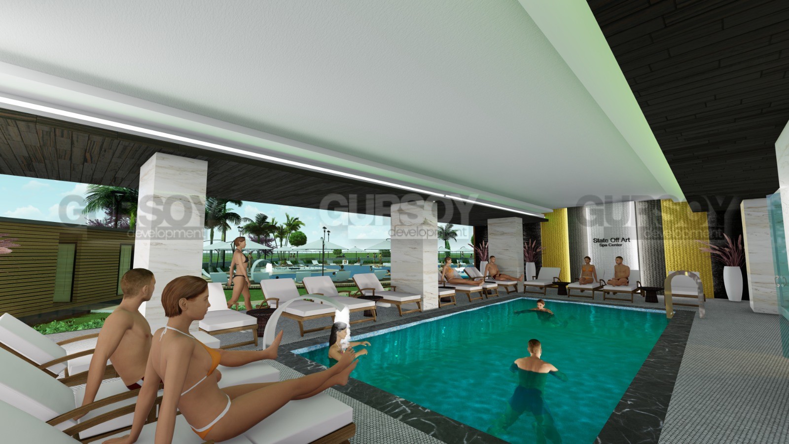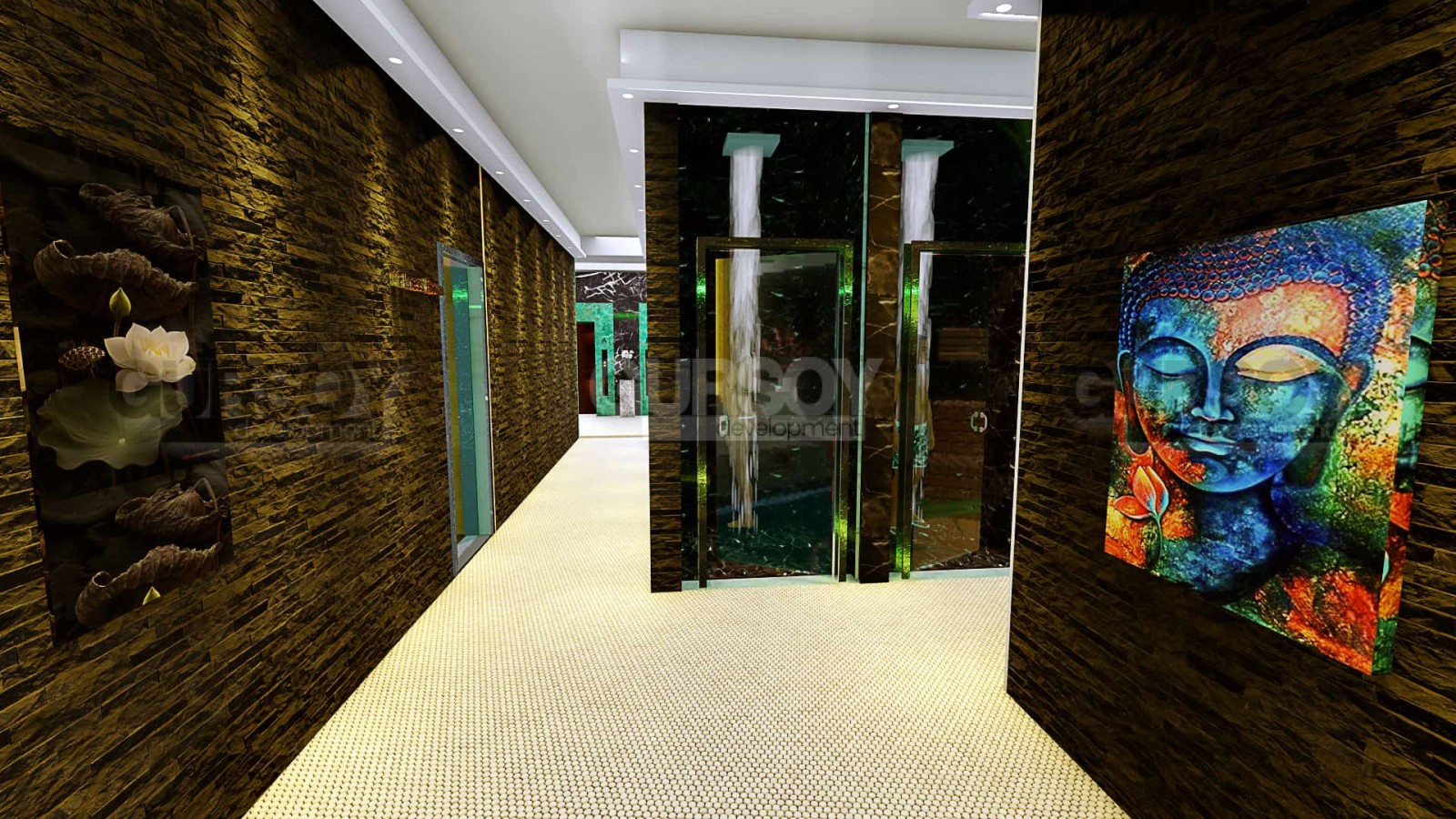 Вестибюль и ресепшн, спа-центр, мужские и женские раздевалки, сауна, паровая комната, снежный фонтан, джакузи, турецкая баня, комната отдыха, массажные кабинеты, крытый бассейн, фитнес-клуб, бильярдная для взрослых, детская игровая комната, кинотеатр.