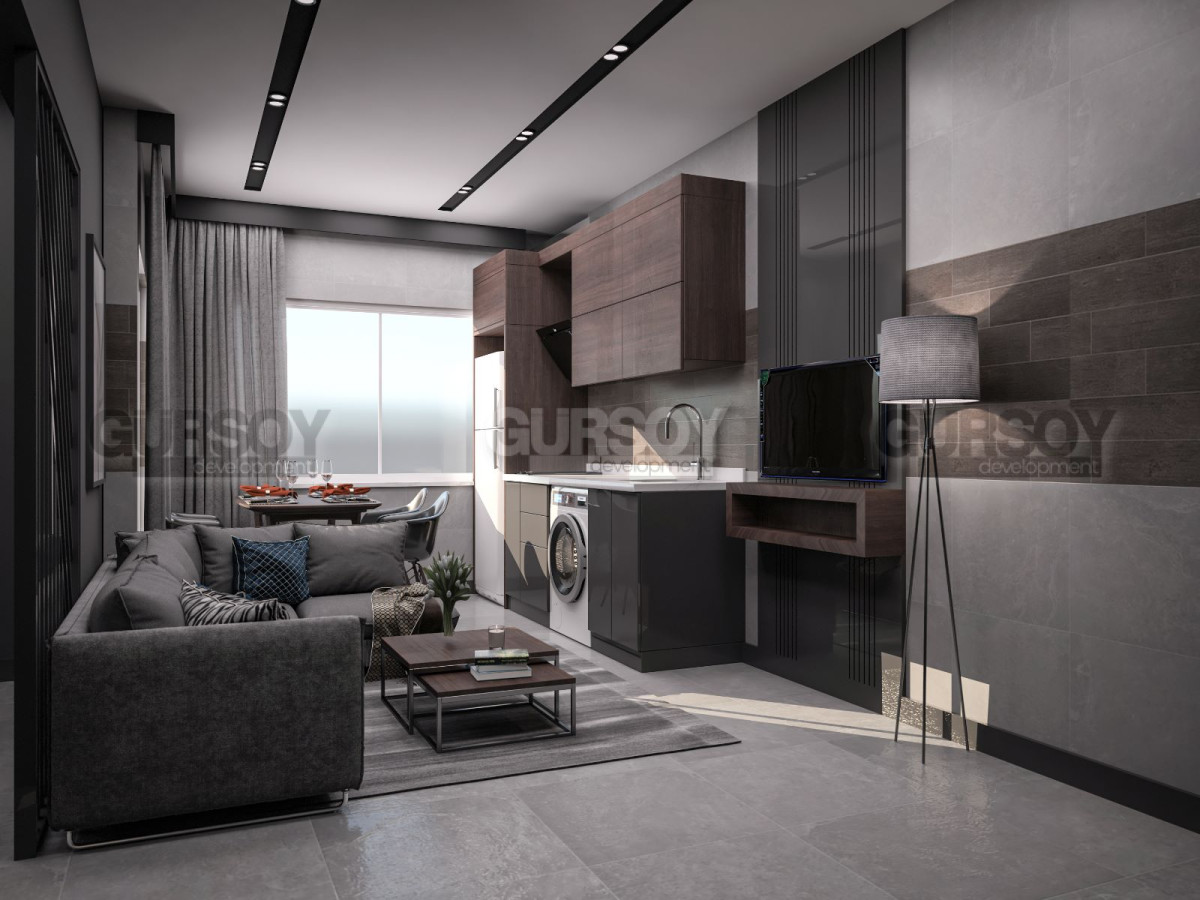 Новый уникальный проект в самом центре Алании, расположенный в районе Сарай, представляет собой реставрацию отеля и состоит из 20 квартир планировок 1+1 и студии 0+1. Квартиры сдаются с полным комплектом мебели и встроенной бытовой техникой марки VESTEL. В гостиной есть угловой диван и обеденный стол, а также угловые торшеры для освещения. В спальне есть кровать с базой и изголовьем, шкаф и светильники над кроватью. Кроме того, в квартире есть стиральная машина, 1 кондиционер, варочная поверхность на 2 конфорки, вытяжка, телевизор на подставке и зеркало в ванной комнате.