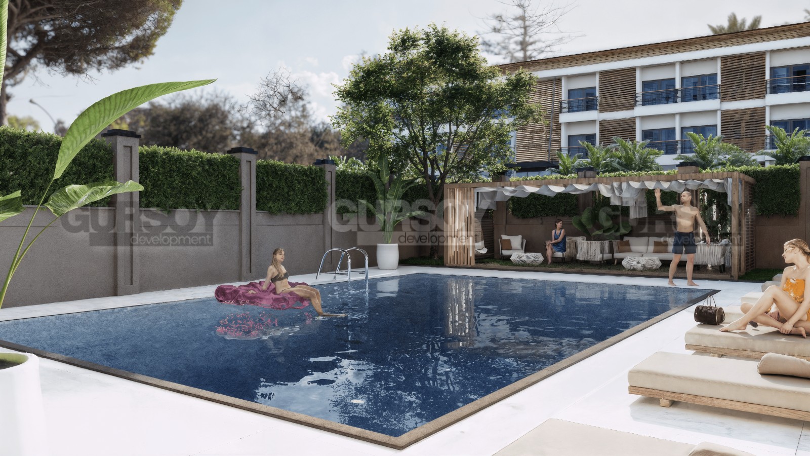 Инфраструктура комплекса: открытый плавательный бассейн, садовая зона с беседками, фитнес-зал, сауна, джакузи и детская игровая площадка. Территория будет благоустроена для комфортного отдыха круглый год.