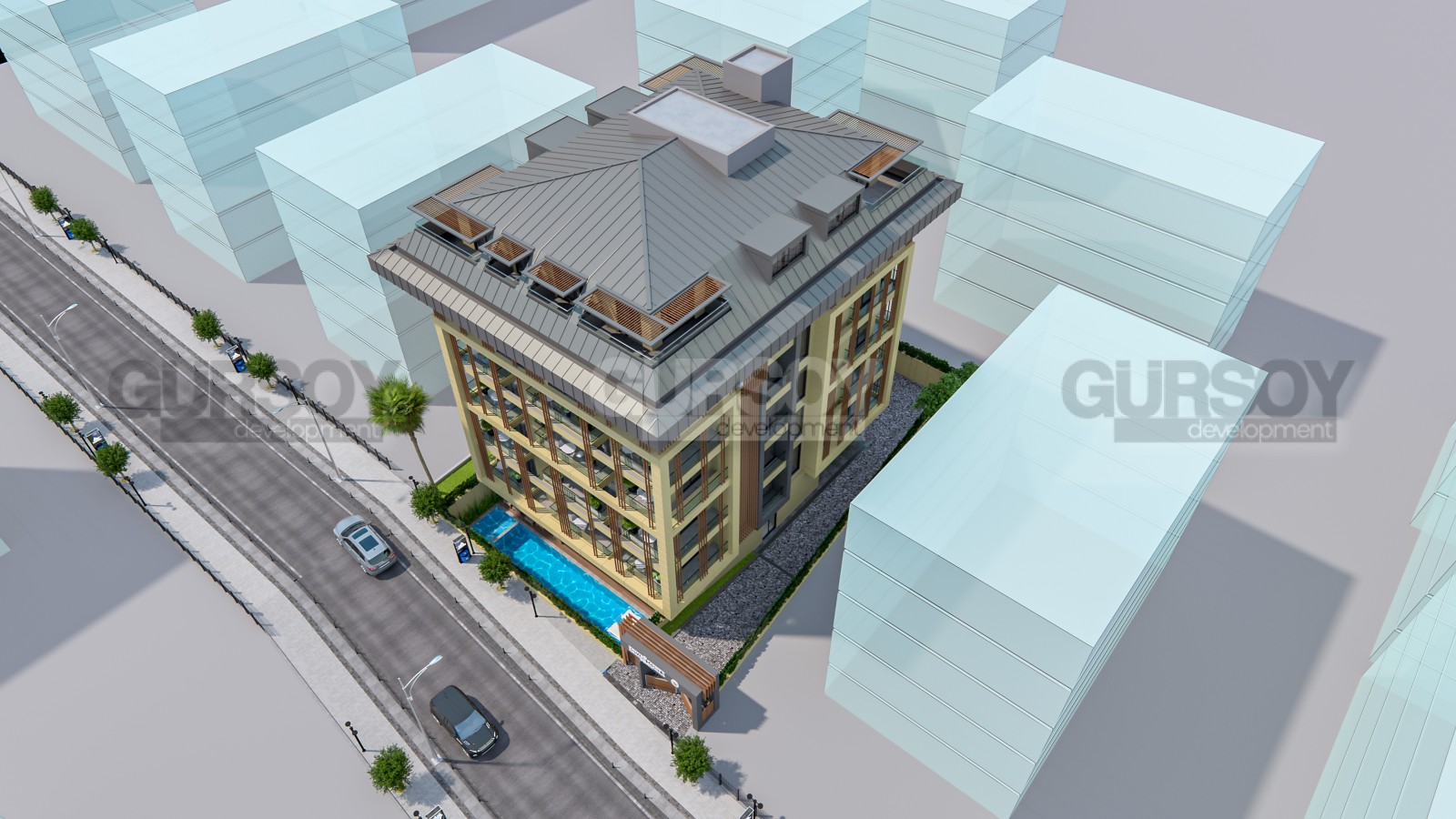 Комплекс расположен на земельном участке площадью 763,03 м² и состоит из одного 5-этажного блока. На территории комплекса: открытый бассейн площадью 25 м², сауна, тренажерный зал и парковка на 13 мест. Для безопасности жильцов юудут установлены камеры видеонаблюдения, а также предусмотрен генератор, обеспечивающий бесперебойную работу всех систем в случае непредвиденных ситуаций. Для удобства жителей также будет открыто лобби-кафе, где можно отдохнуть или встретиться с соседями.